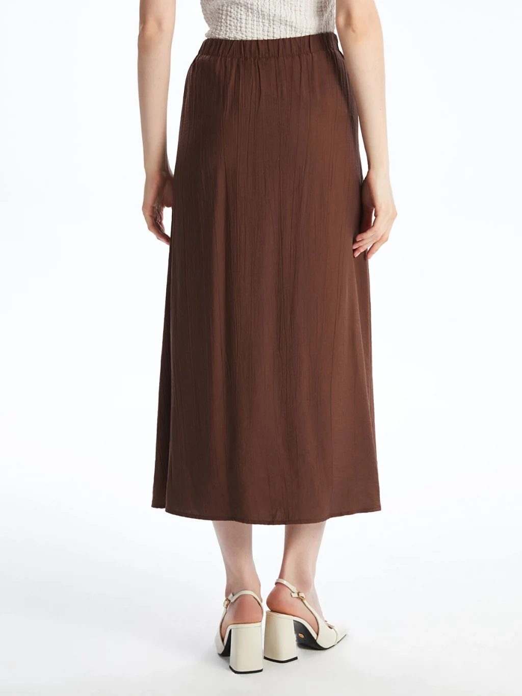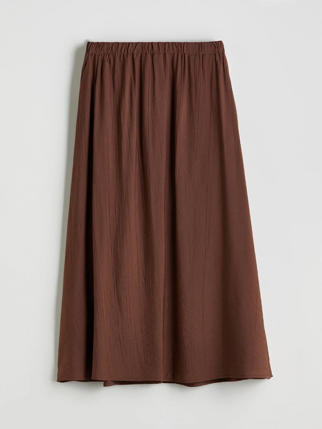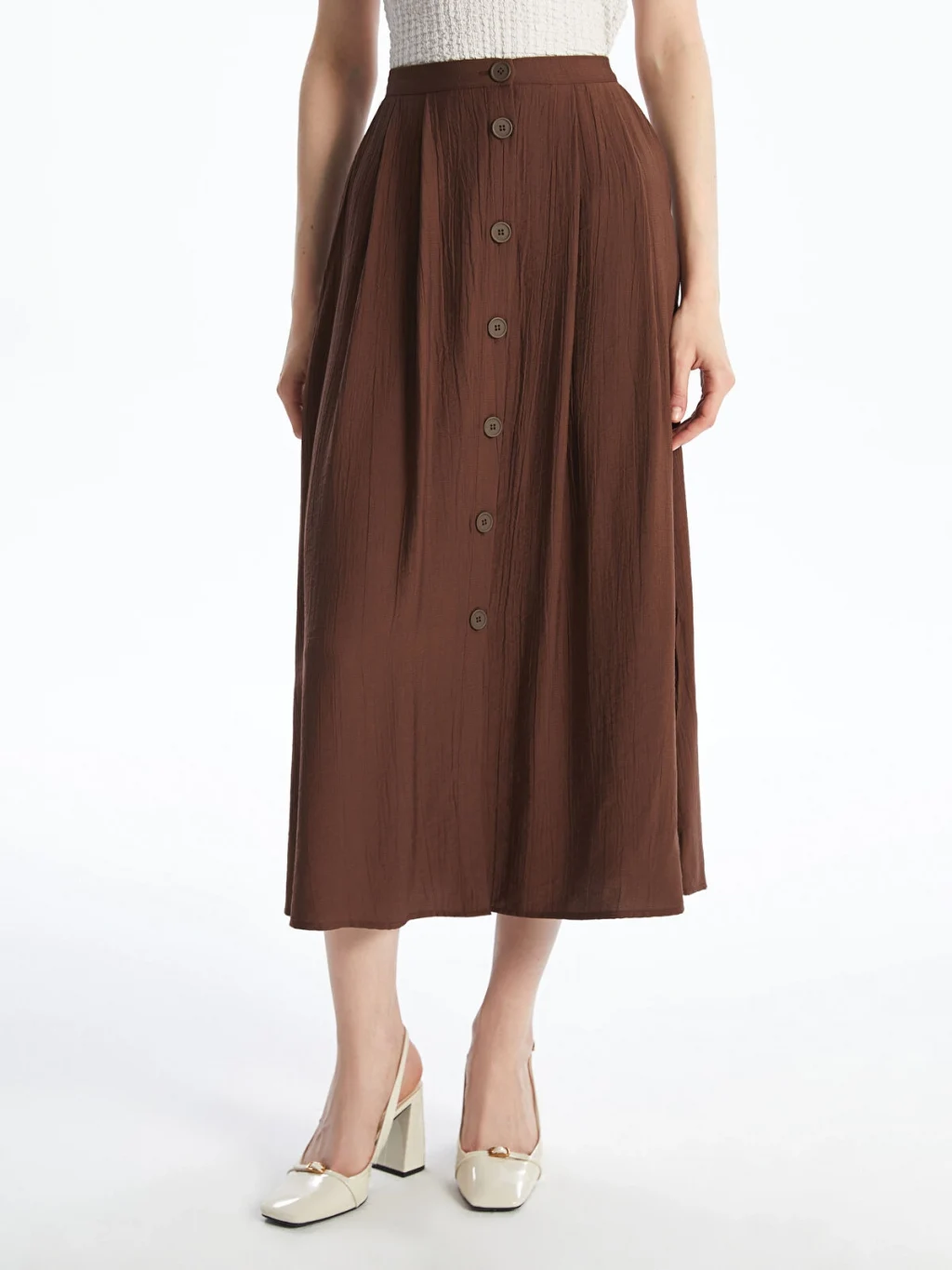 Beli lastikli dokulu pileli etek, krinkle kumaştan üretilmiştir. Önü düğmeli ve iki yandan cepli olarak tasarlanmıştır.