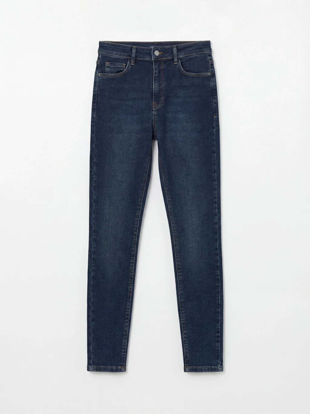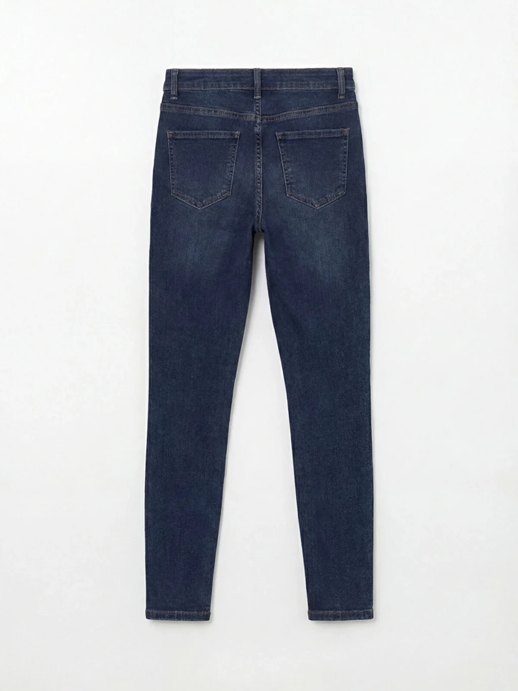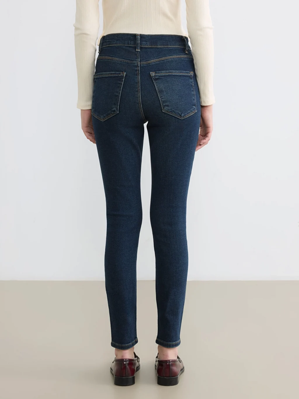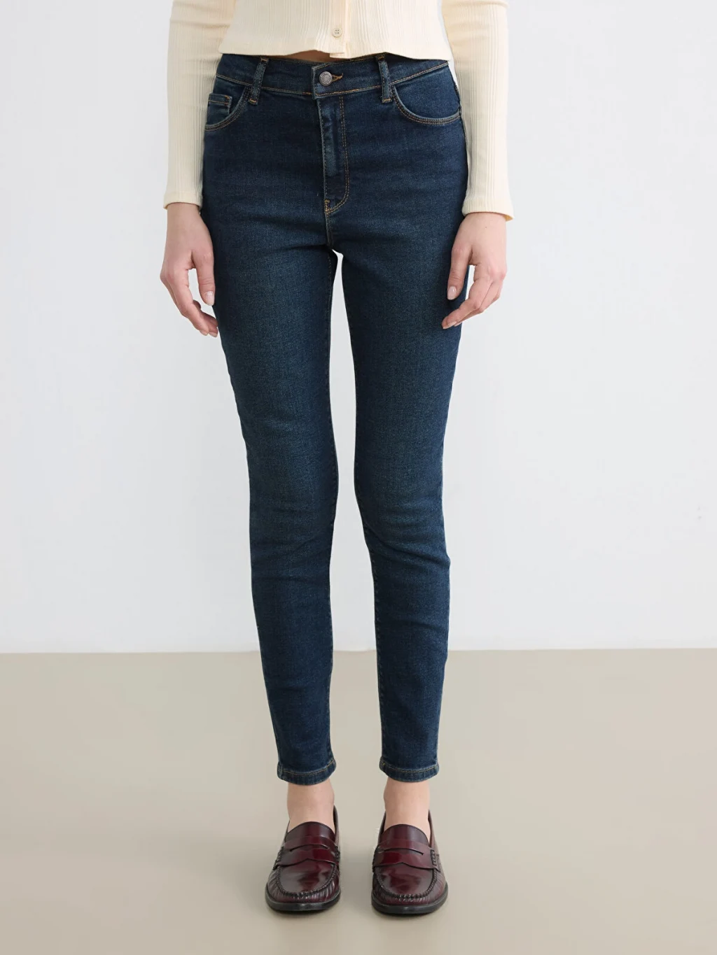 Yüksek bel, ekstra dar kalıplı kadın jean pantolon, pamuklu denim kumaştan üretilmiştir. Beş cepli tasarıma sahiptir ve fermuar ile düğme kapamalıdır.