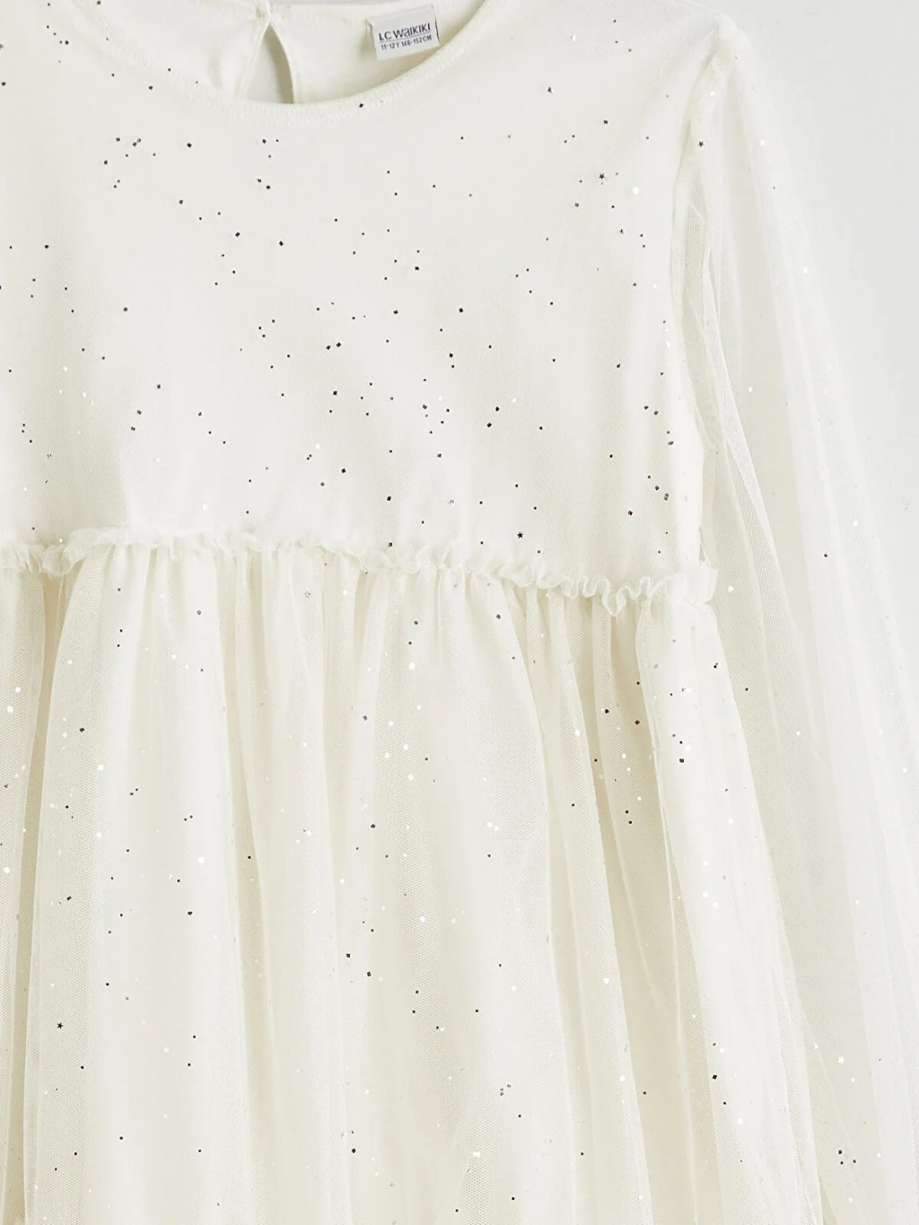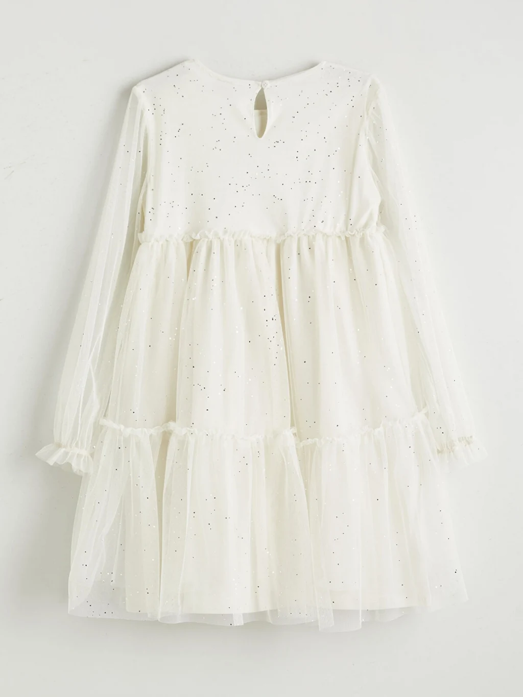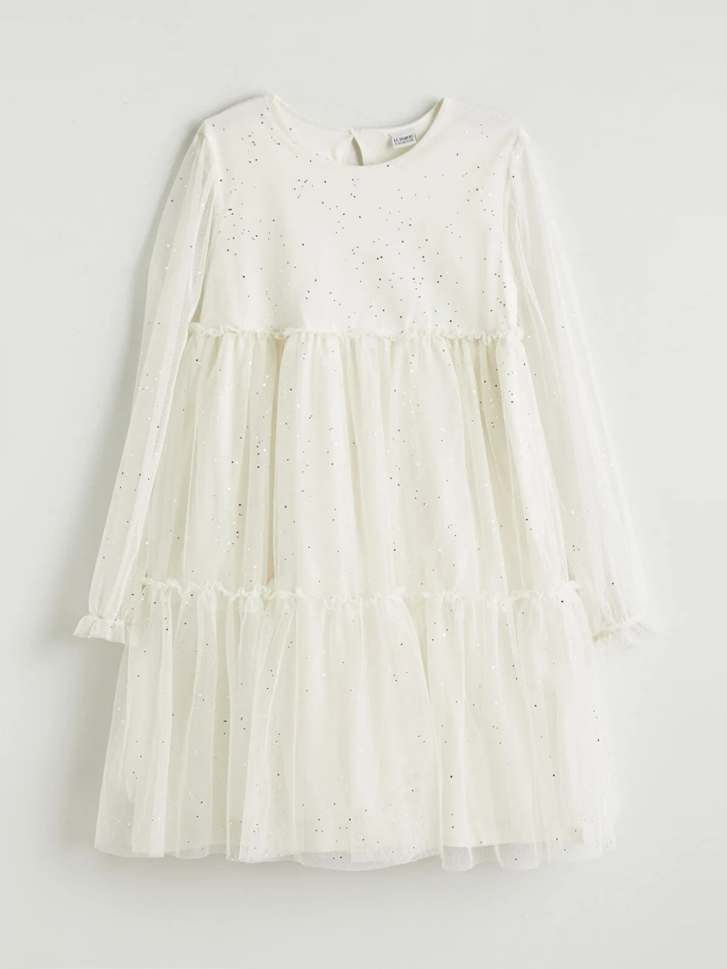Bisiklet yaka, uzun kollu kız çocuk elbisesi, simli desene sahiptir. Katlı etekli modelin kol uçları gipeli, ensesi düğme kapamalıdır.