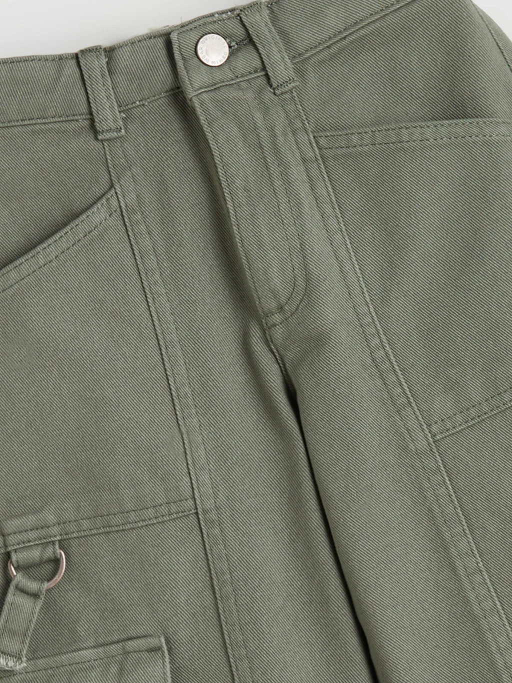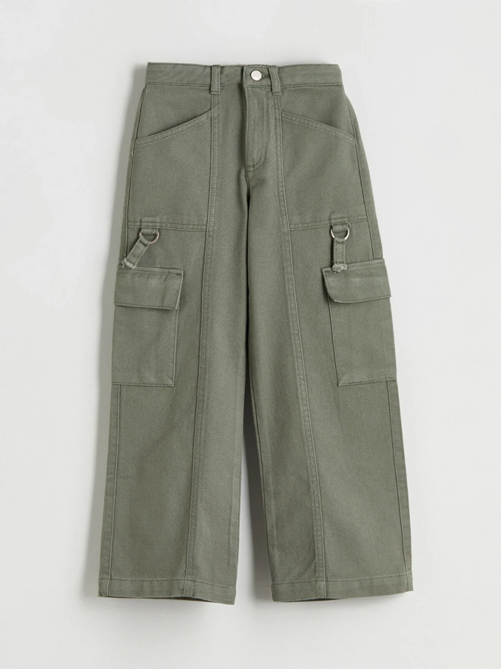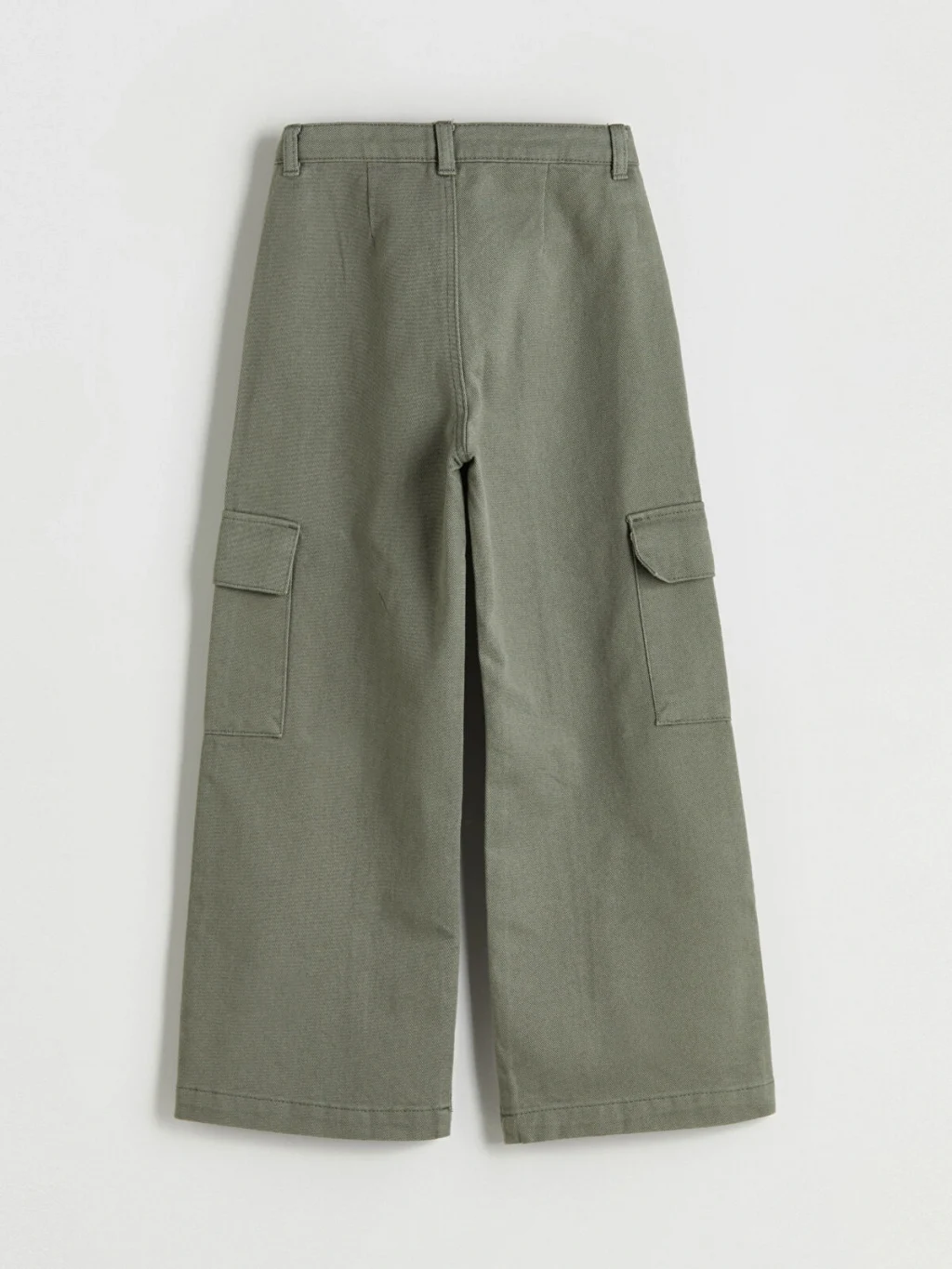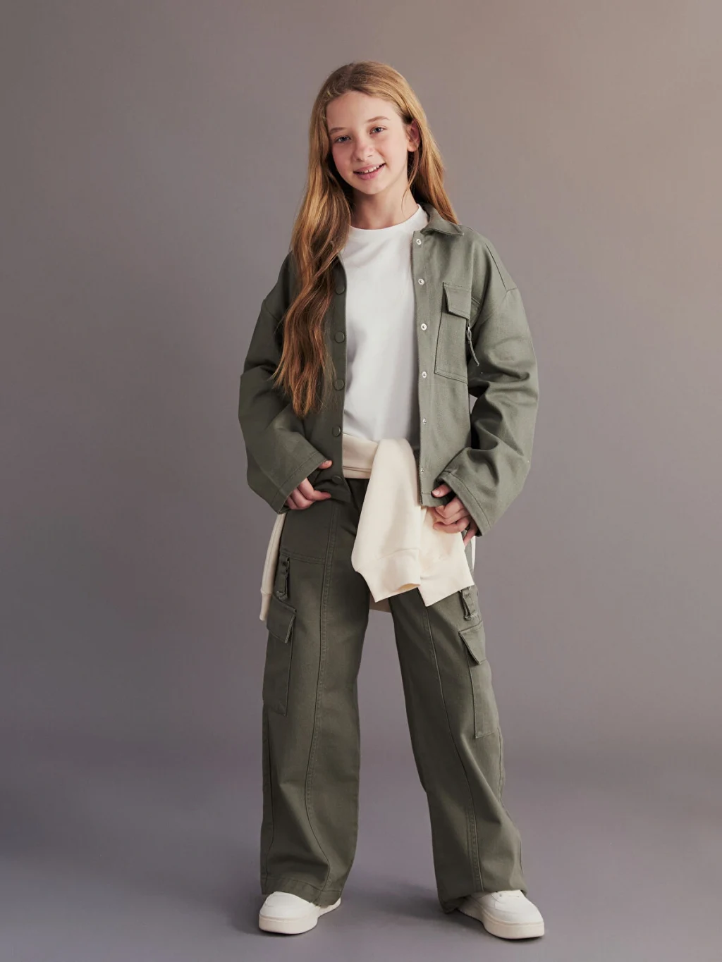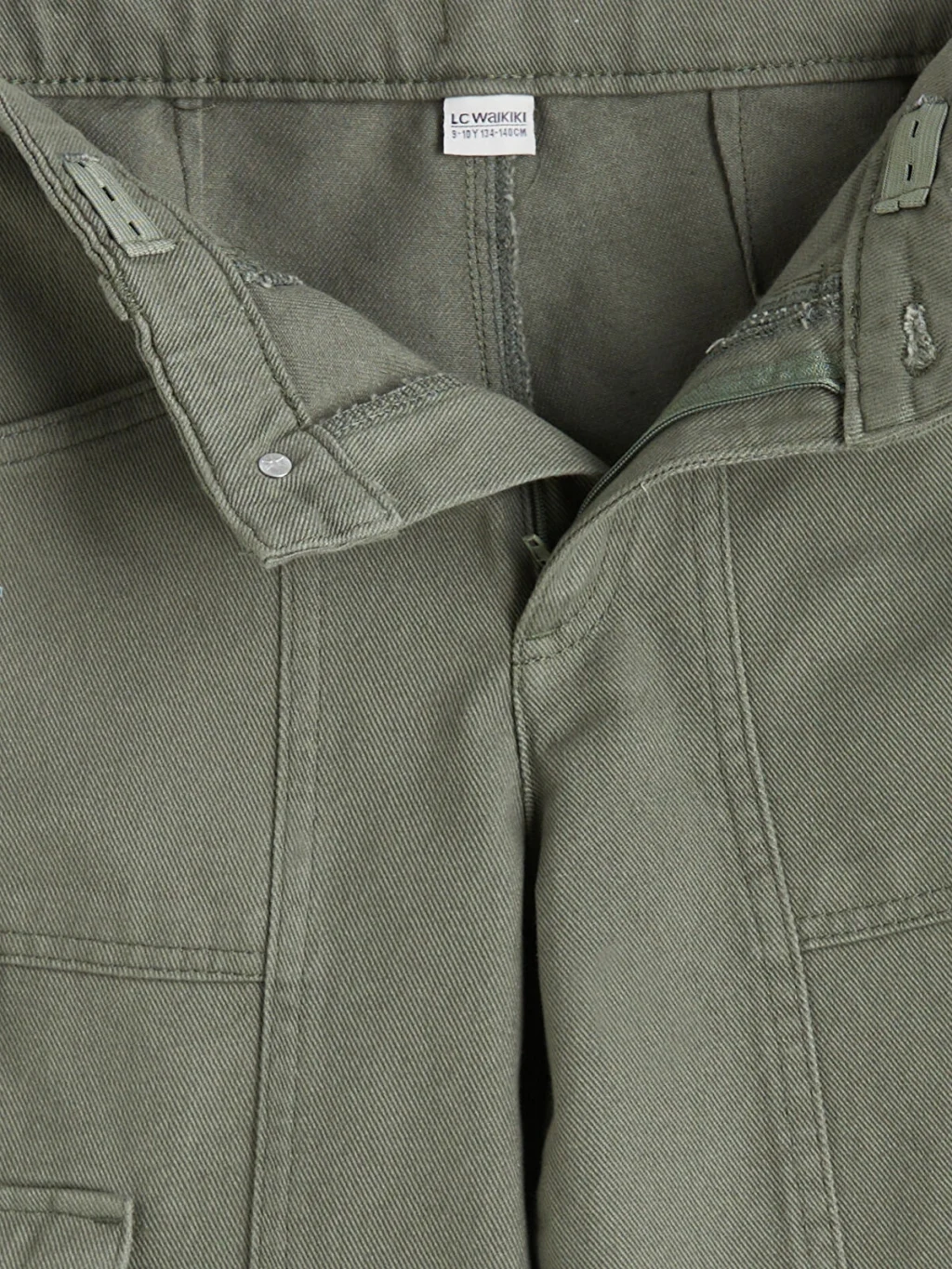 Standart kalıp kız çocuk pantolon, %100 pamuklu gabardin kumaştır. Geniş paçalıdır, fermuar ve düğme kapamalıdır ve kapaklı kargo ceplere sahiptir.