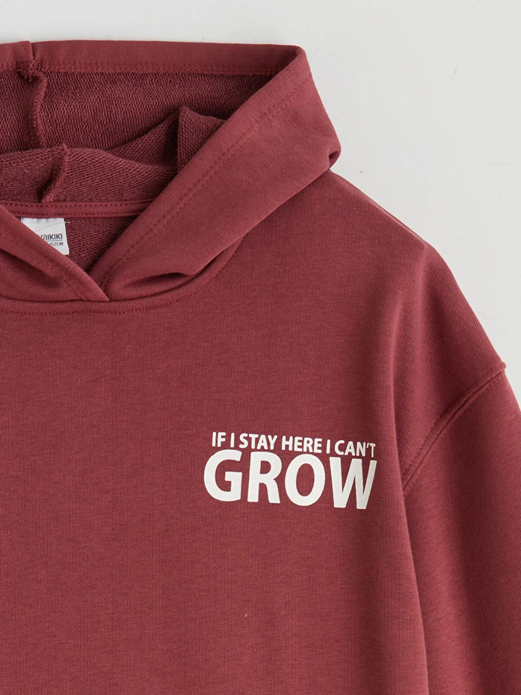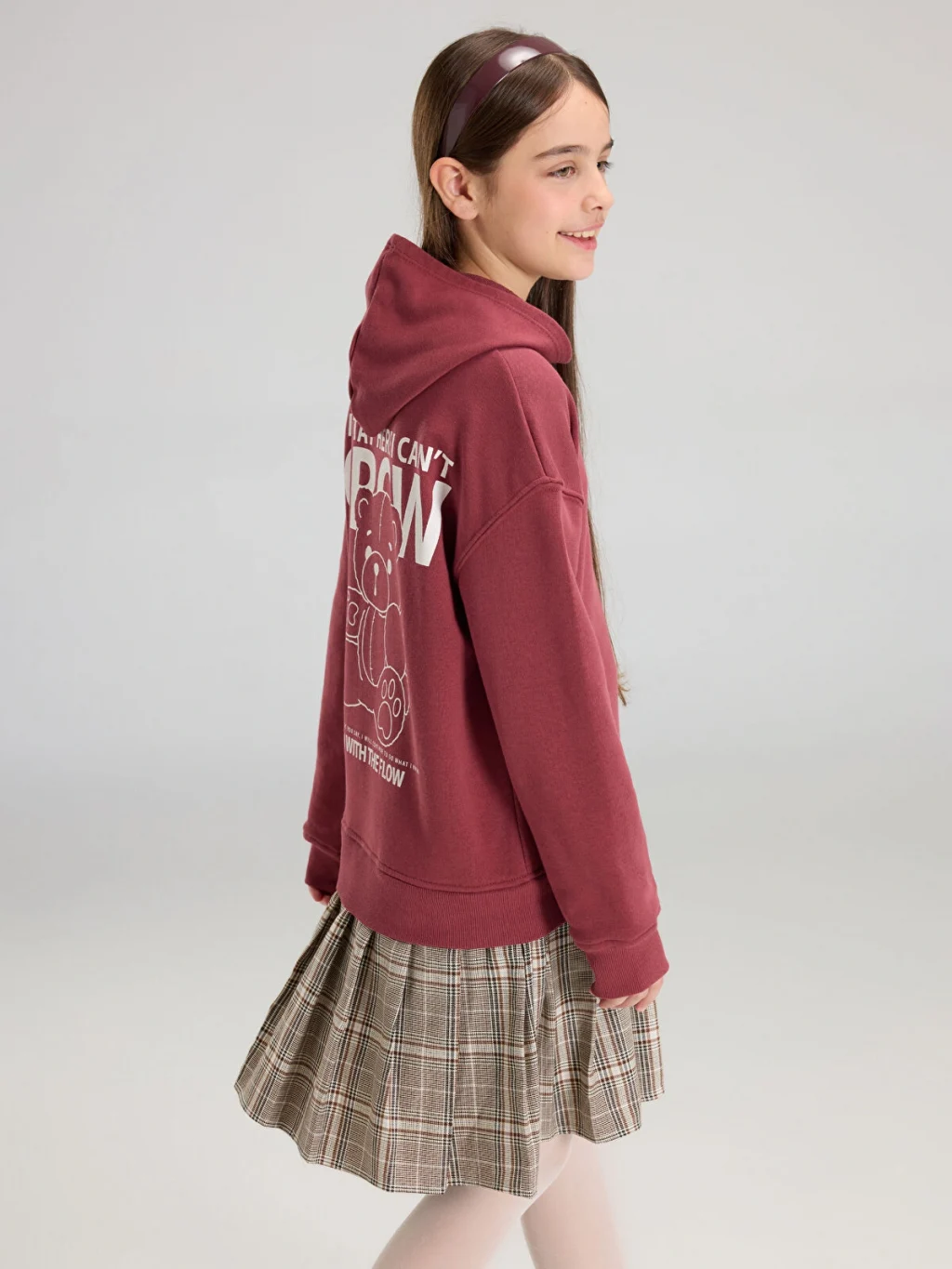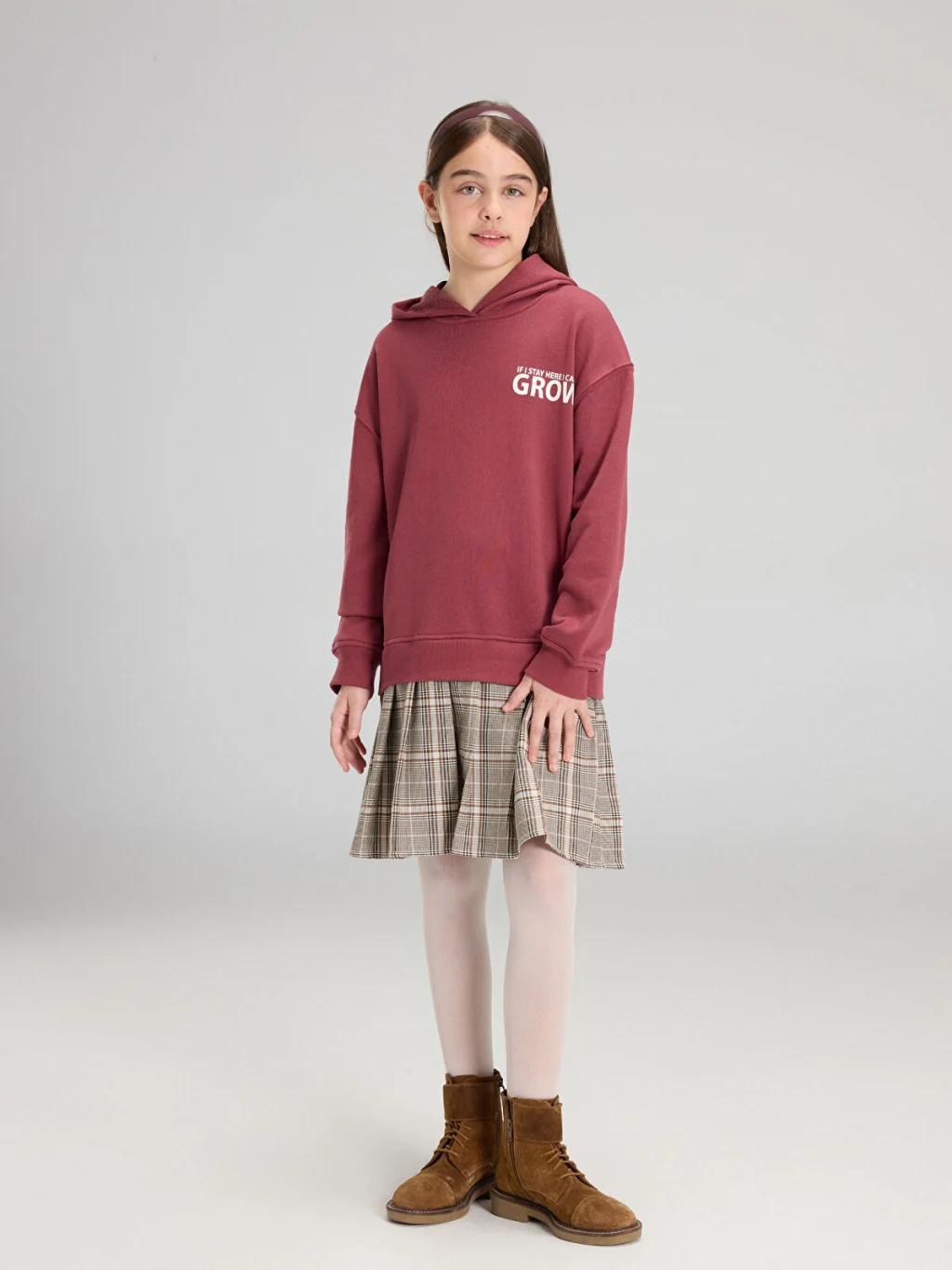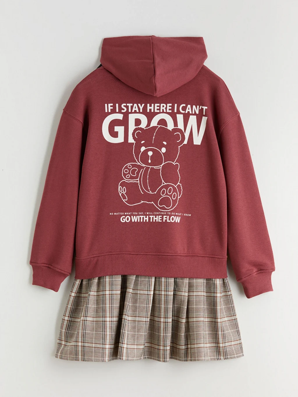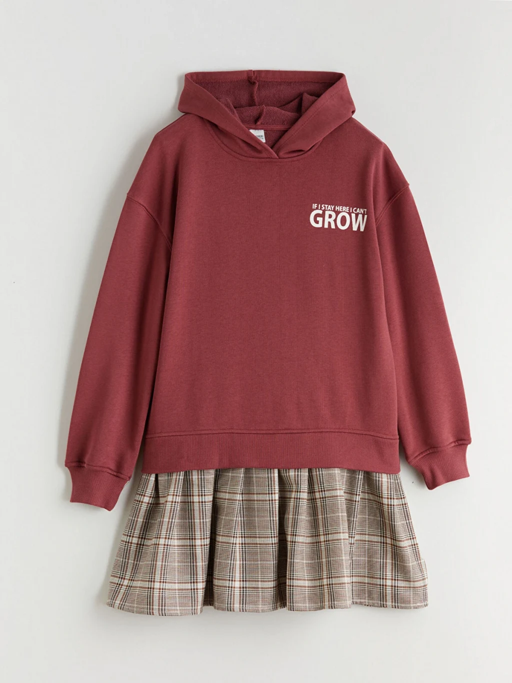 Kapüşonlu ve uzun kollu tasarıma sahip elbise, 3 iplik kumaştan üretilmiştir. Ön ve arka kısmında baskı detayı bulunur. Eteği pileli ve ekose tasarımlıdır.