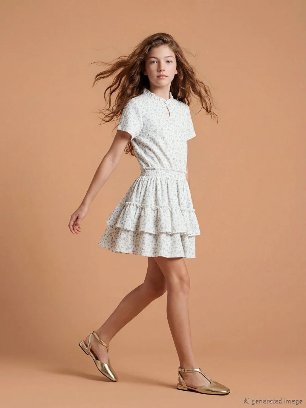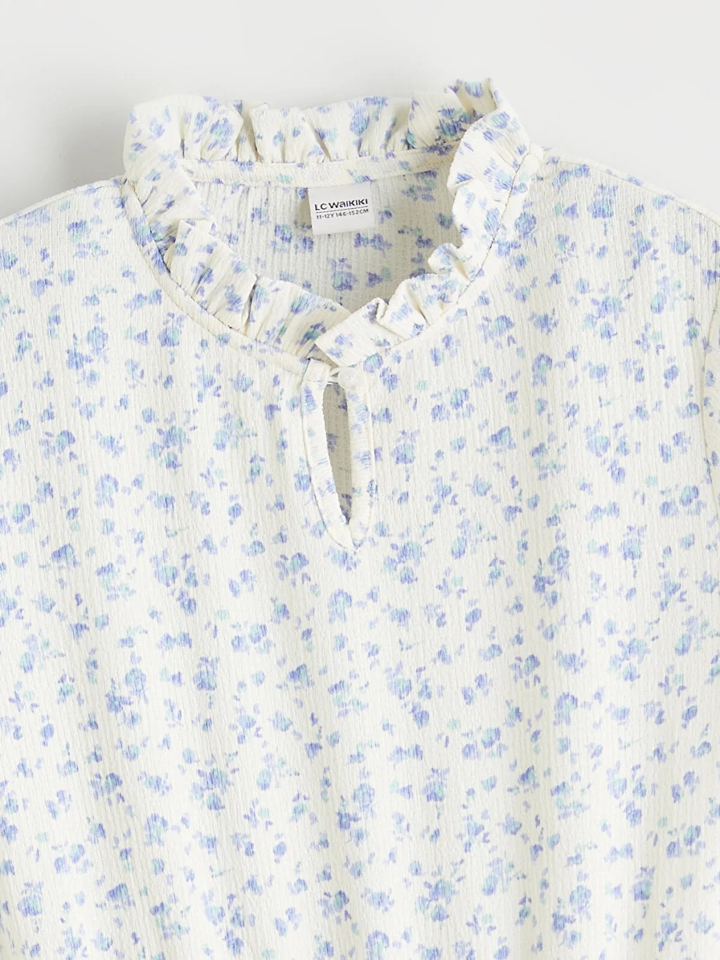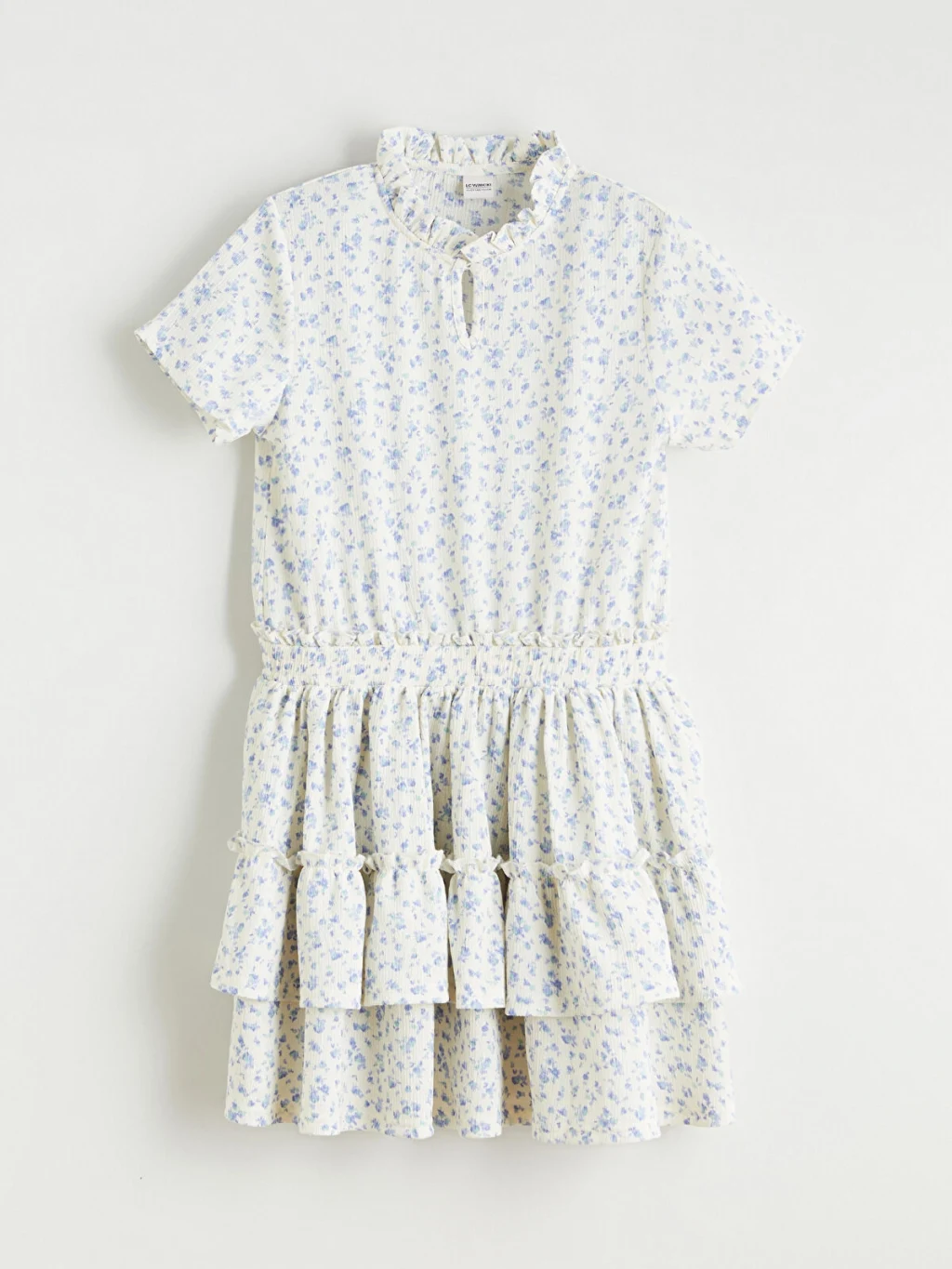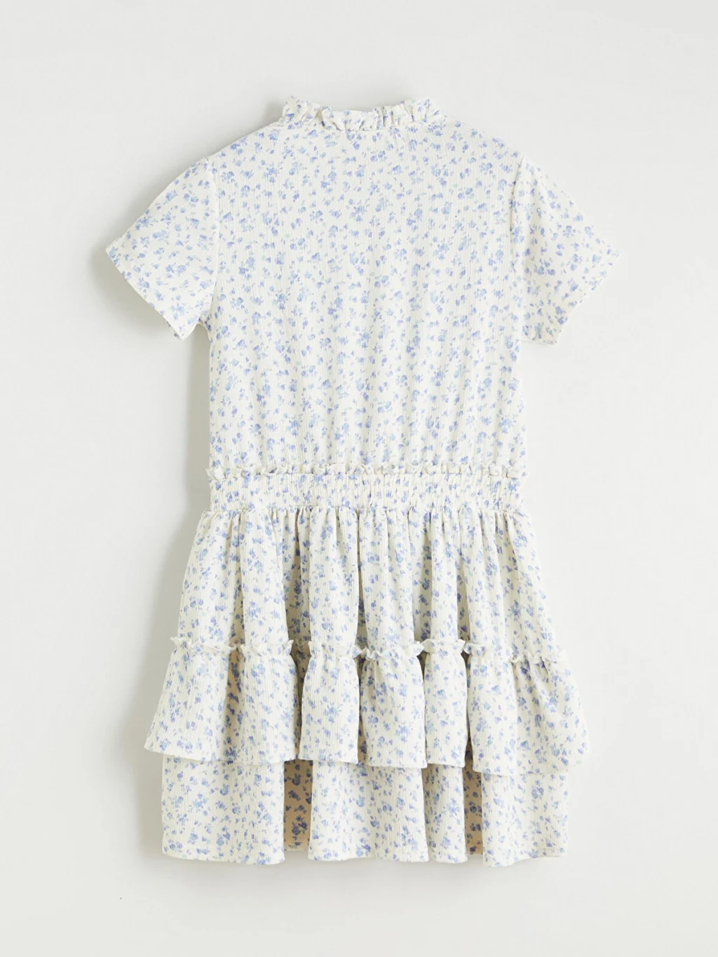 Desenli, fırfırlı dik yakalı ve kısa kollu kız çocuk elbisenin beli lastikli, etek ucu ise kat kat fırfırlıdır.