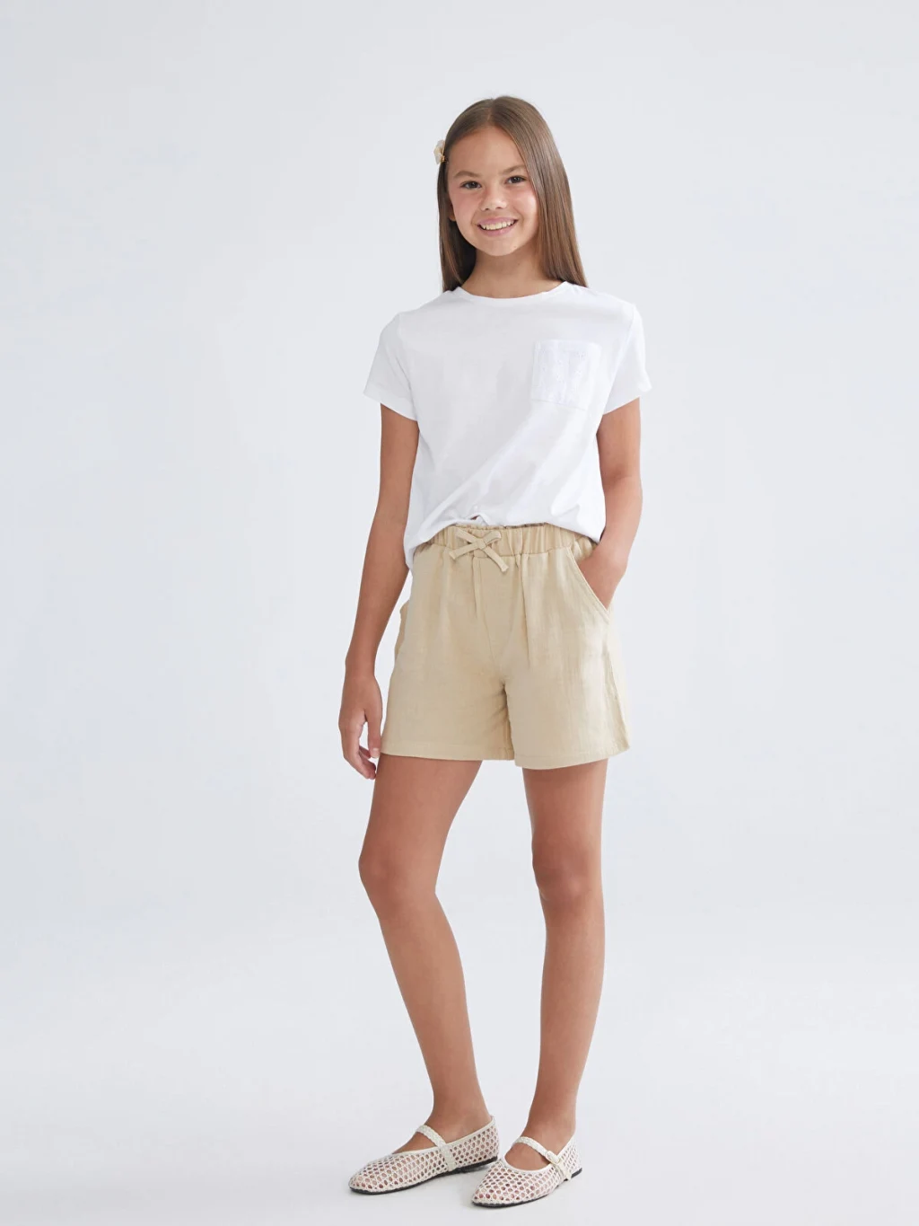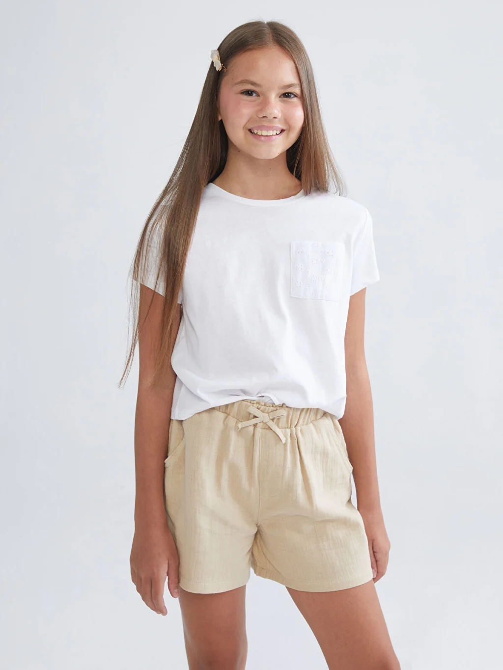 Yüksek pamuk içerikli müslin kumaştan üretilen kız çocuk şort, beli lastikli ve bağcık detaylıdır. Önü ceplidir.