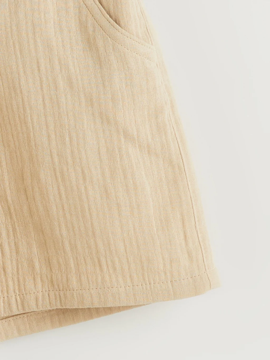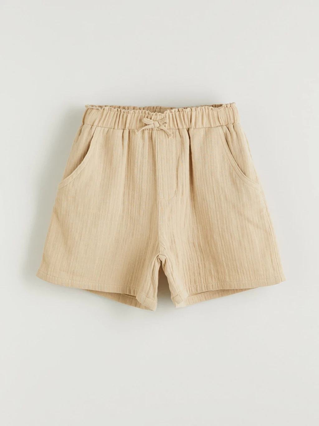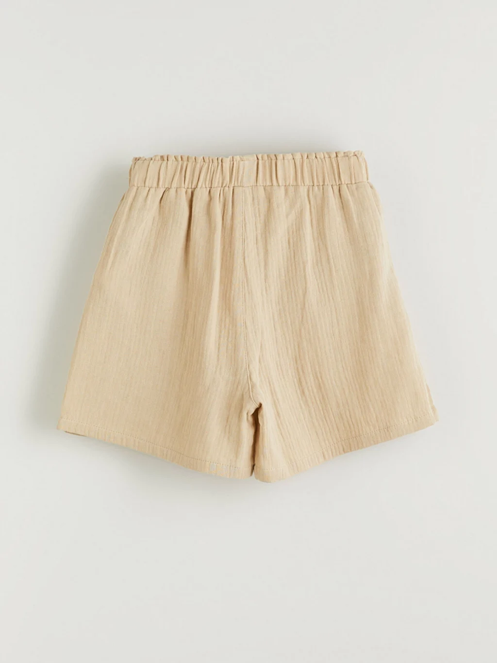 Yüksek pamuk içerikli müslin kumaştan üretilen kız çocuk şort, beli lastikli ve büzgülüdür. Yan cepleri ve önden bağlama detayı bulunur.