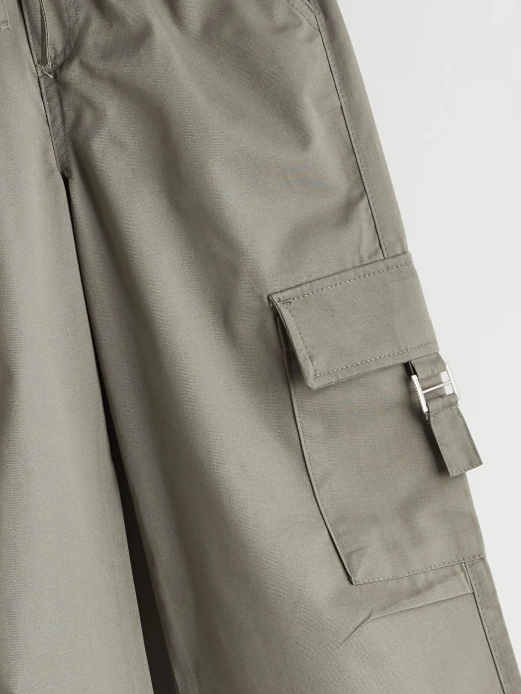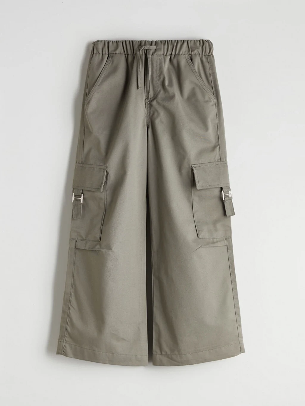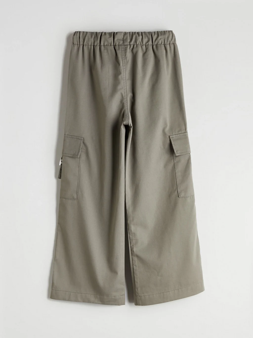 Beli lastikli ve bağcıklı kız çocuk pantolon, gabardin kumaştan üretilmiştir. Yan cepleri ve kapaklı kargo cepleri bulunur.