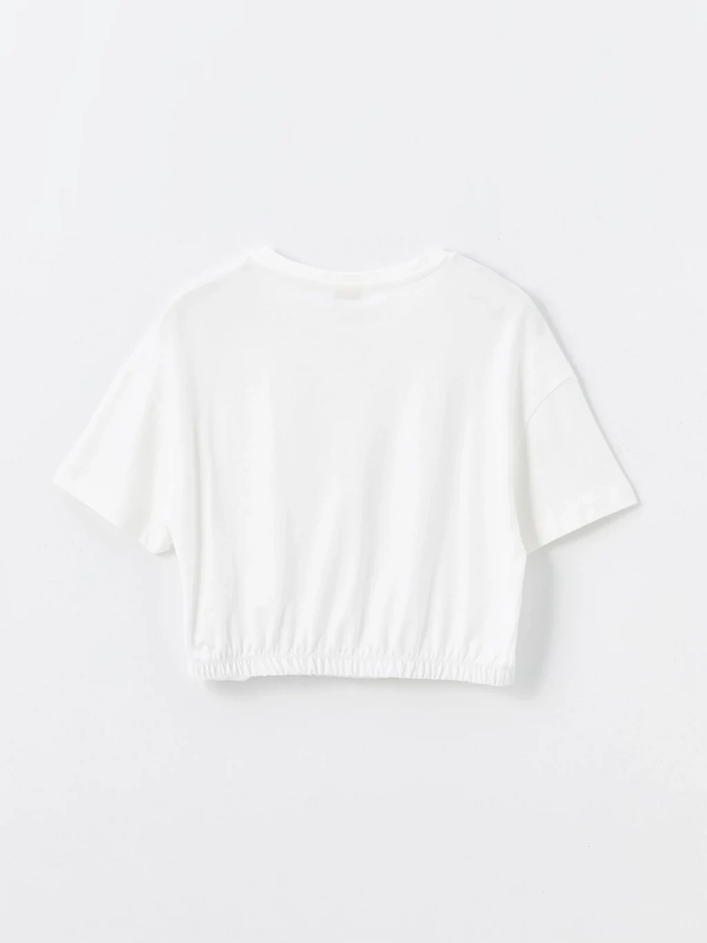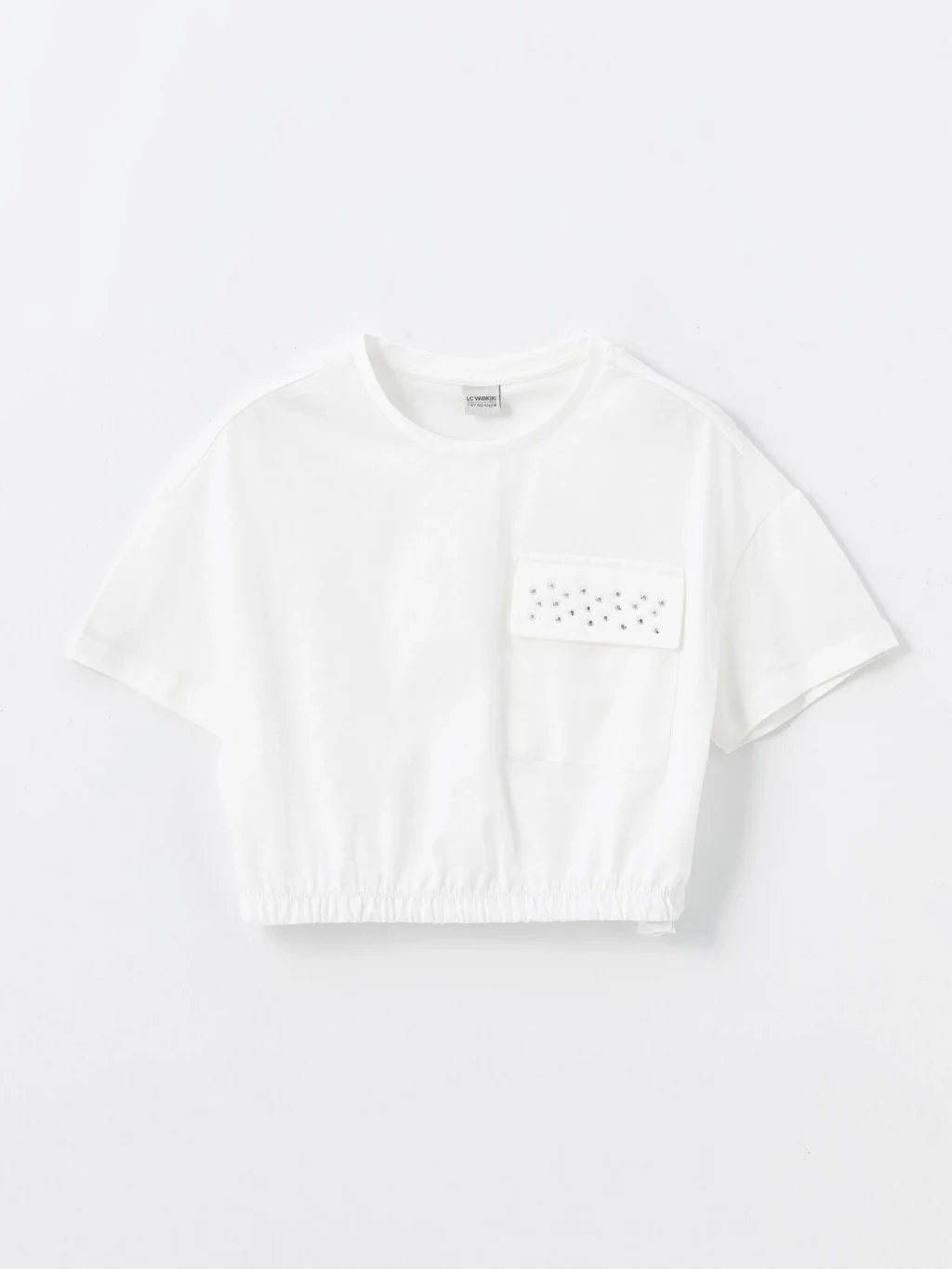%100 pamuklu penye kumaştan üretilen kız çocuk tişört, bisiklet yaka ve kısa kolludur. Taş işlemeli tek ceplidir ve etek ucu lastiklidir.