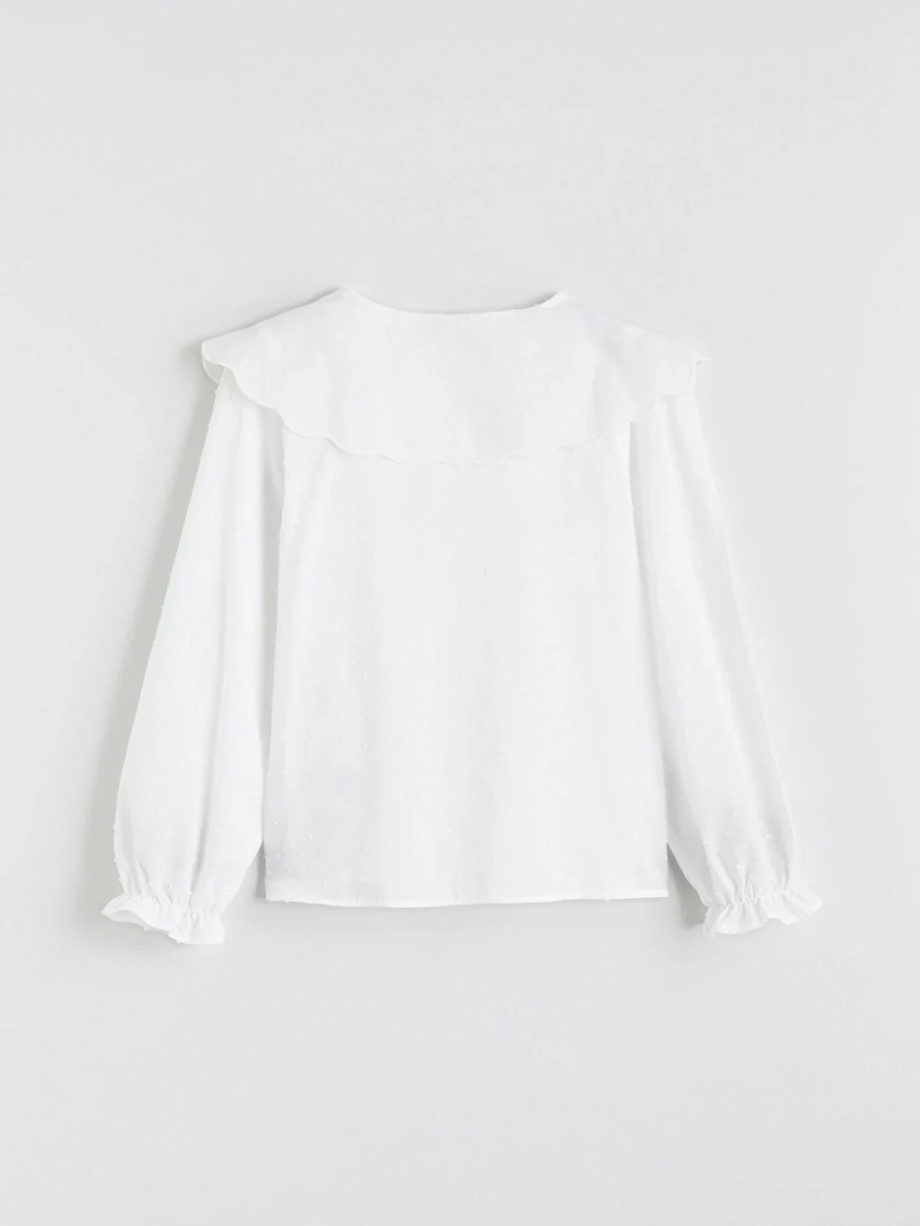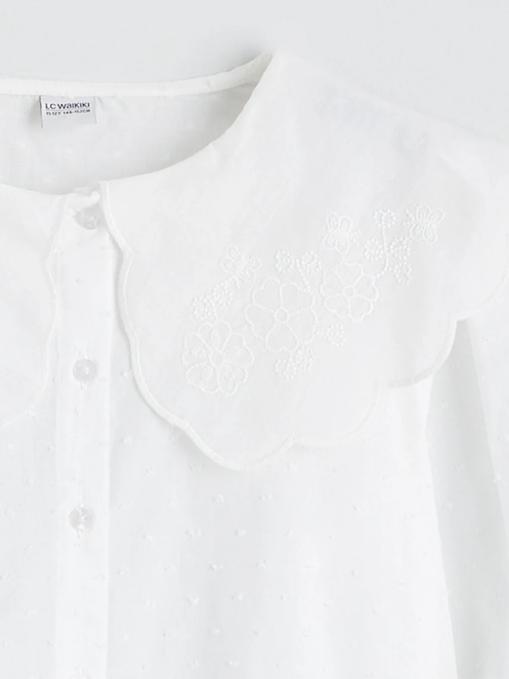 Kız çocuk gömlek, %100 pamuklu müslin kumaştan üretilmiştir. Geniş ve işlemeli bebe yakalı, uzun kollu, kol ucu lastikli ve önden düğme kapamalıdır.