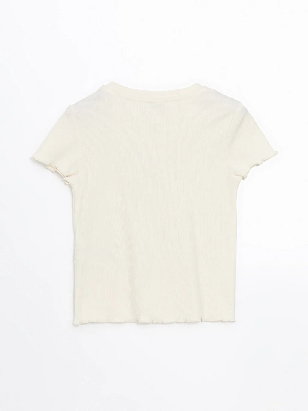 Yüksek pamuk içerikli fitilli penye kumaştan üretilen kız çocuk tişört, dar kalıplıdır. Bisiklet yakalı, kısa kollu ürünün önünde çiçek aplikesi bulunur.