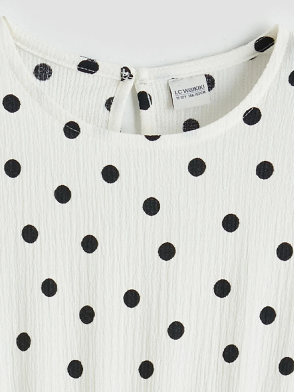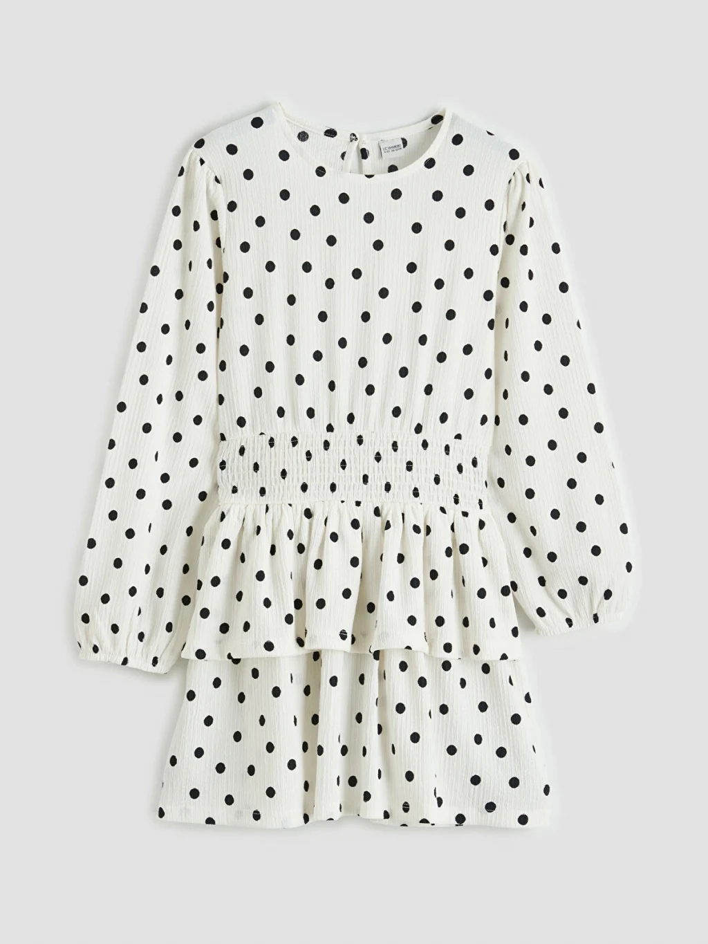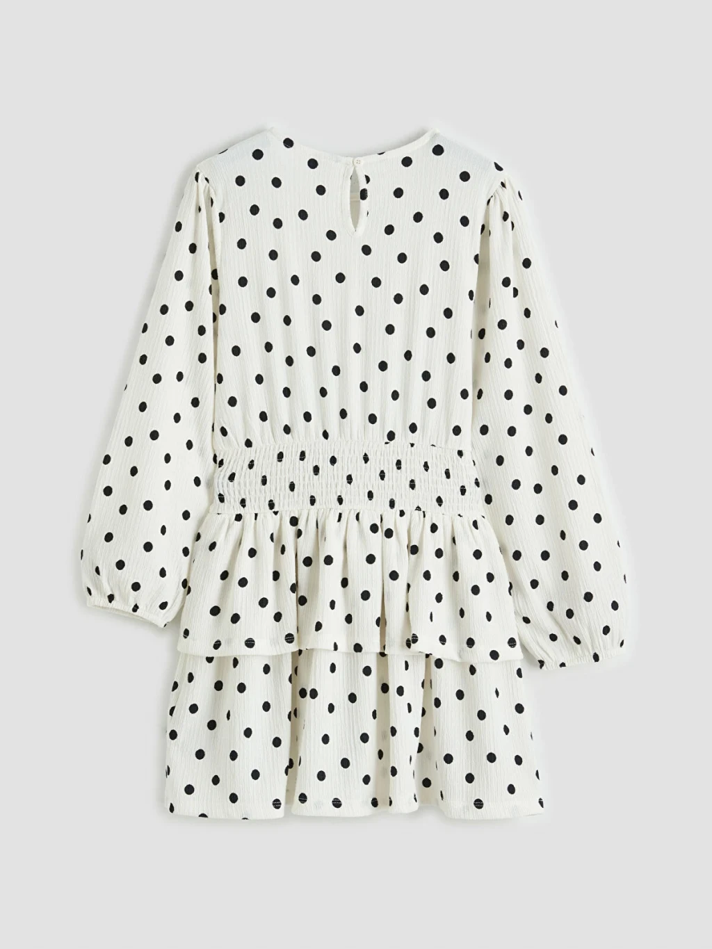 Bisiklet yaka ve uzun kollu kız çocuk elbise, puantiyeli desene sahiptir. Beli gipeli olup etek ucu katlı ve fırfırlıdır. Ensede düğme kapaması bulunur.