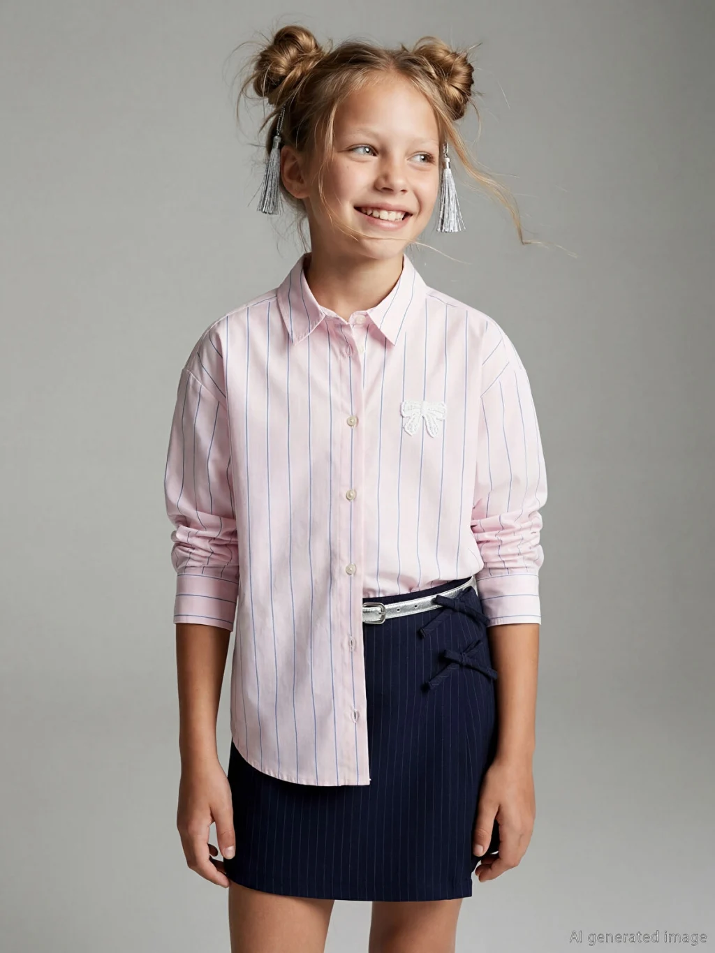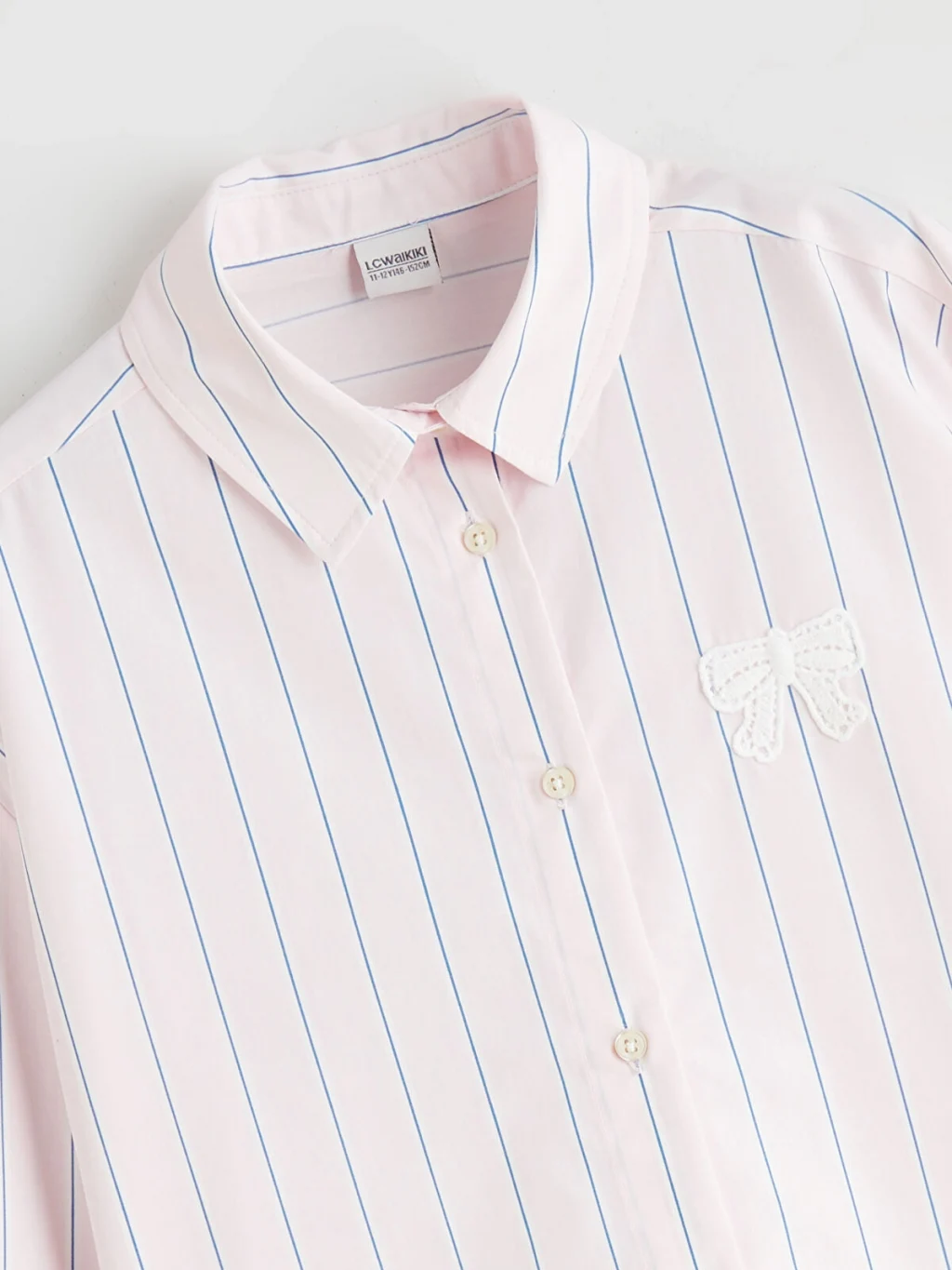 Uzun kollu, çizgili desenli ve göğsü fiyonk işlemeli kız çocuk gömlek, %100 pamuklu poplin kumaştan üretilmiştir. Önden düğme kapamalıdır.