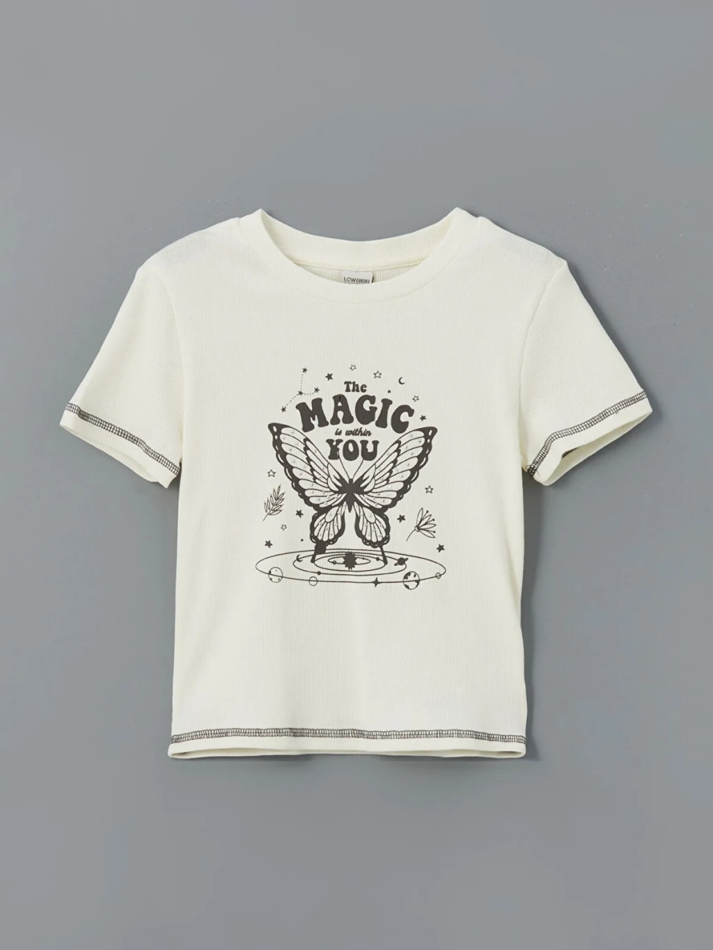 Dar kalıplı kız çocuk tişört, yüksek pamuk içerikli kaşkorse kumaştan üretilmiştir. Bisiklet yaka, kısa kollu ve önü kelebek baskılıdır.