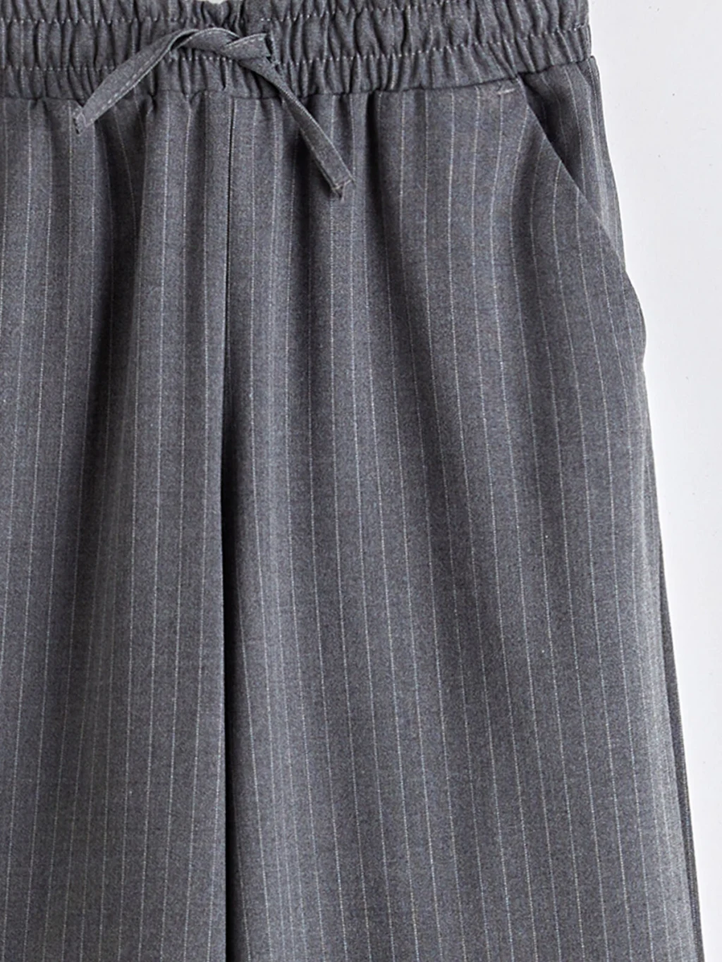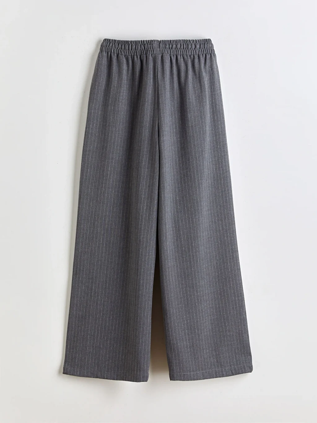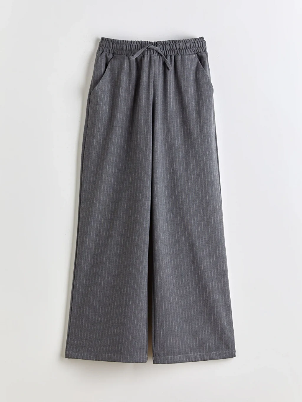 Bol kalıplı kız çocuk pantolon, poliviskon kumaştan üretilmiştir. Beli lastikli ve bağcıklı model, çizgili desene ve yan ceplere sahiptir.