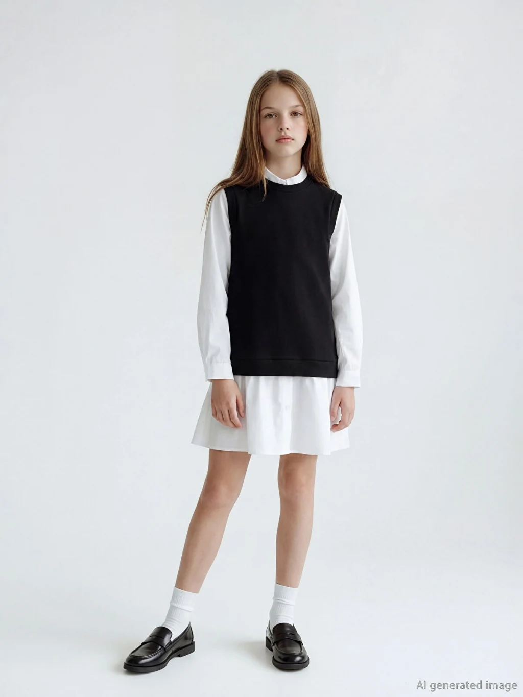 Gömlek yakalı ve uzun kollu kız çocuk elbise ve süveter, ikili takımdan oluşmaktadır. %100 pamuk poplin kumaştan üretilmiştir.