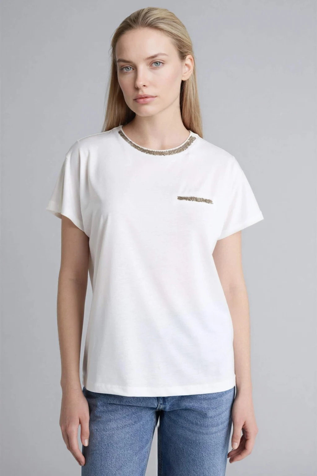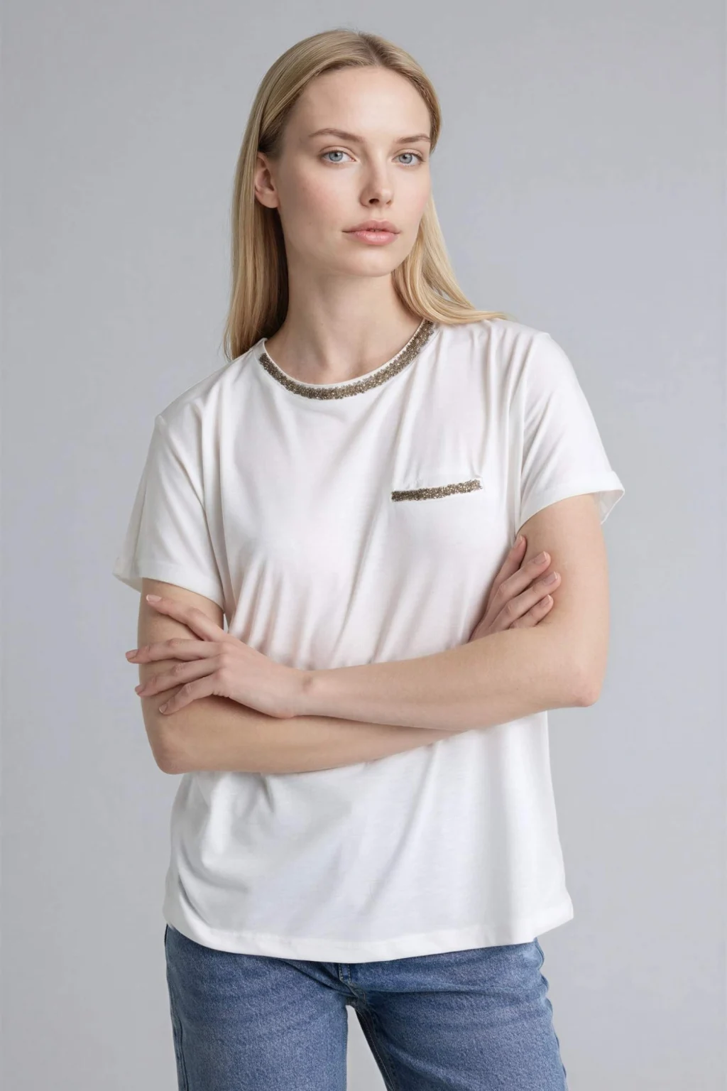 XSIDE Ekru Bisiklet Yaka Baskılı Kısa Kollu Kadın Tişört