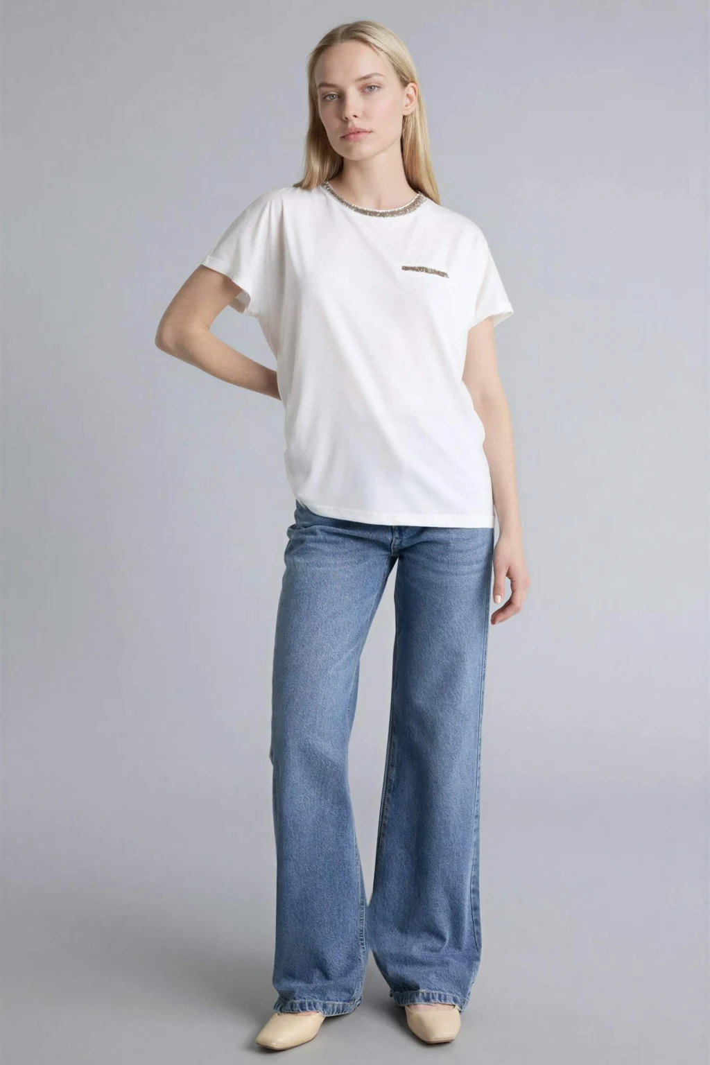 LCW Vision Beyaz Bisiklet Yaka Baskılı Kısa Kollu Kadın Tişört