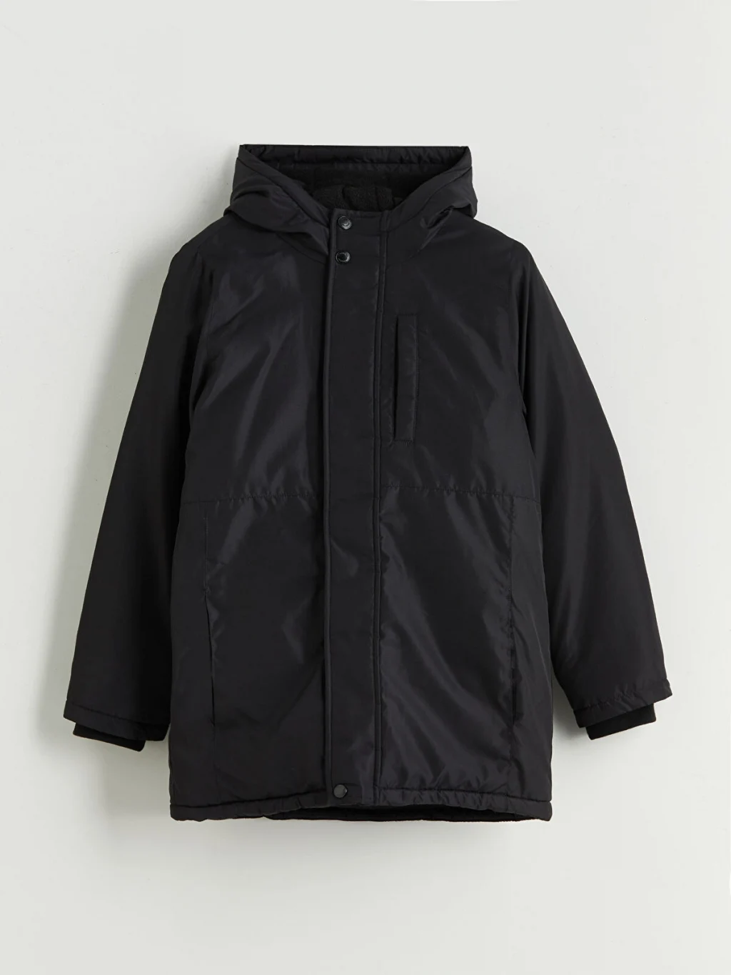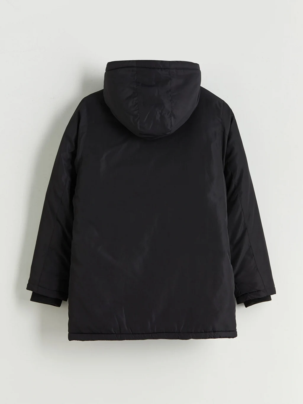 Sabit kapüşonlu erkek çocuk şişme mont, uzun kolludur. Önden fermuar ve çıtçıt kapamalıdır, cepleri bulunur ve kol uçları ribanalıdır.
