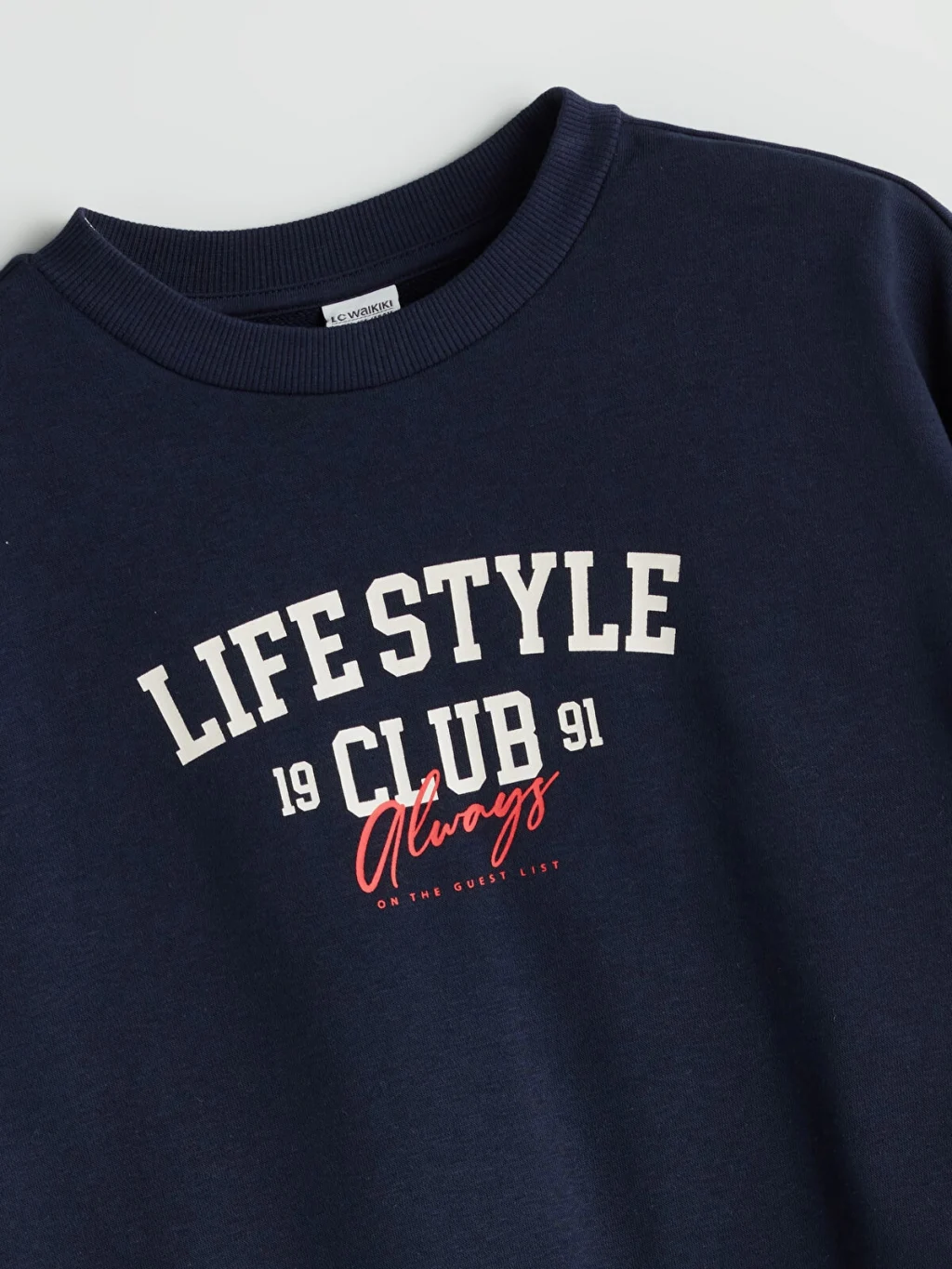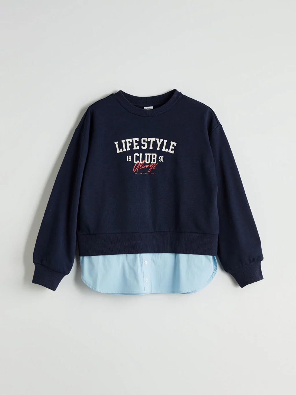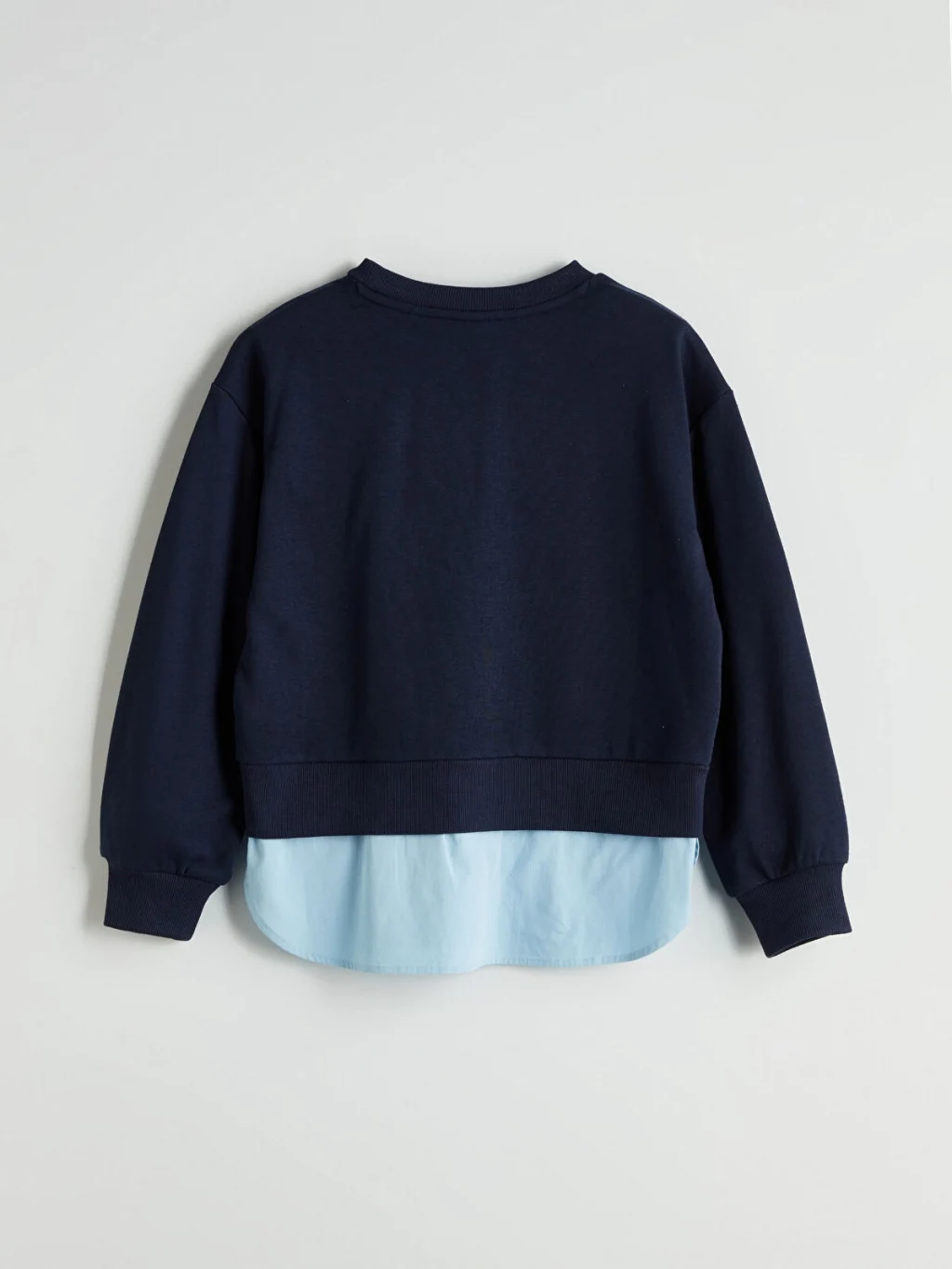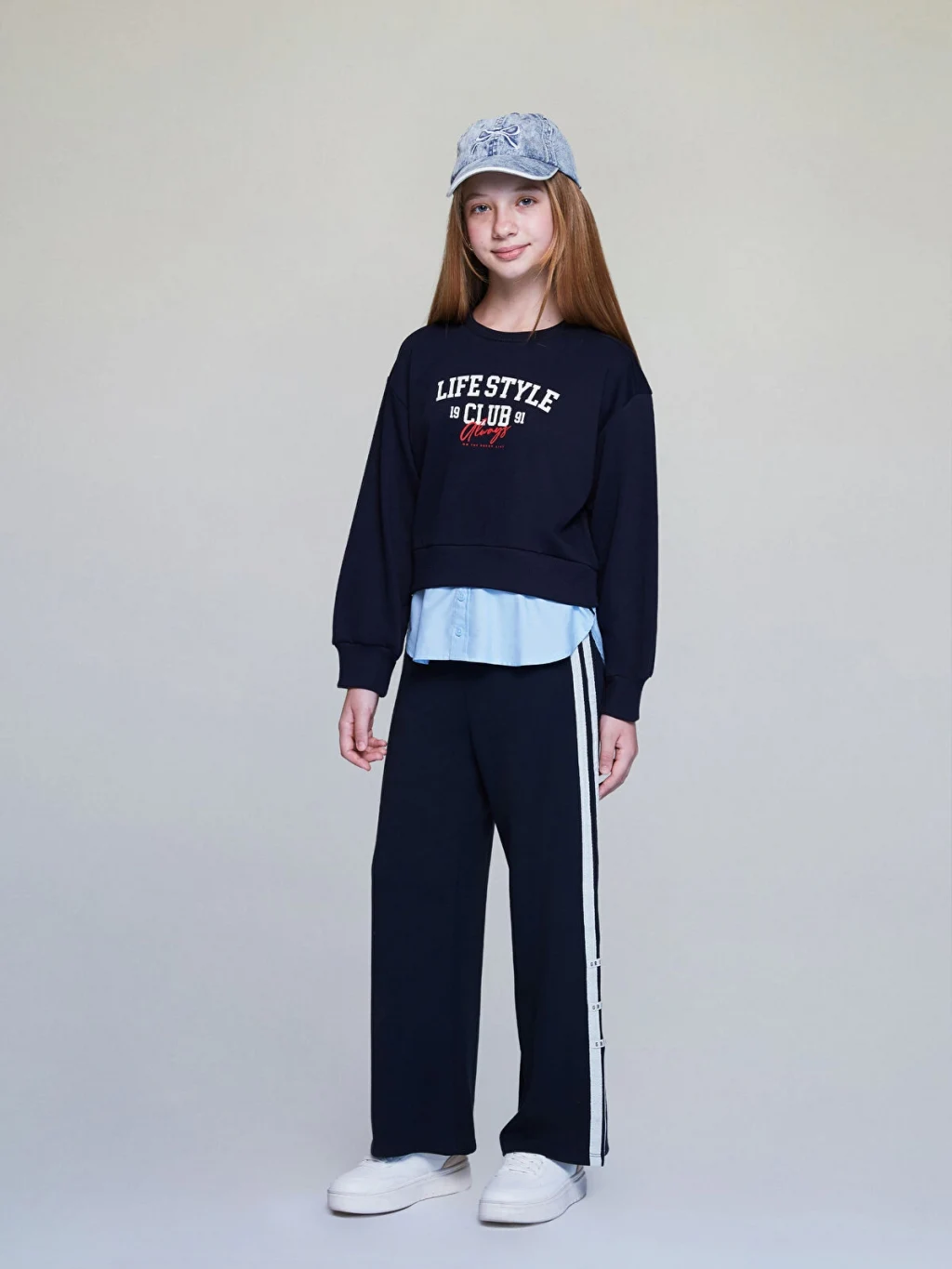 Bisiklet yaka, uzun kollu kız çocuk sweatshirt, orta kalınlıkta 3 iplik kumaştan üretilmiştir. Önü baskılıdır ve etek ucunda gömlek görünümlü detayı vardır.
