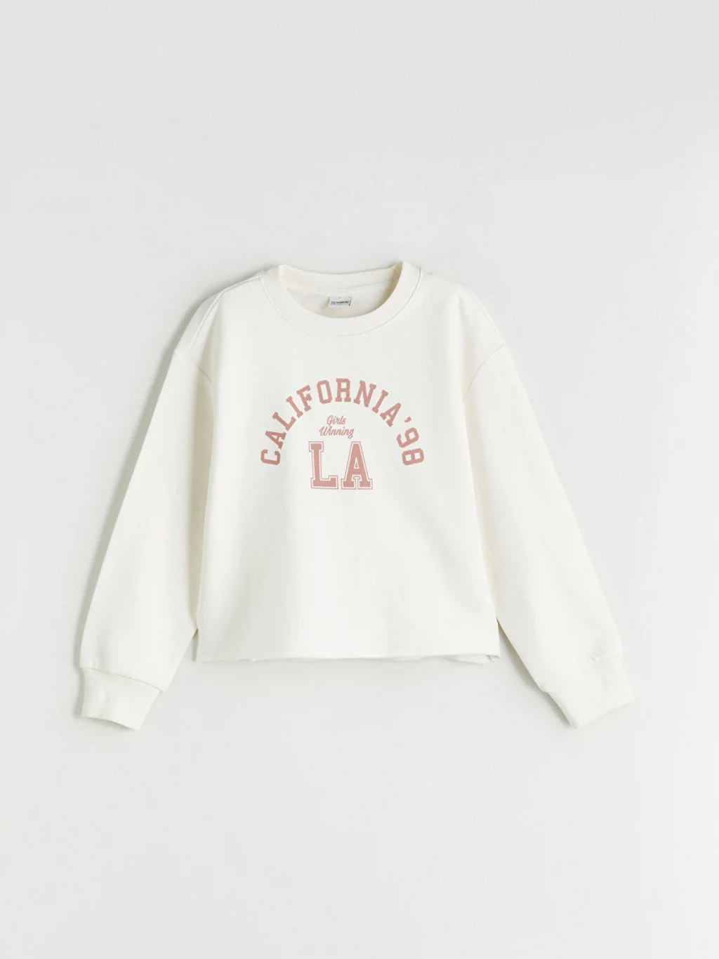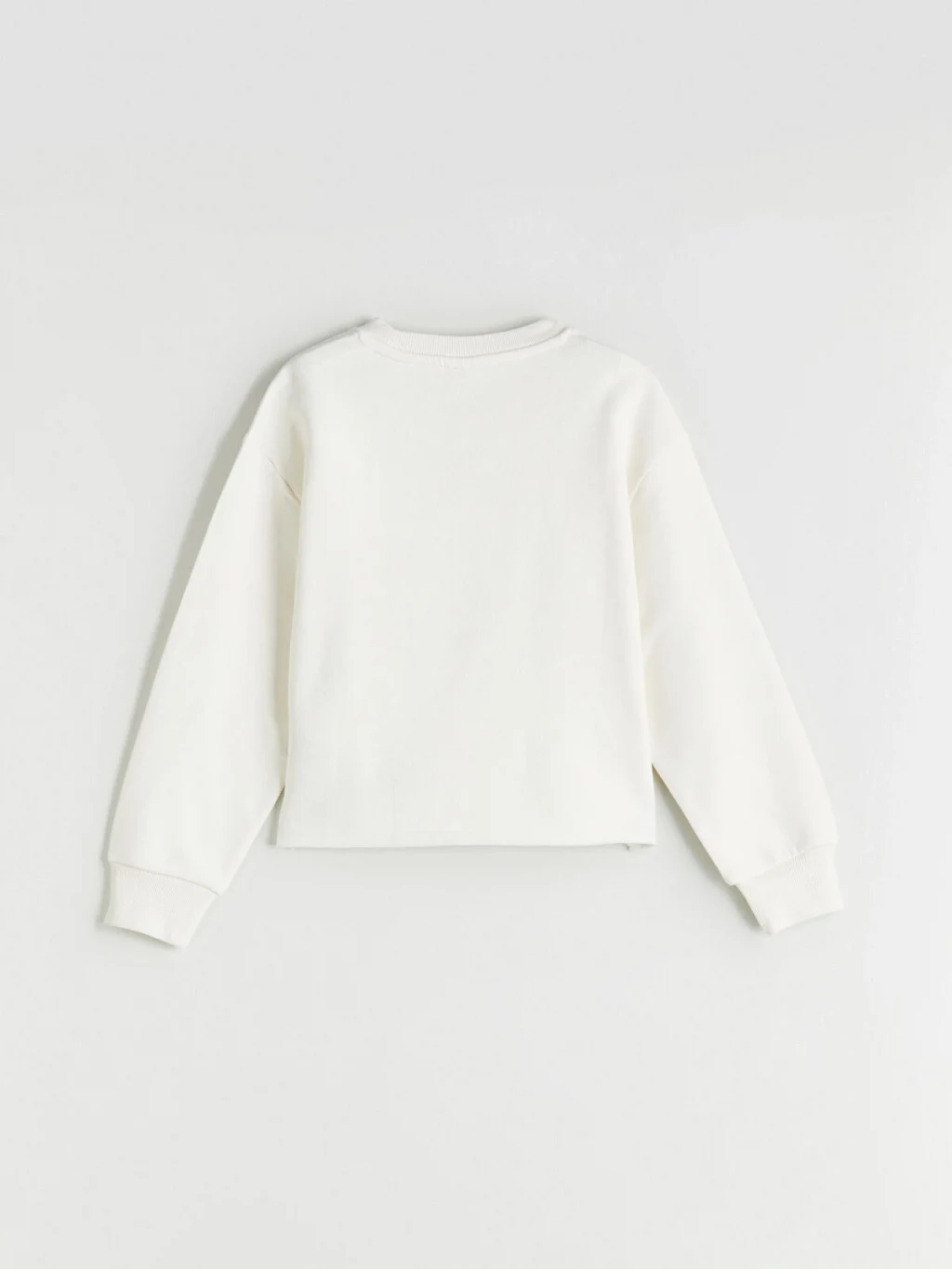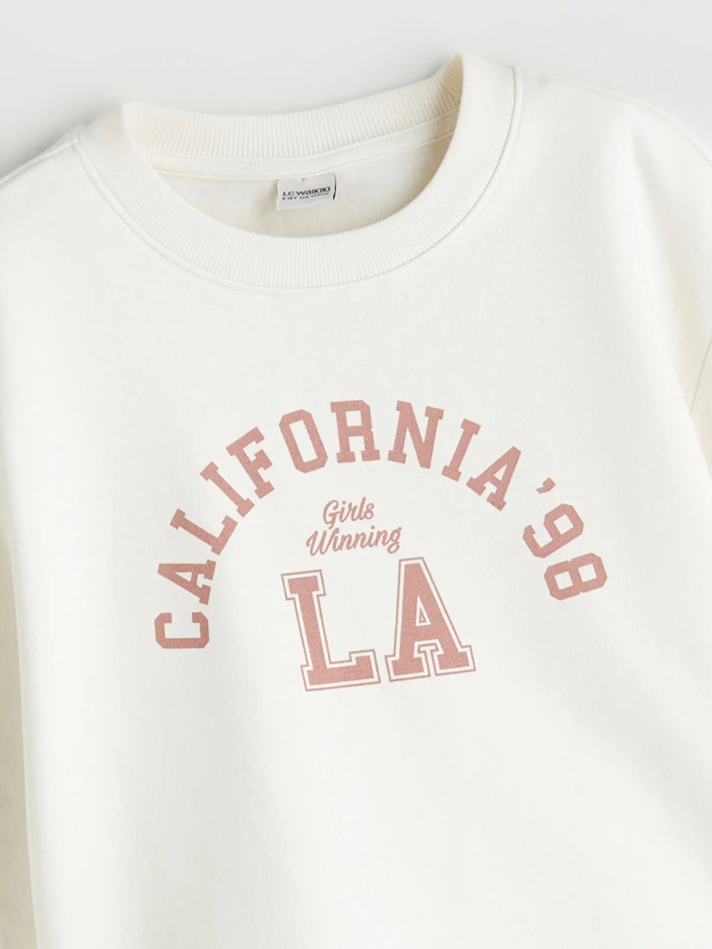Bisiklet yaka, uzun kollu kız çocuk sweatshirt, kalın üç iplik şardonlu kumaştan üretilmiştir. Önü baskılı, kol uçları ribanalı, etek ucu düz kesimdir.