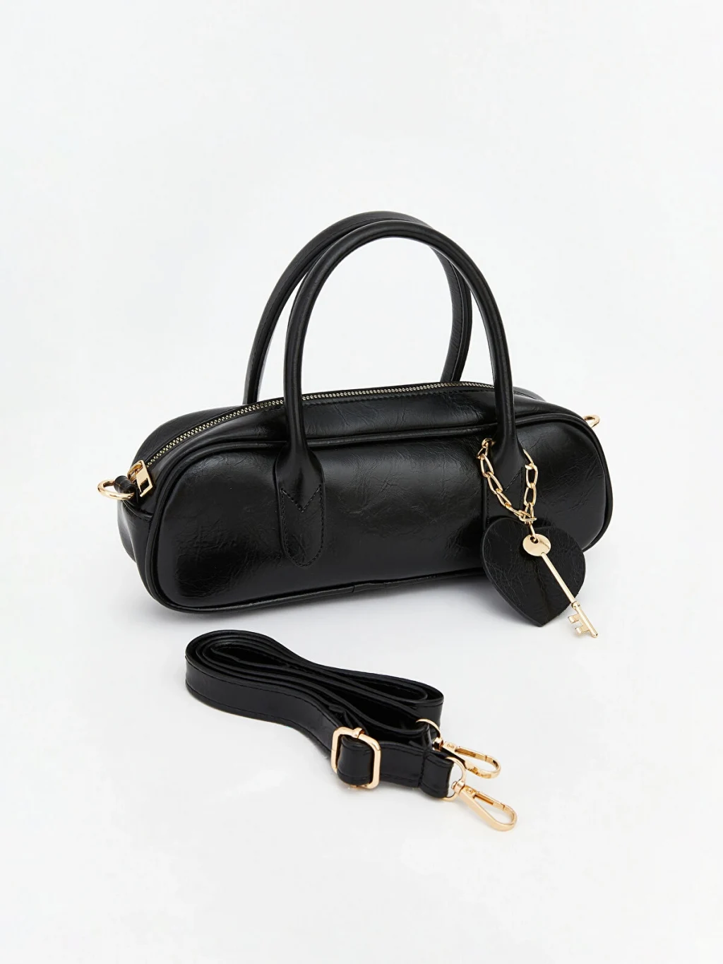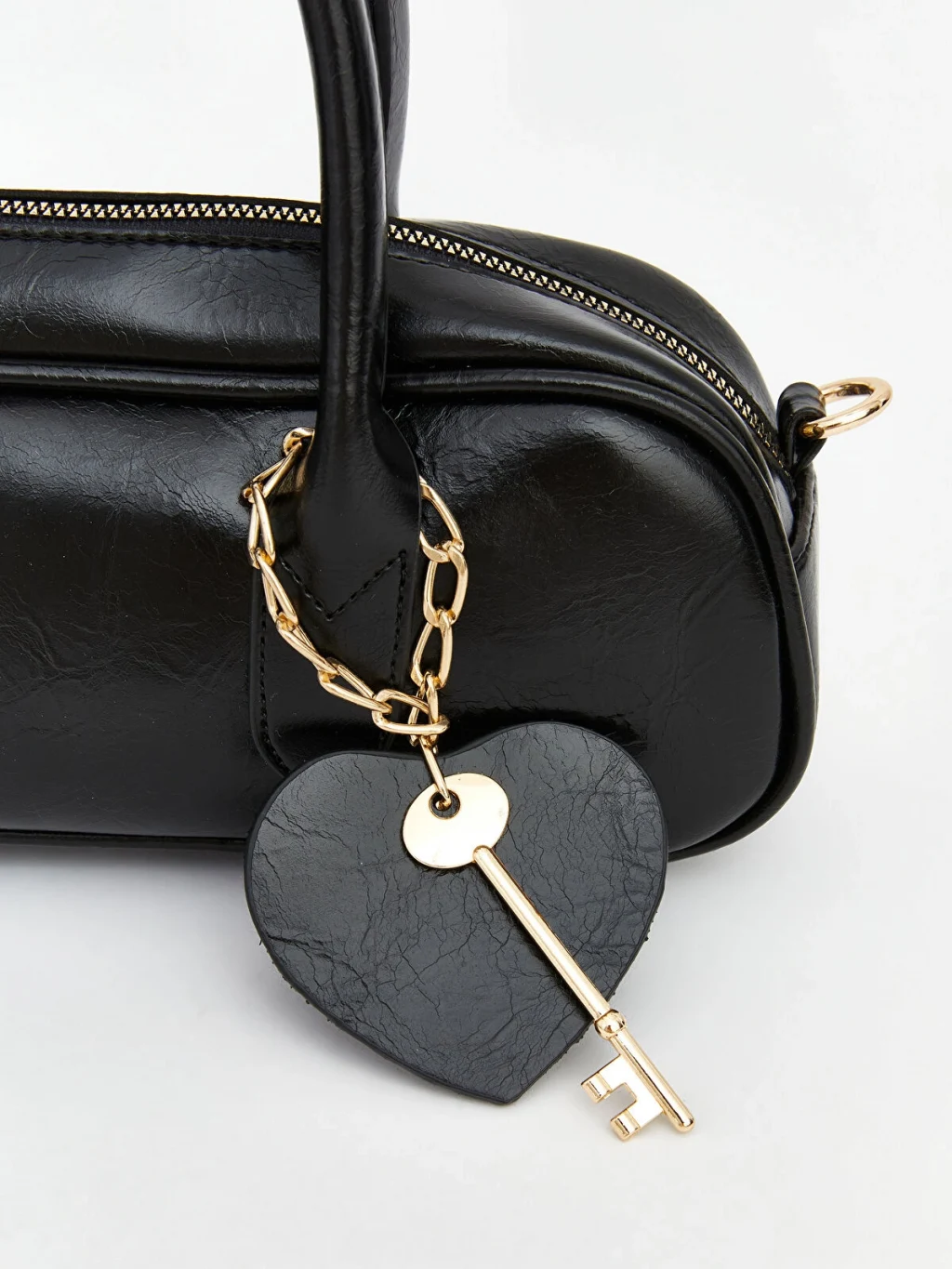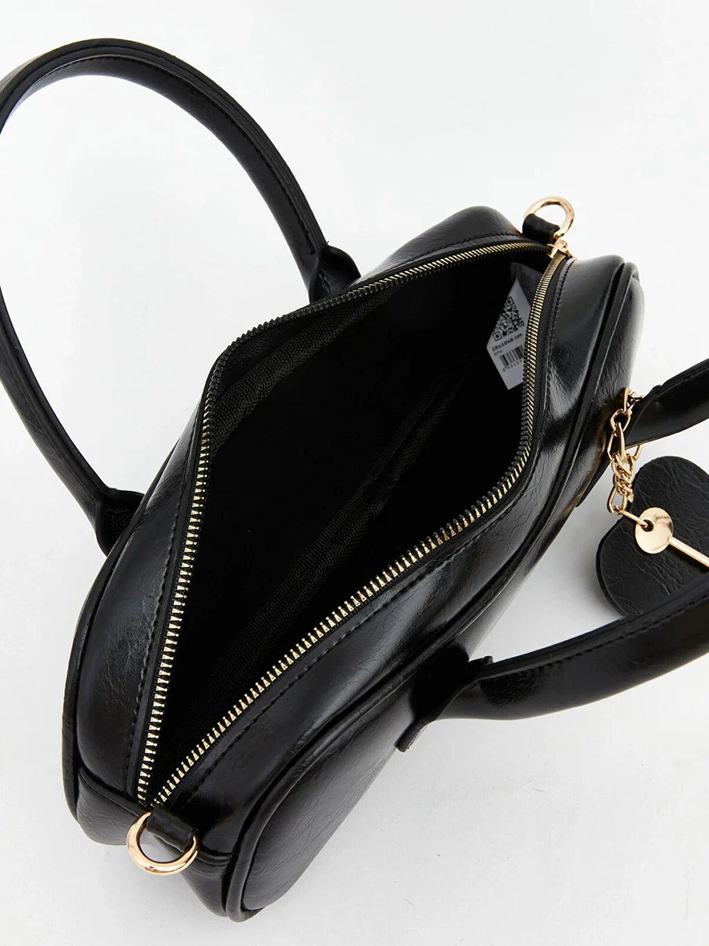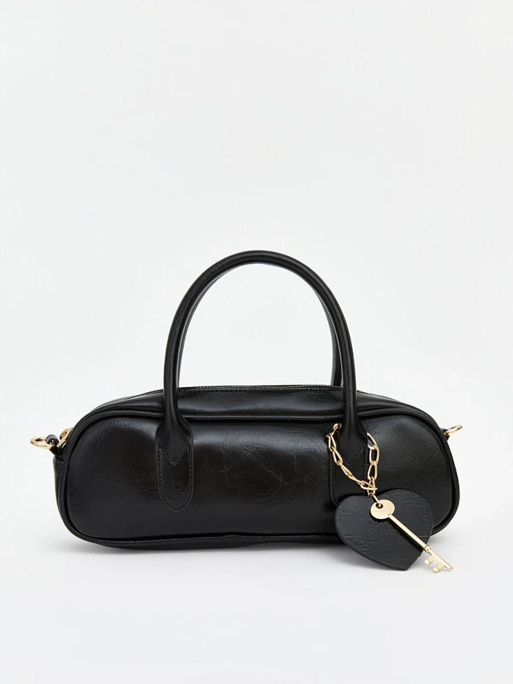 Fermuar kapamalı, elde taşıma saplı kadın omuz çantası, deri görünümlü kumaştan üretilmiştir. Çanta aksesuarı bulunmaktadır.