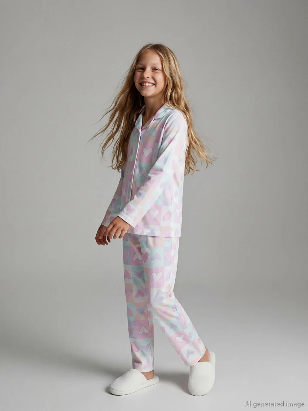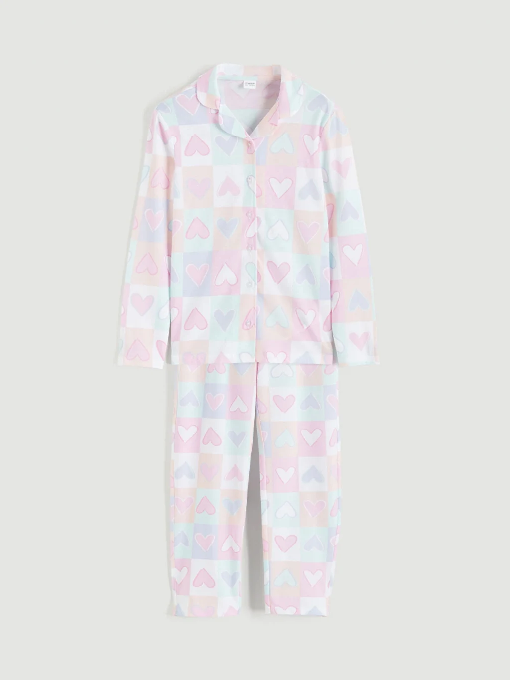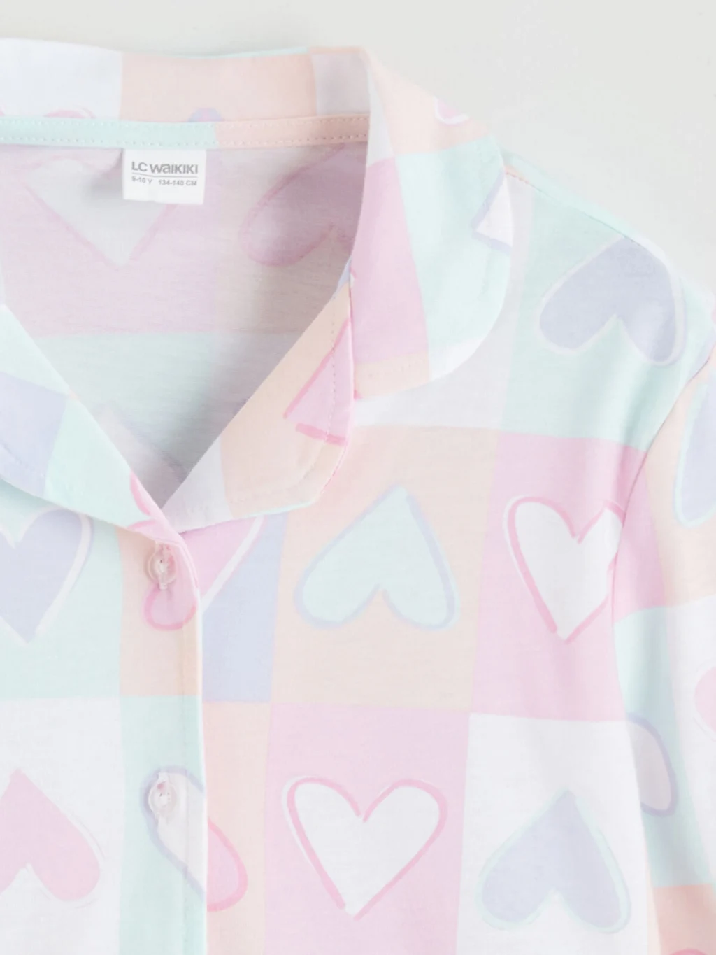 Kalp desenli, gömlek yaka kız çocuk pijama takımı %100 pamuktur. Uzun kollu, önden düğmeli üst ve uzun paçalı alttan oluşur.