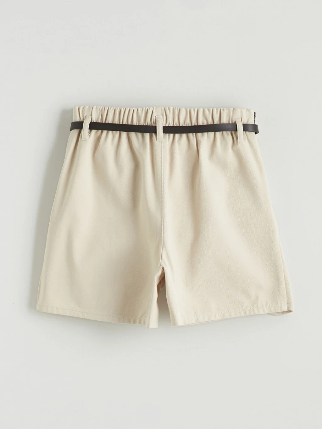Kız çocuk etek, %100 pamuk gabardin kumaştan üretilmiştir. Beli lastikli, kemerli ve pilili tasarıma sahip olup astarsızdır.