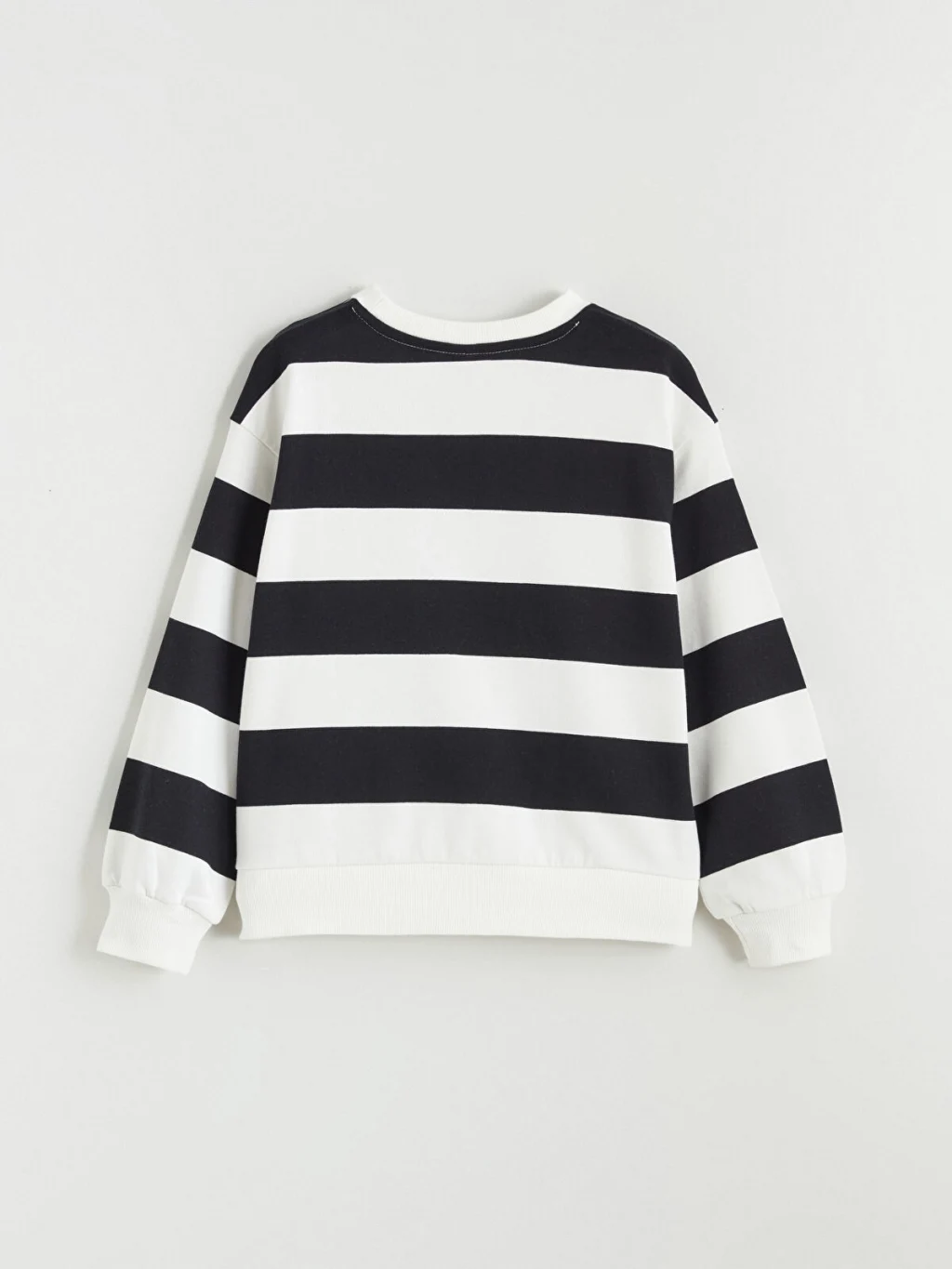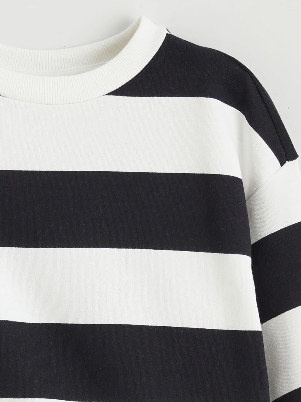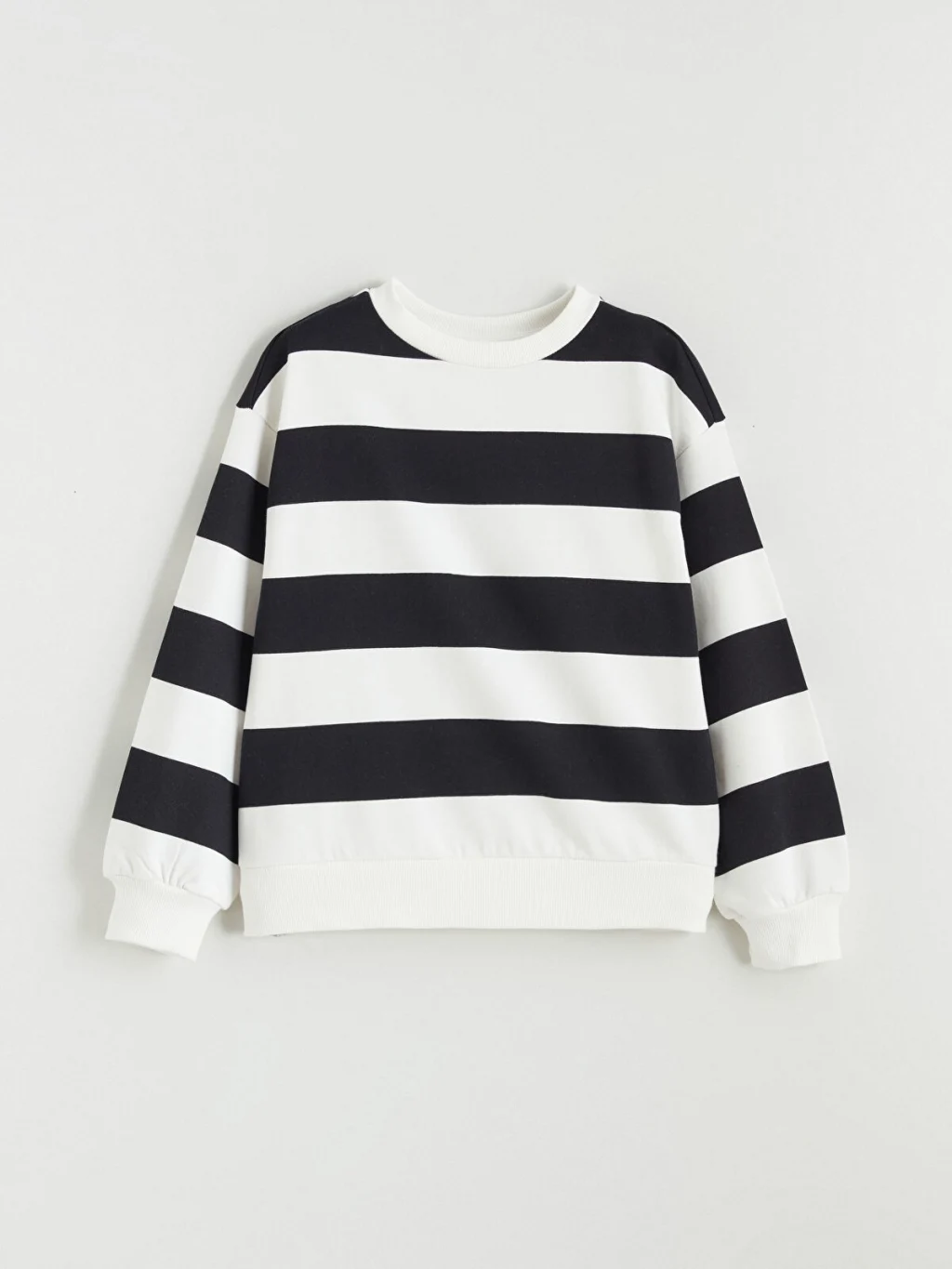 Bisiklet yakalı ve uzun kollu kız çocuk sweatshirt, çizgili desene sahiptir. Kol uçları ve etek ucu ribanalıdır.