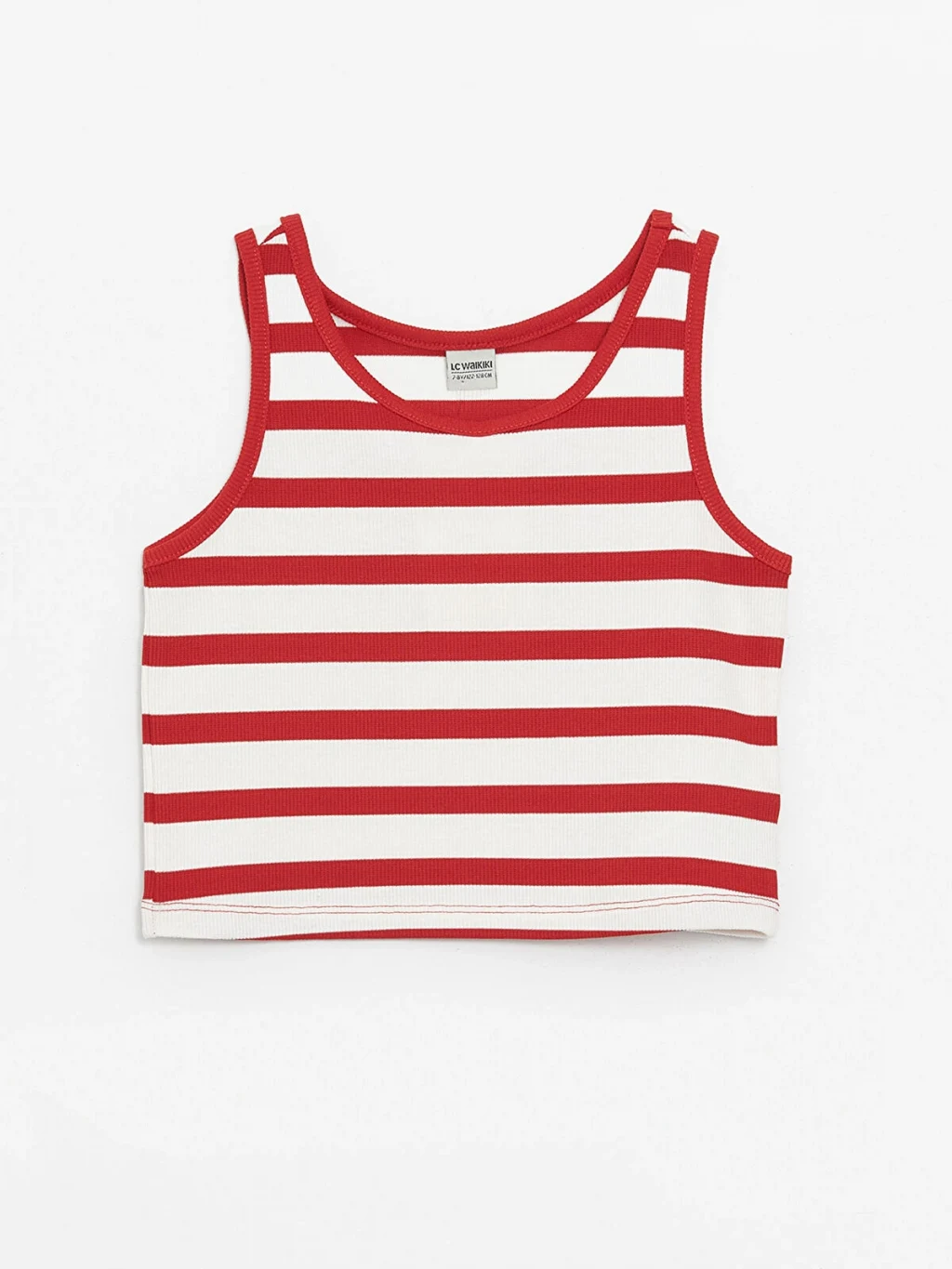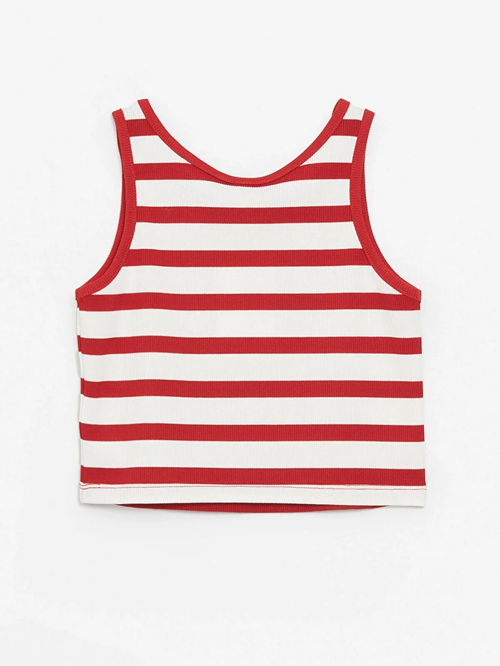 Bisiklet yaka, çizgili kız çocuk atlet, kaşkorse penye kumaştan üretilmiştir. Kolsuz tasarıma sahiptir.