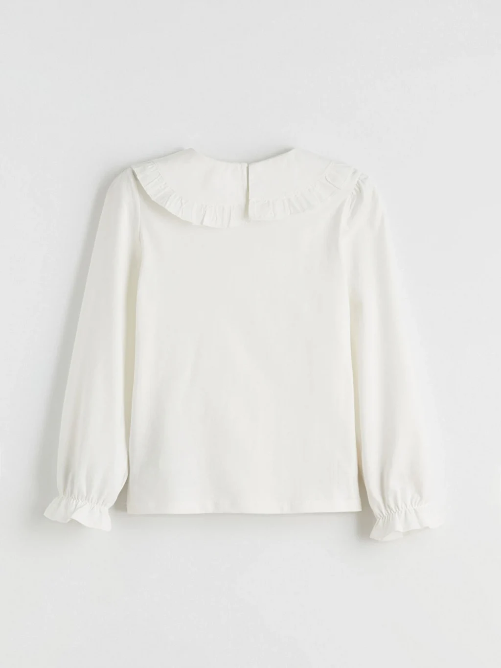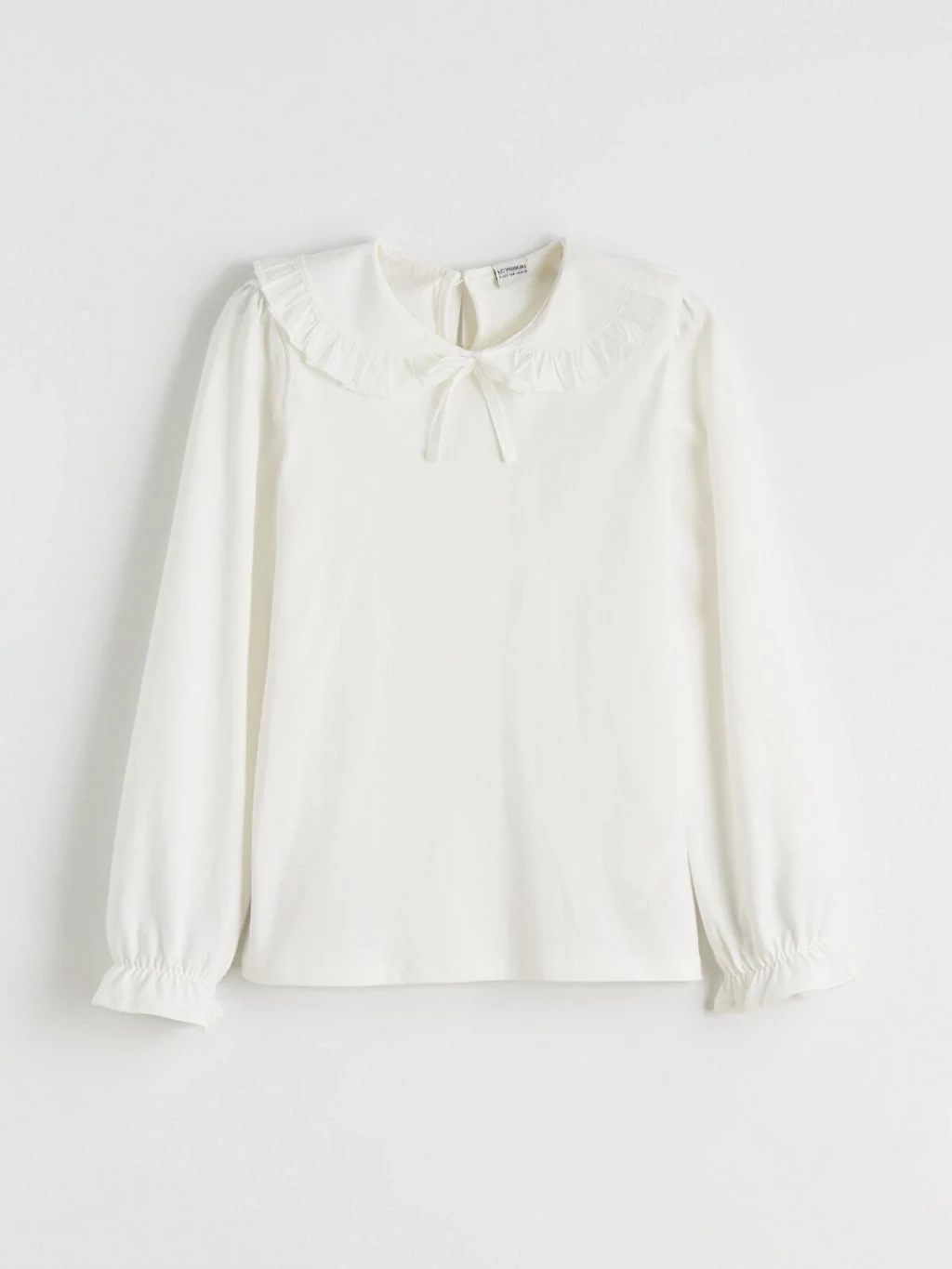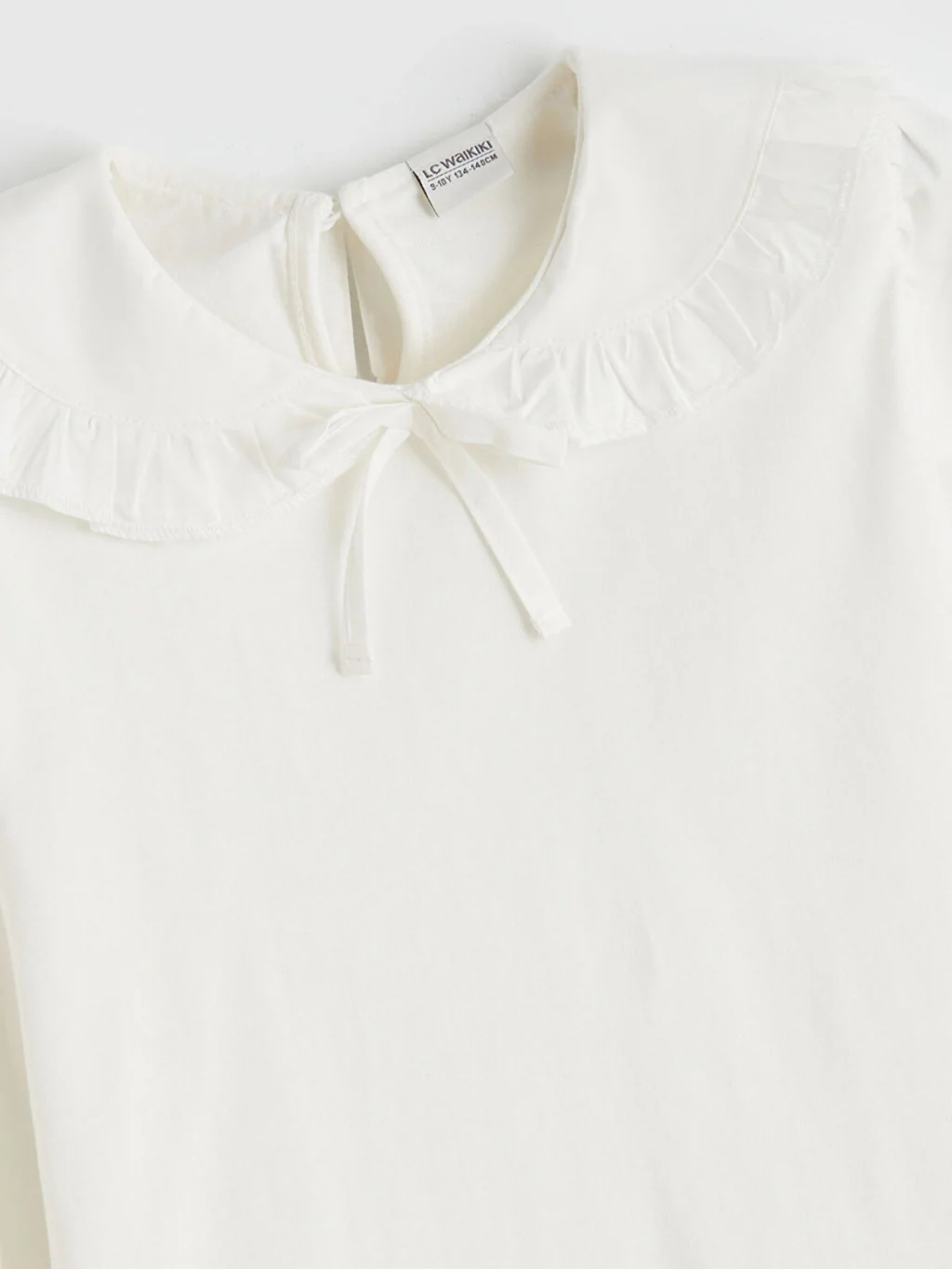 Uzun kollu kız çocuk tişört, bisiklet yaka tasarımlıdır. Yaka kısmında fırfırlı detay ve bağcık bulunur. Kol uçları lastikli tasarlanmıştır.