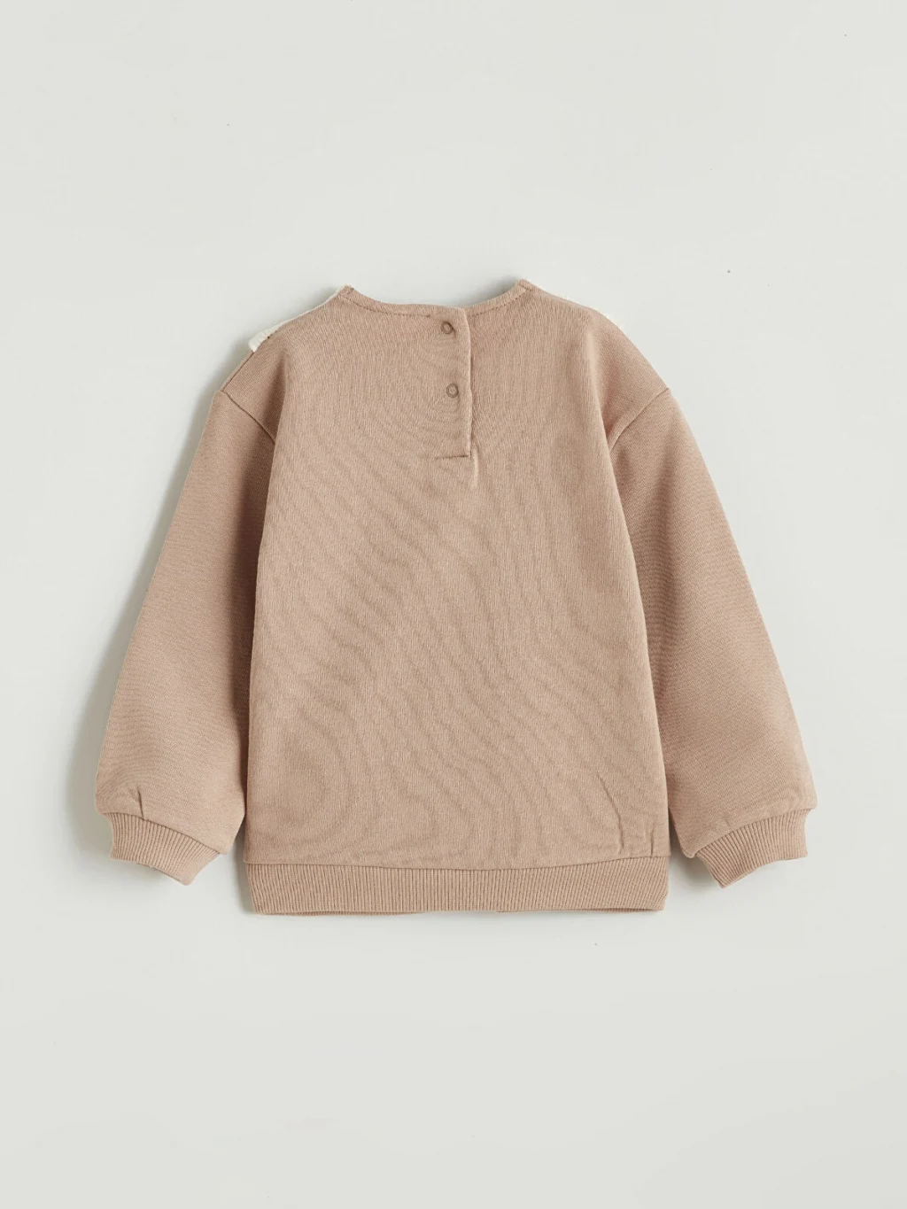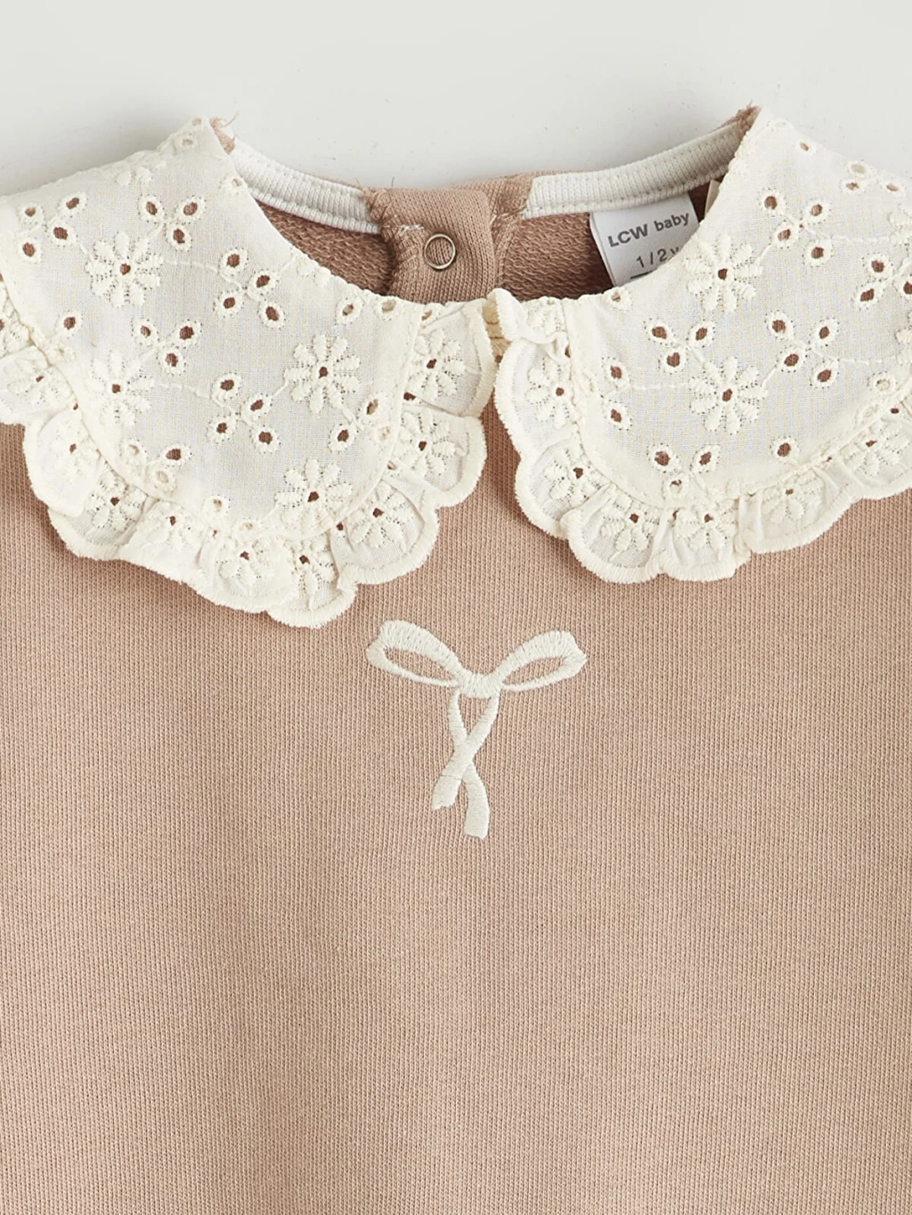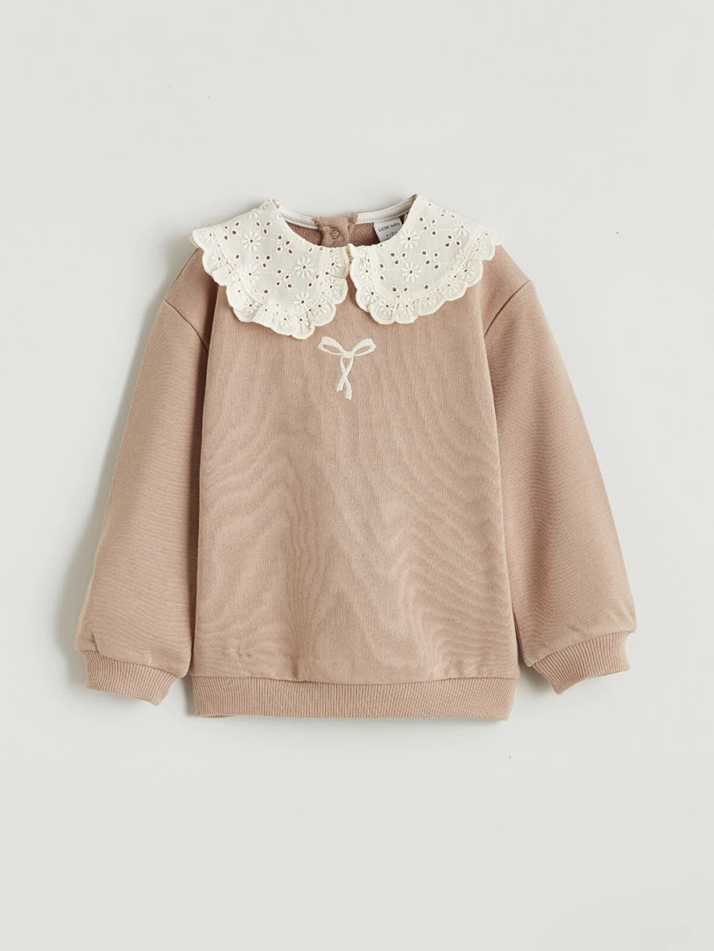 Brode detaylı bebe yakalı, uzun kollu kız bebek sweatshirt, %100 pamuklu kumaştan üretilmiştir. Enseden düğme kapamalıdır ve önünde fiyonk nakışı bulunur.