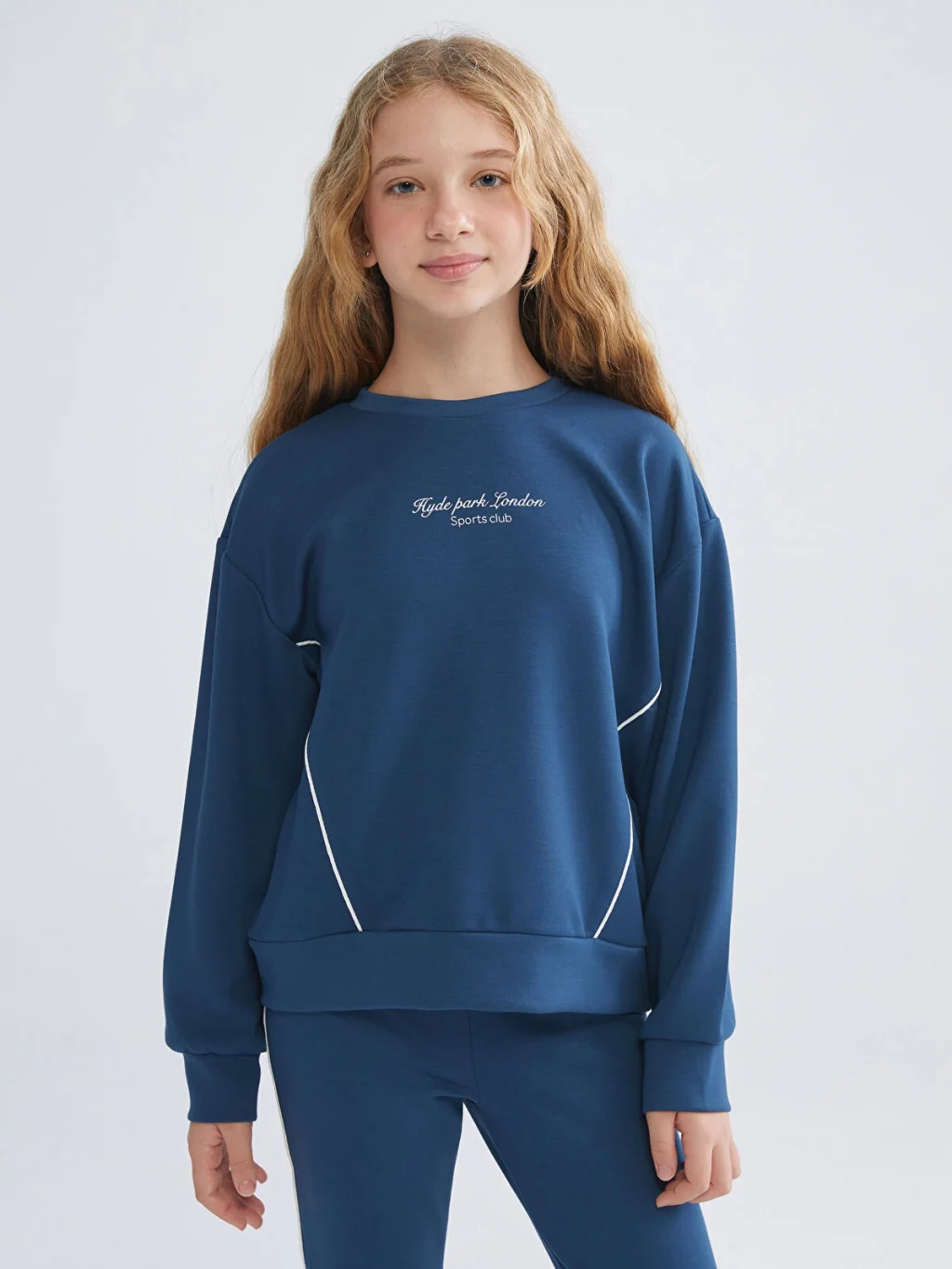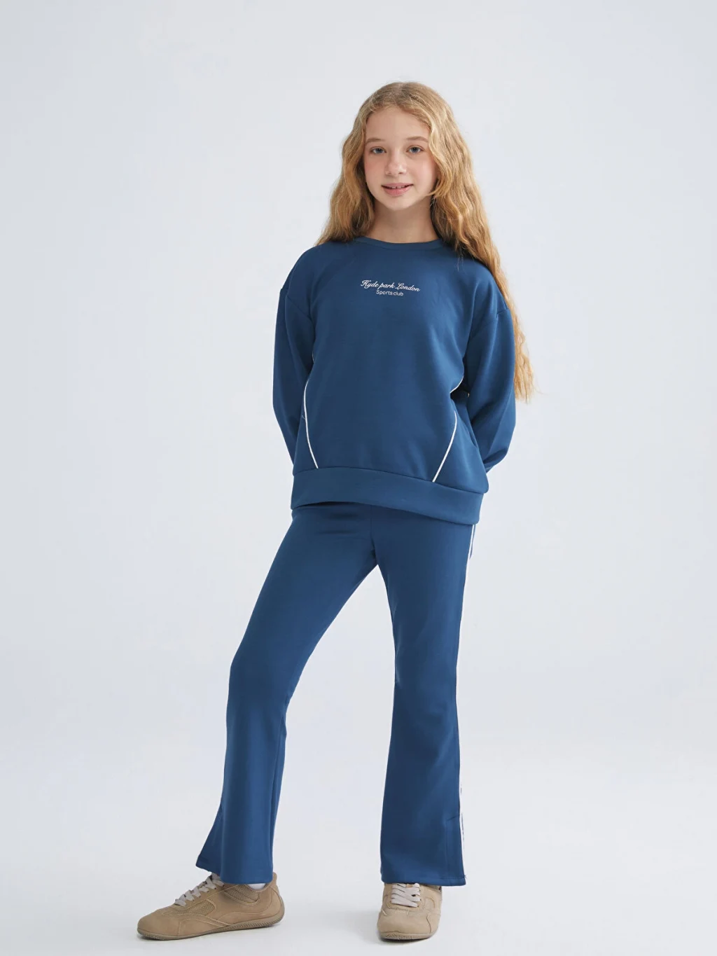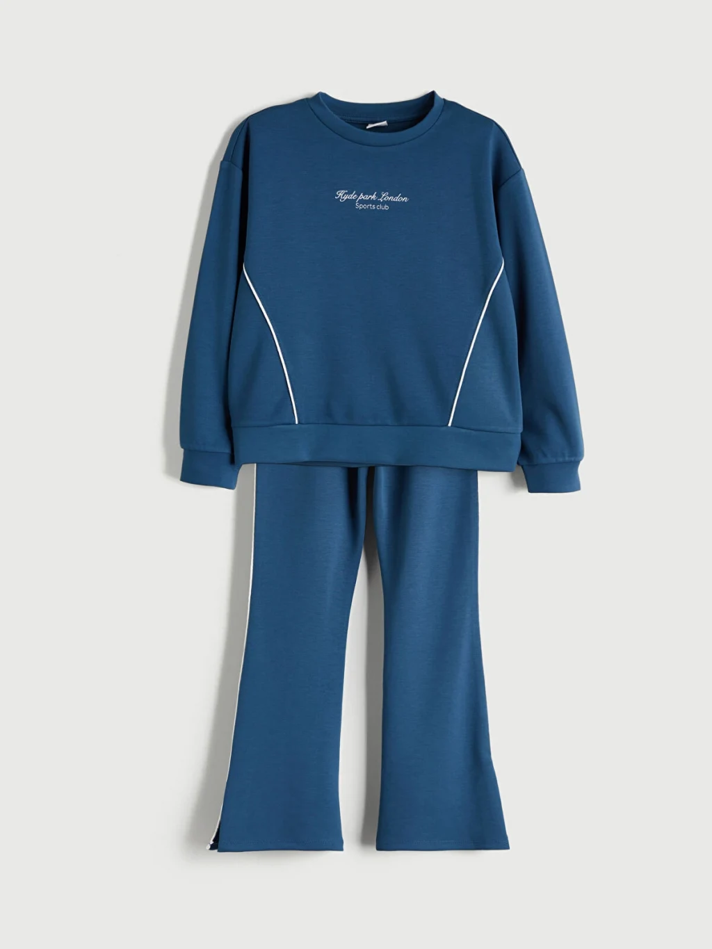 Kız çocuk eşofman takımı; bisiklet yaka, uzun kollu, biye detaylı sweatshirt ve beli lastikli, paçası yırtmaçlı eşofman alttan oluşur.