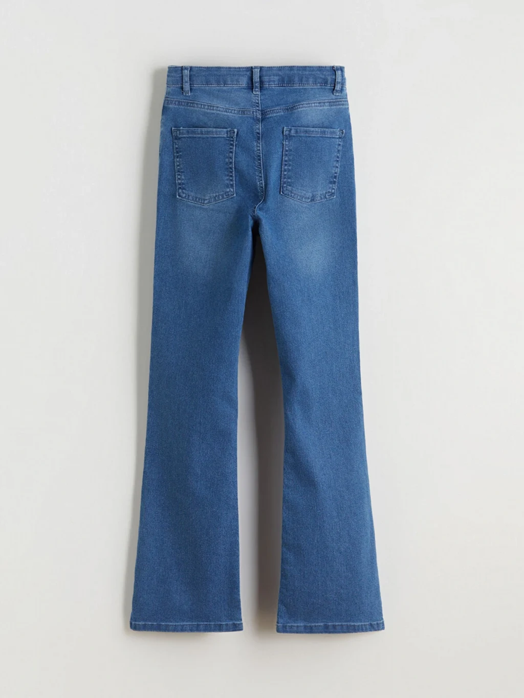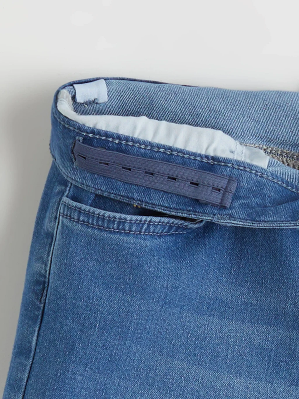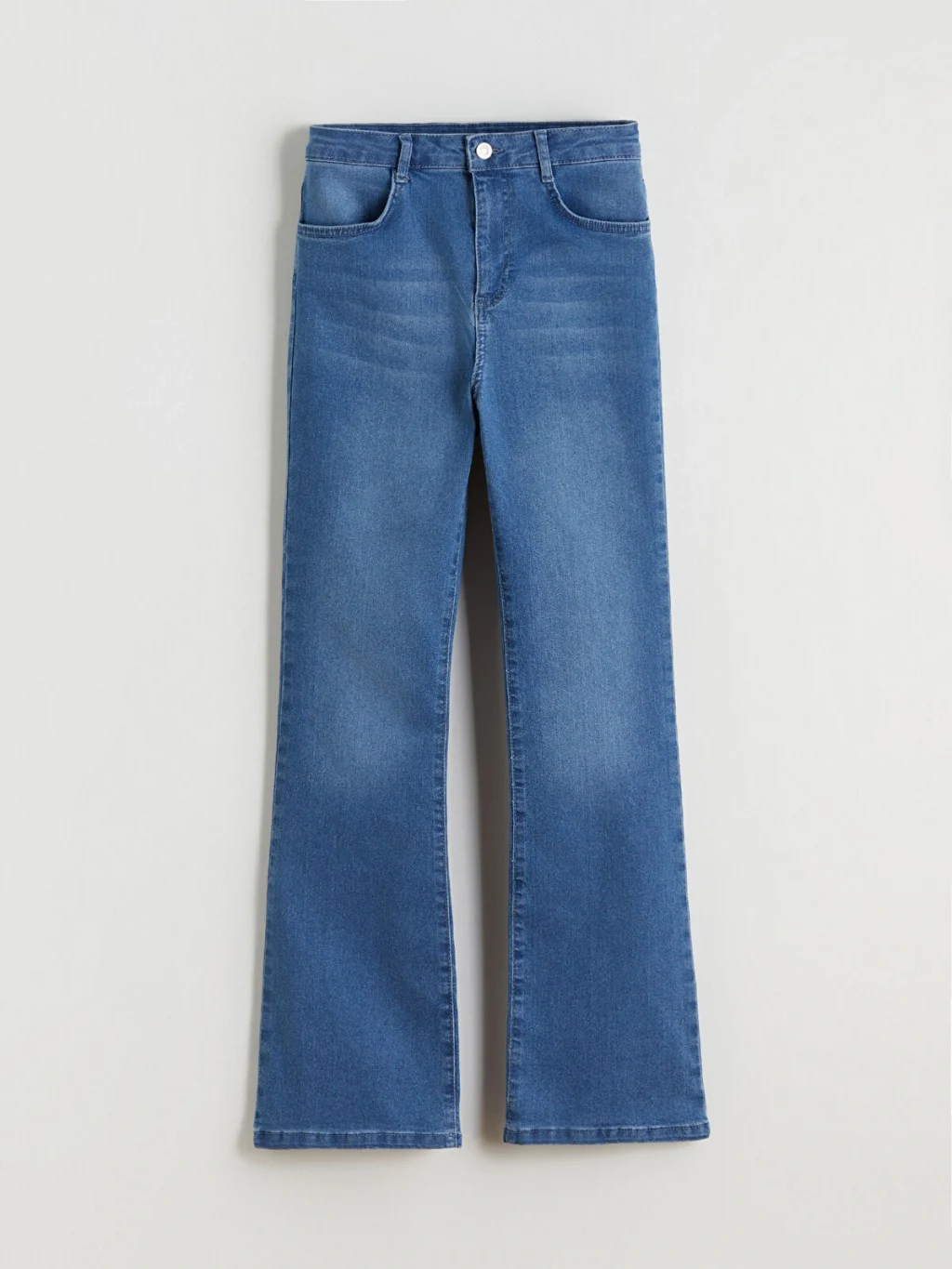 Flare fit kız çocuk jean pantolon, dizden paça ucuna doğru genişleyen rahat bir kesime sahiptir. İçten lastikli bel detayına sahiptir.