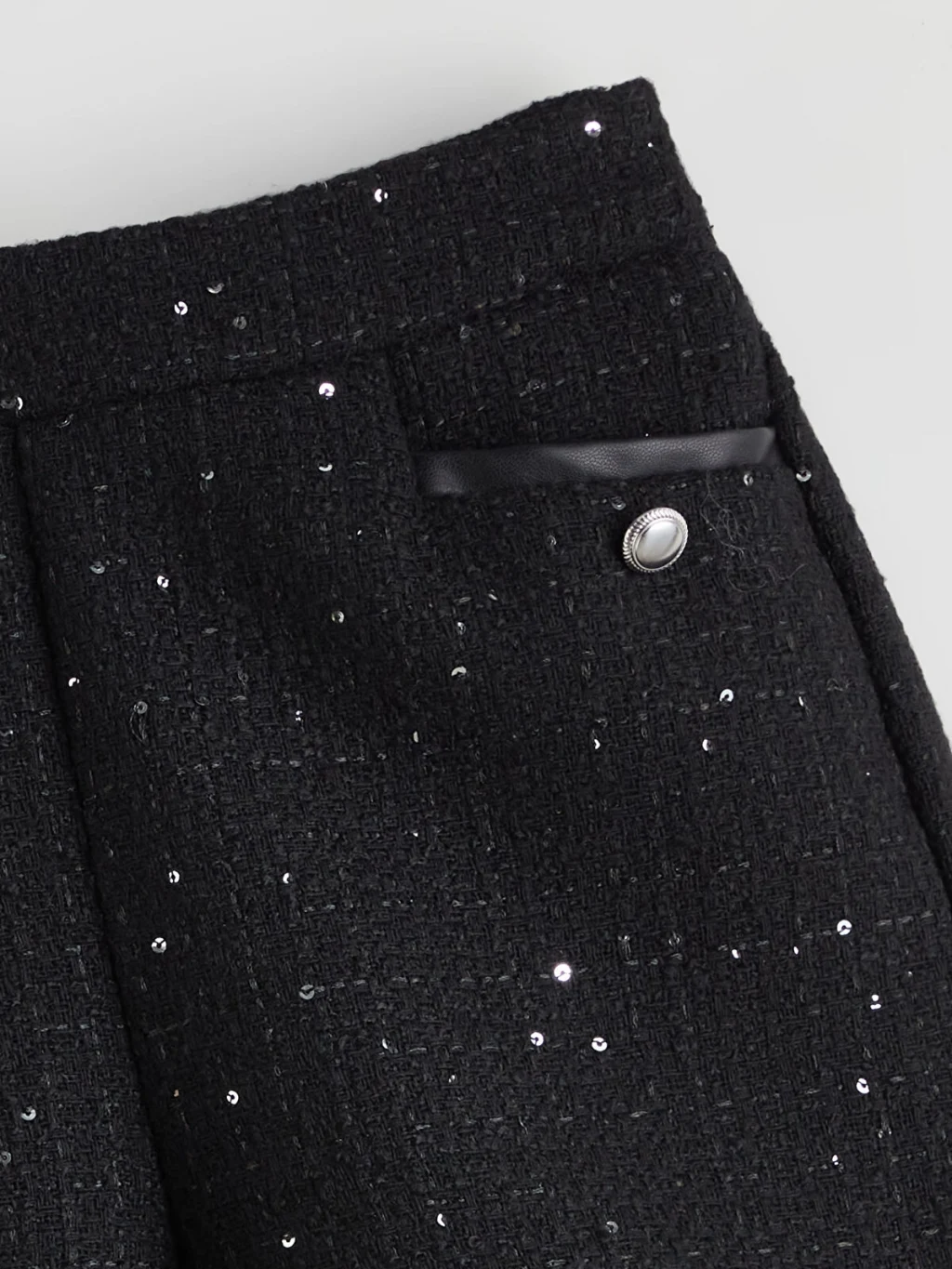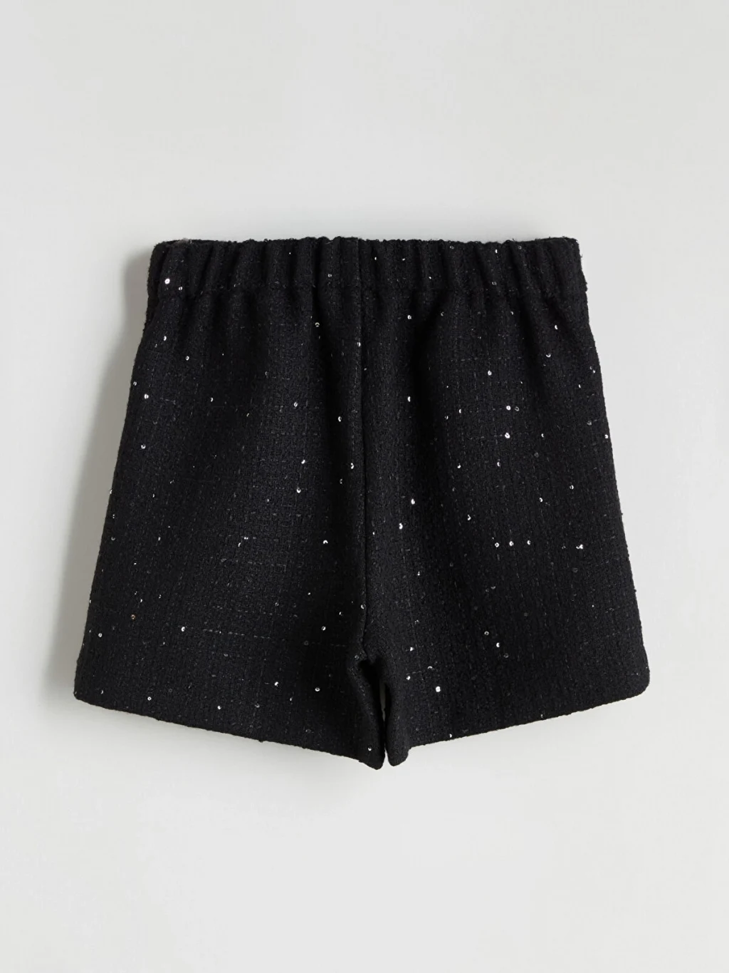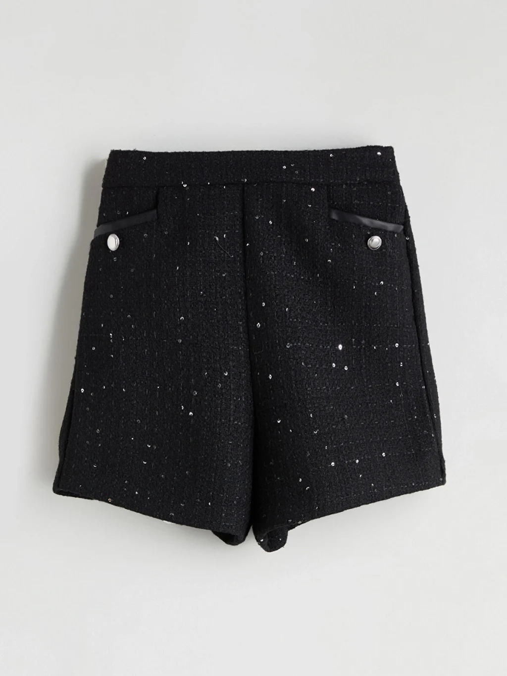 Yüksek bel kız çocuk şort, payetli tüvit kumaştan üretilmiştir. Ön kısmında biyeli ve düğme detaylı iki adet cebi bulunur.