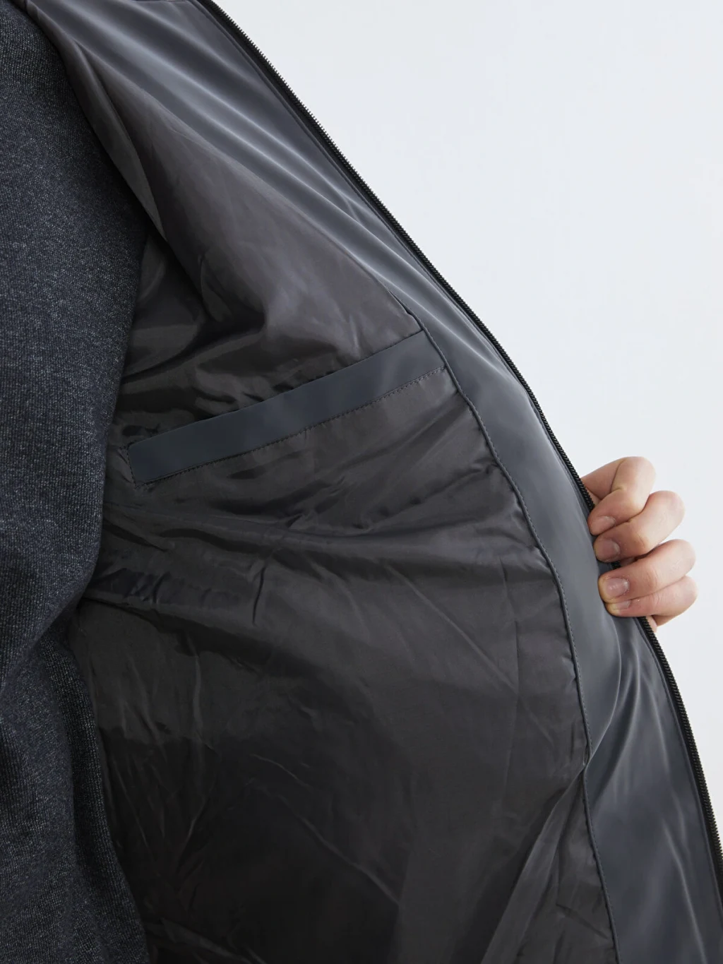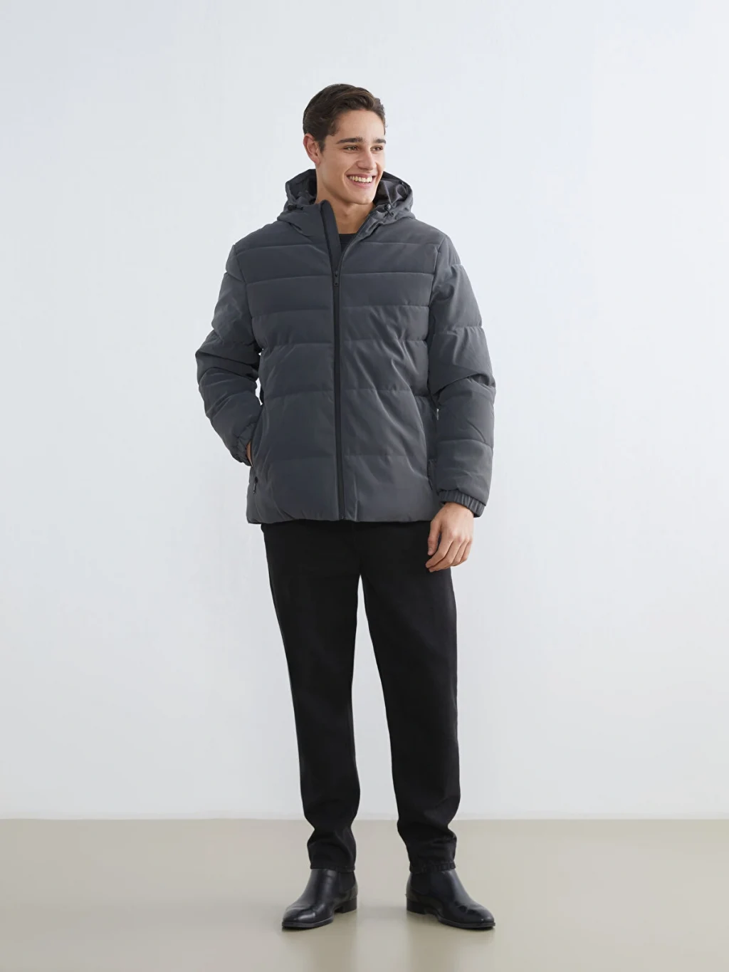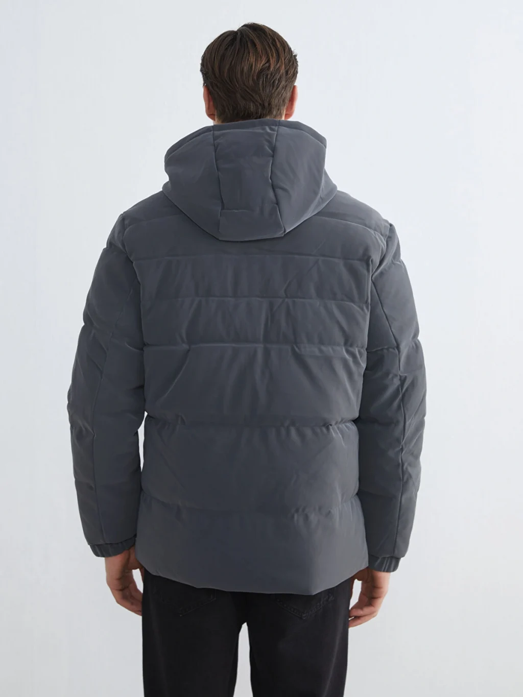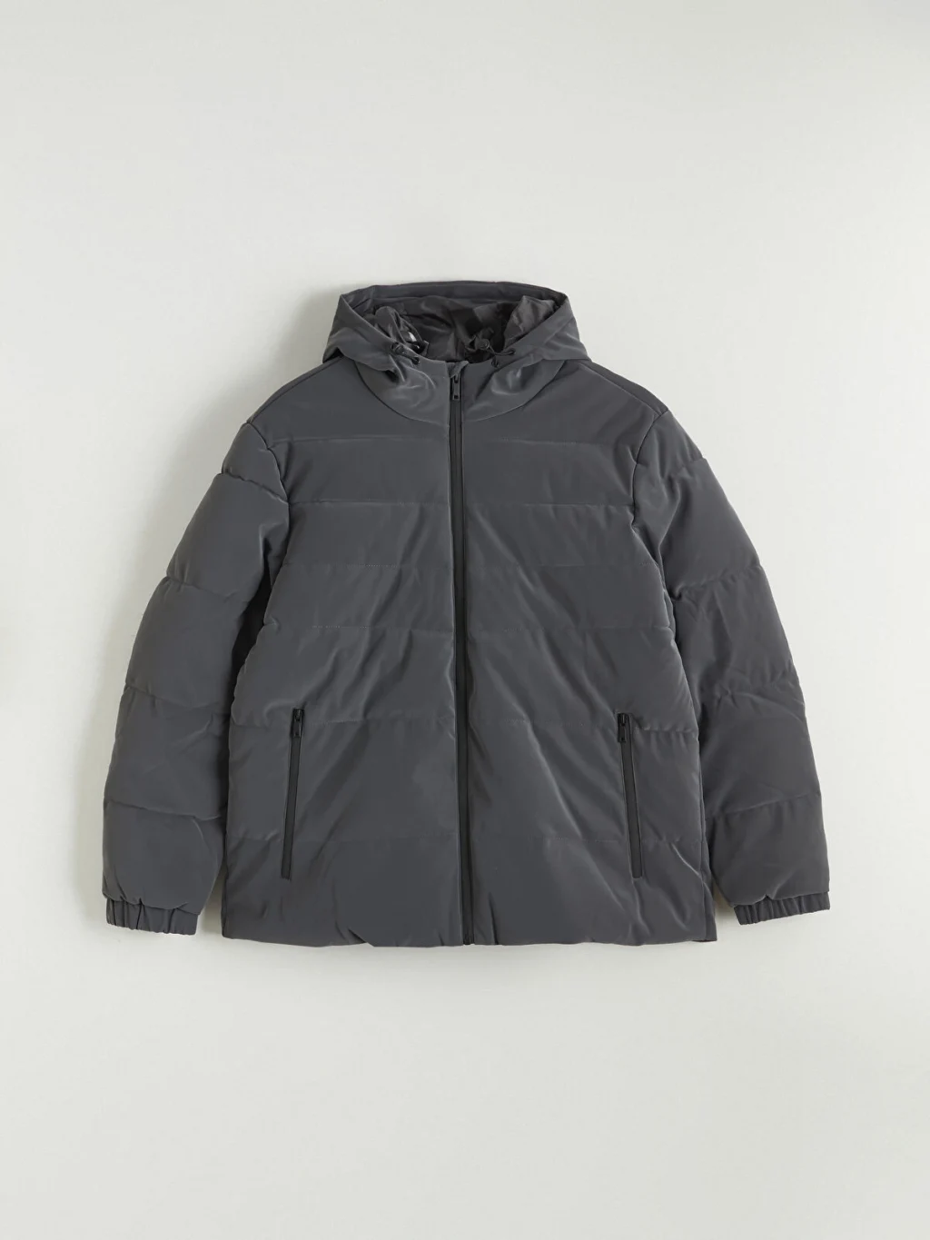 Erkek şişme mont, kapüşonlu ve fermuar kapamalıdır. Uzun kollu modelin yan cepleri fermuarlı, kol uçları ise lastiklidir.