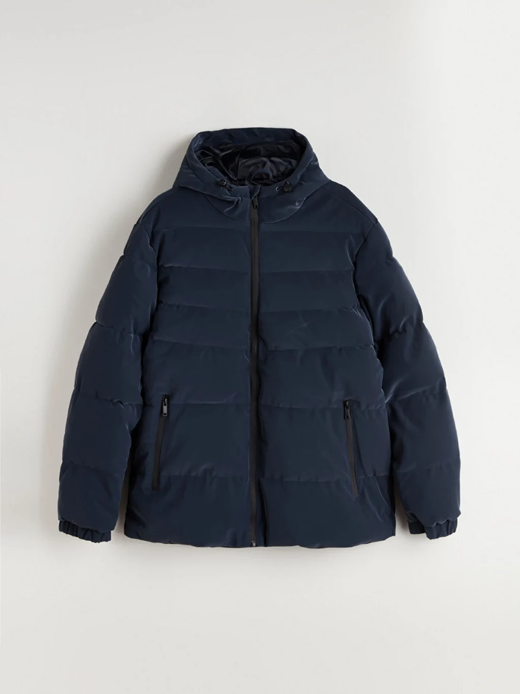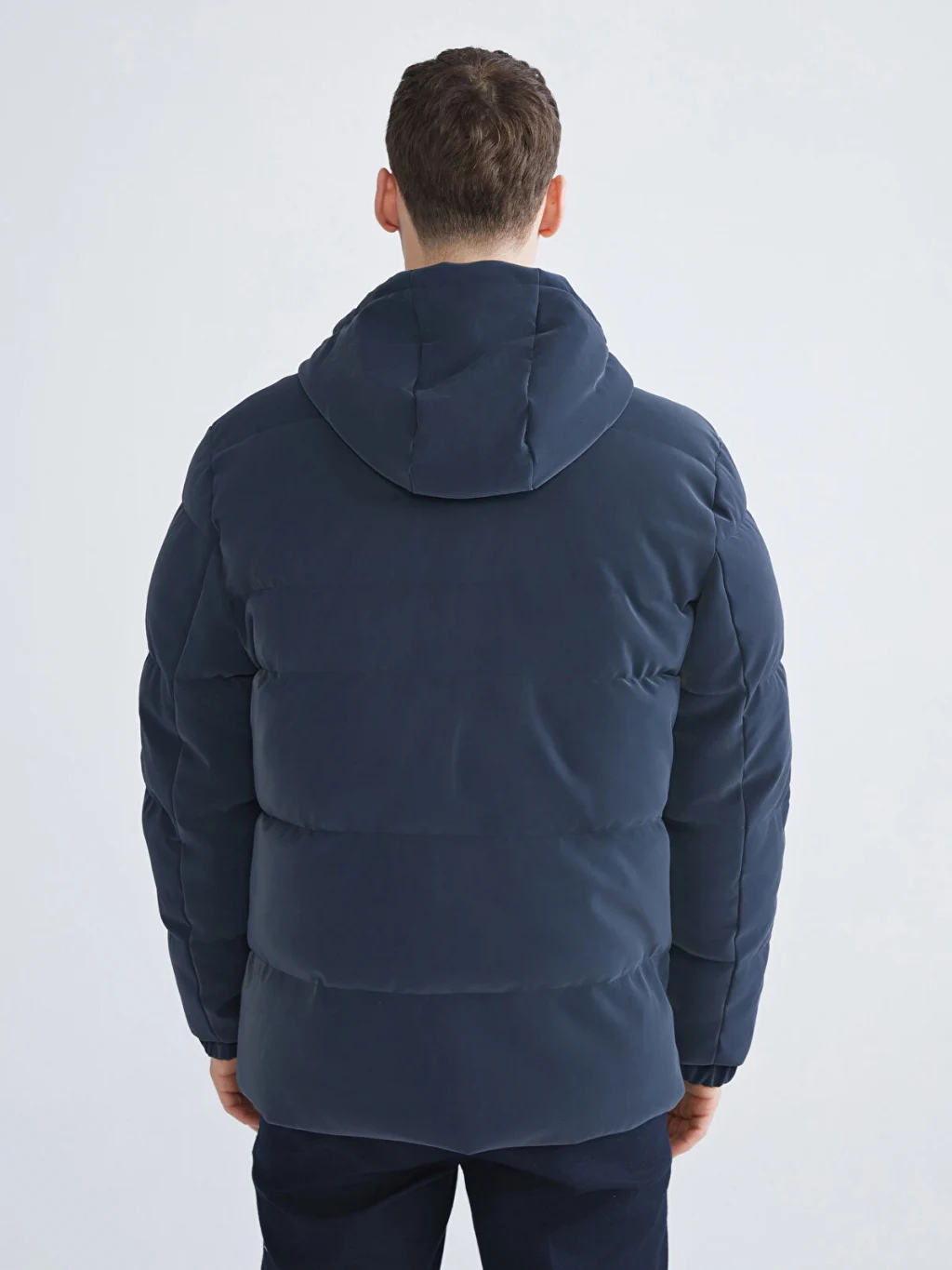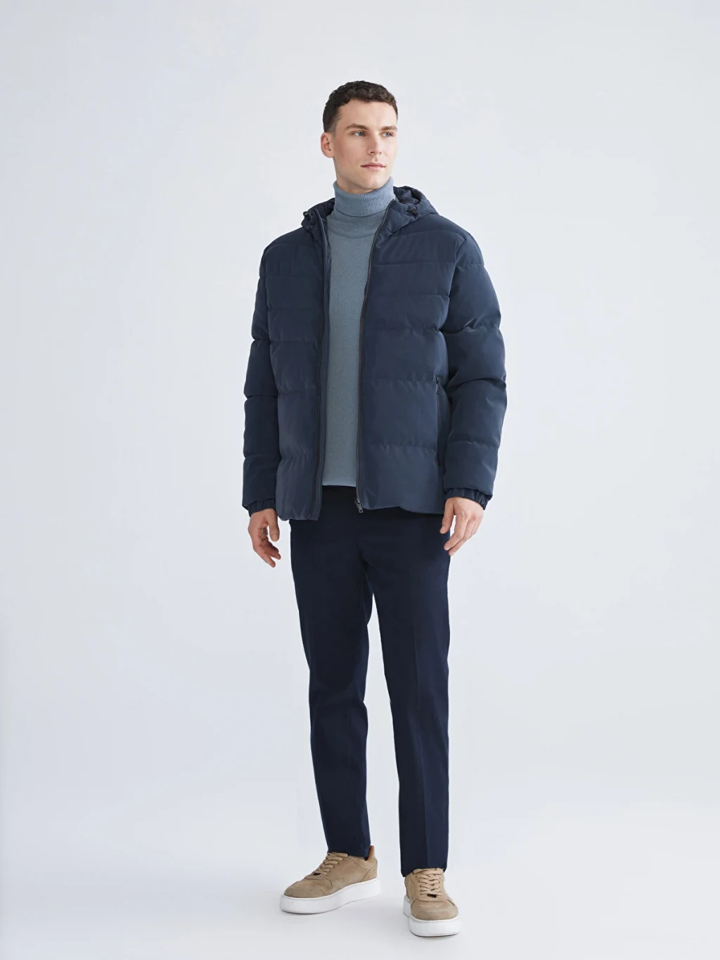 Kapüşonlu, uzun kollu erkek şişme mont, önden fermuar kapamalıdır ve yanlarında fermuarlı cepleri bulunur.