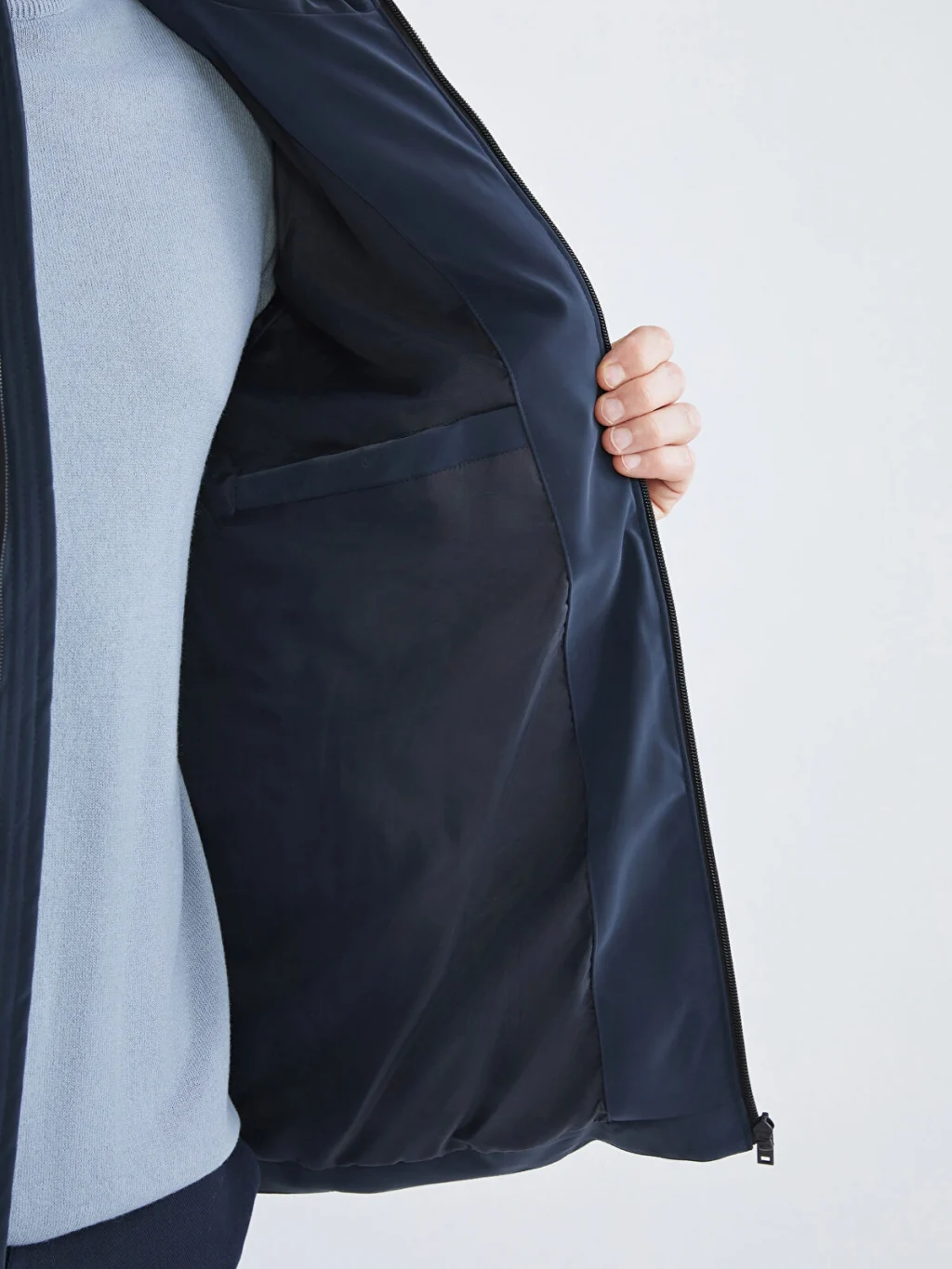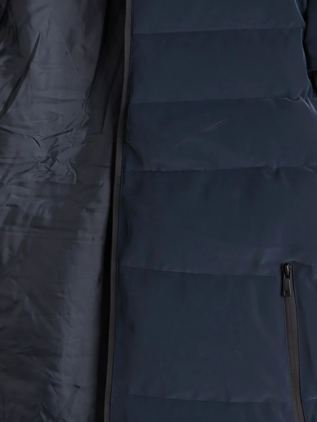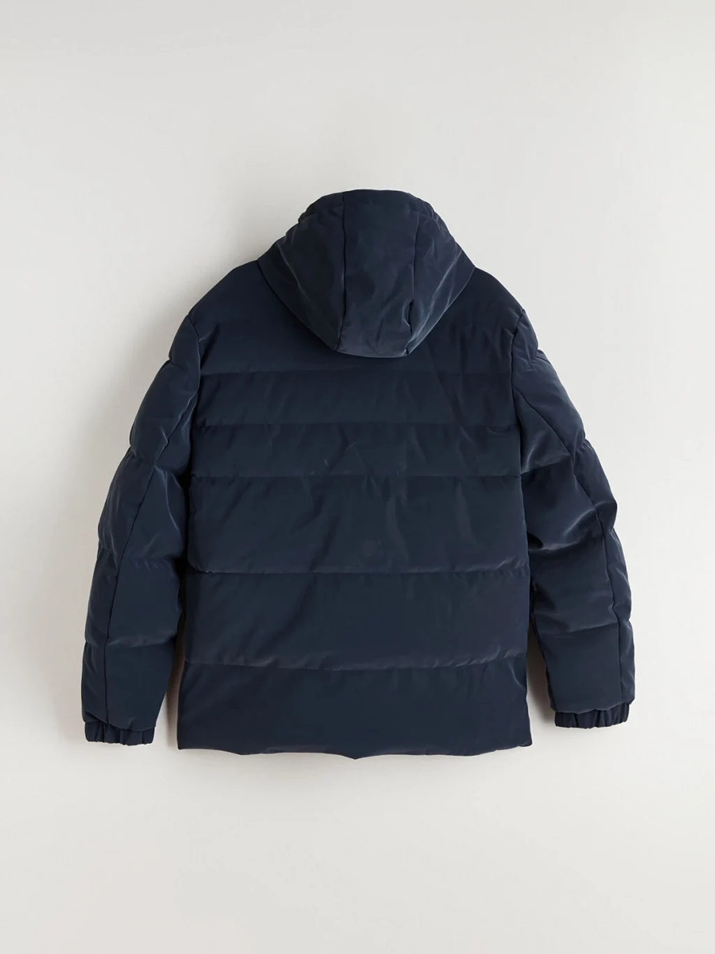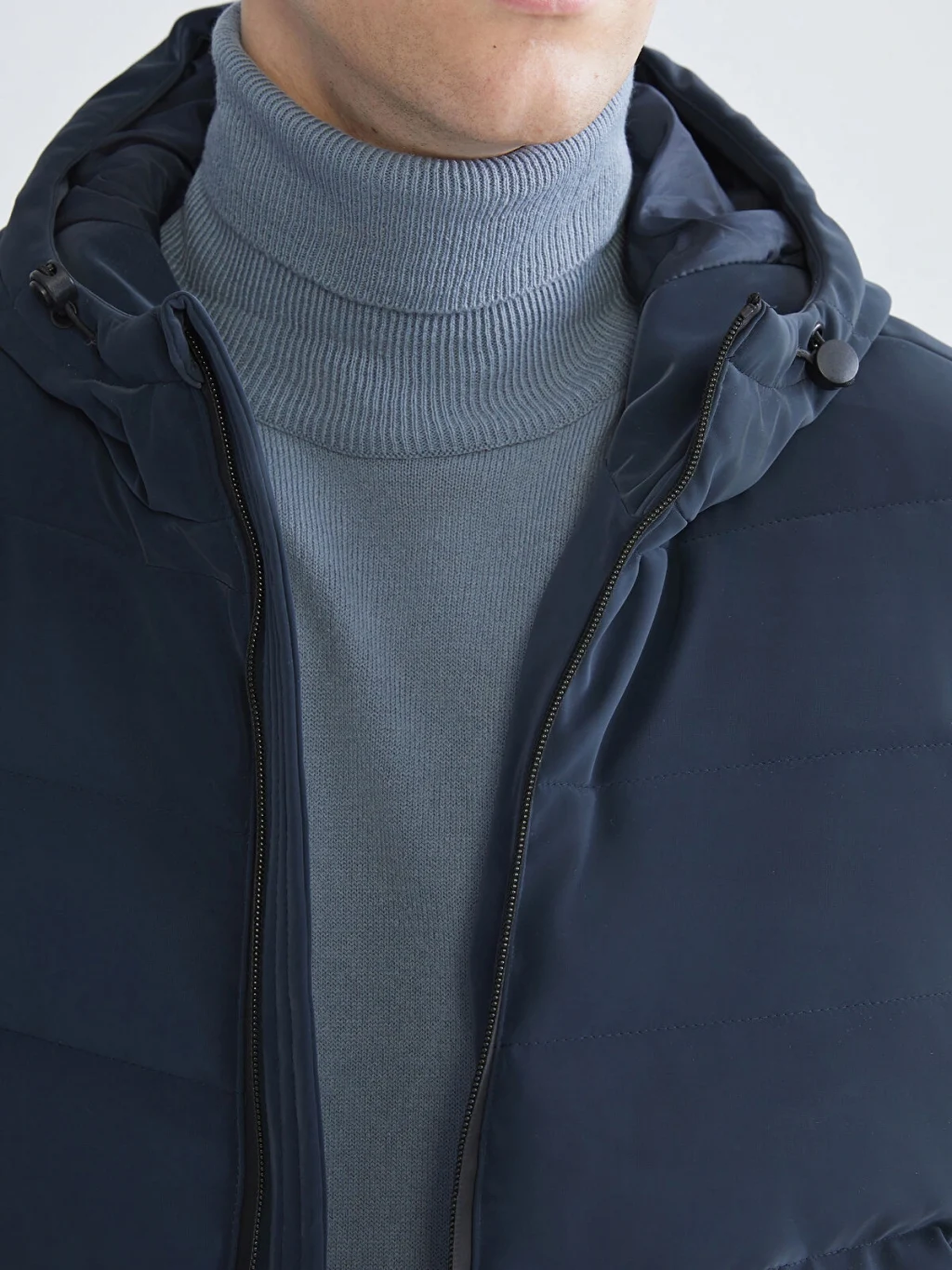 Kapüşonlu, uzun kollu erkek şişme mont, önden fermuar kapamalıdır ve yanlarında fermuarlı cepleri bulunur.