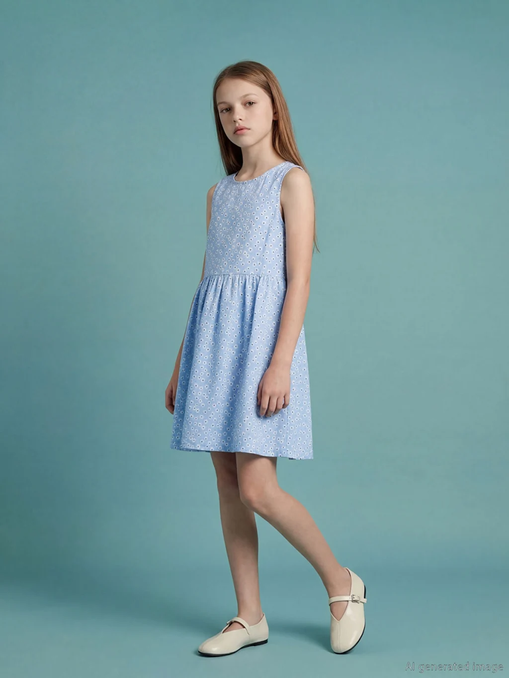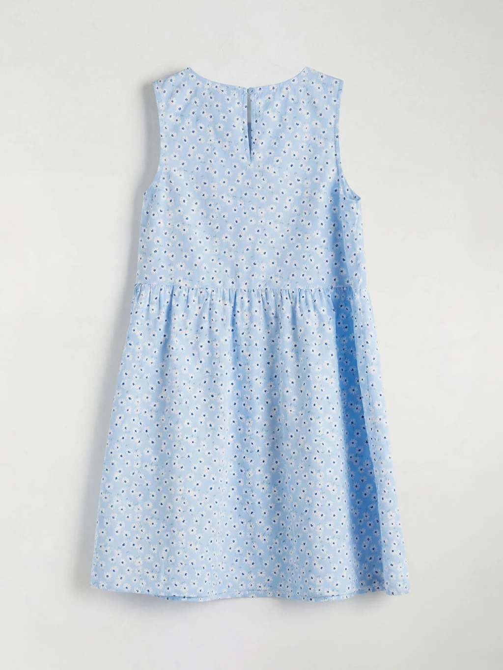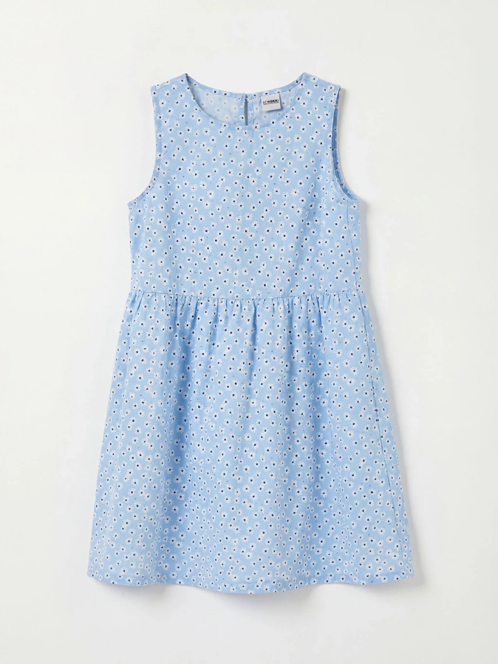 Bisiklet yaka, kolsuz, beli büzgülü kız çocuk elbise, %100 pamuk poplin kumaştan üretilmiştir ve arkadan düğme kapamalıdır.