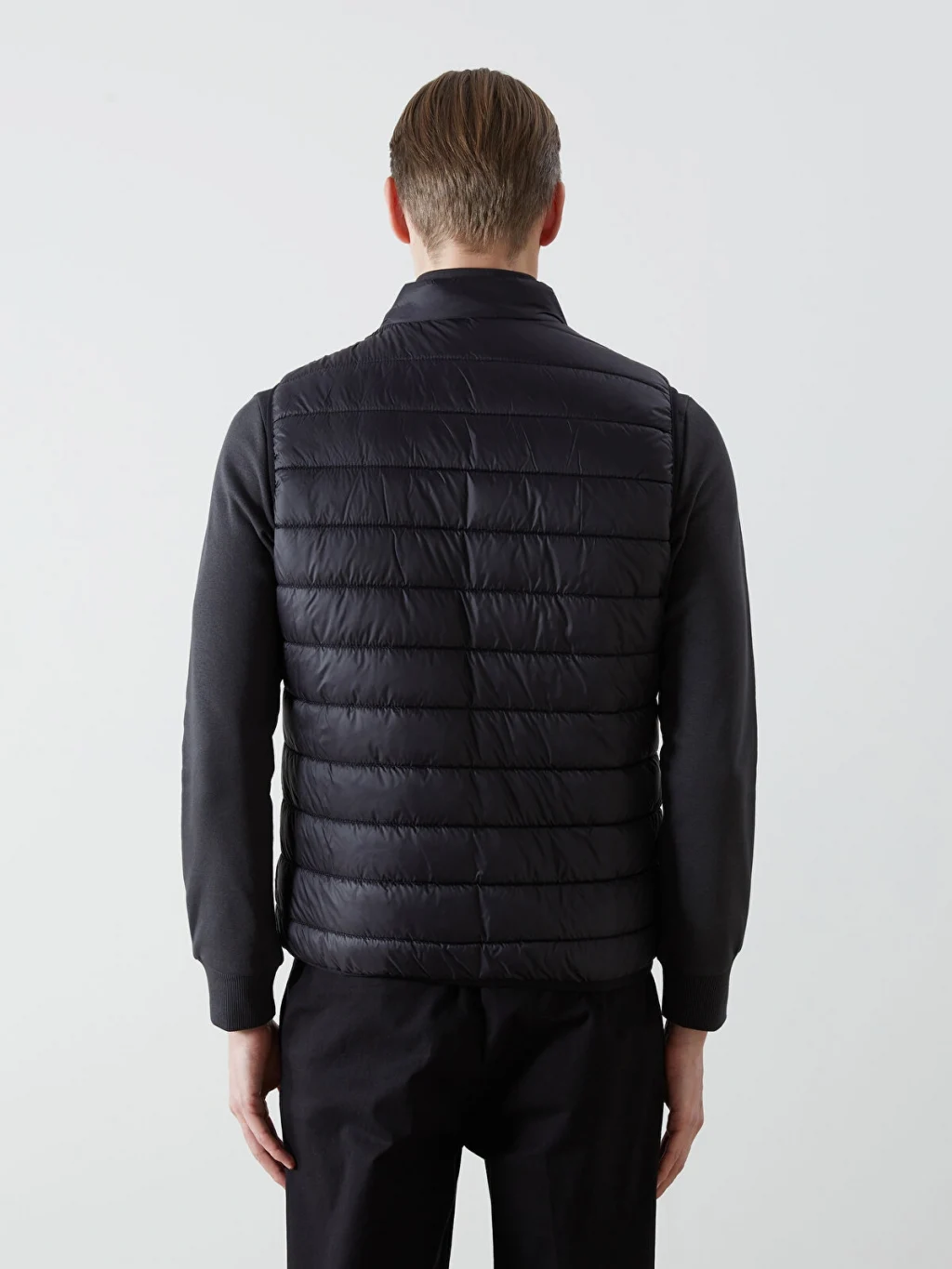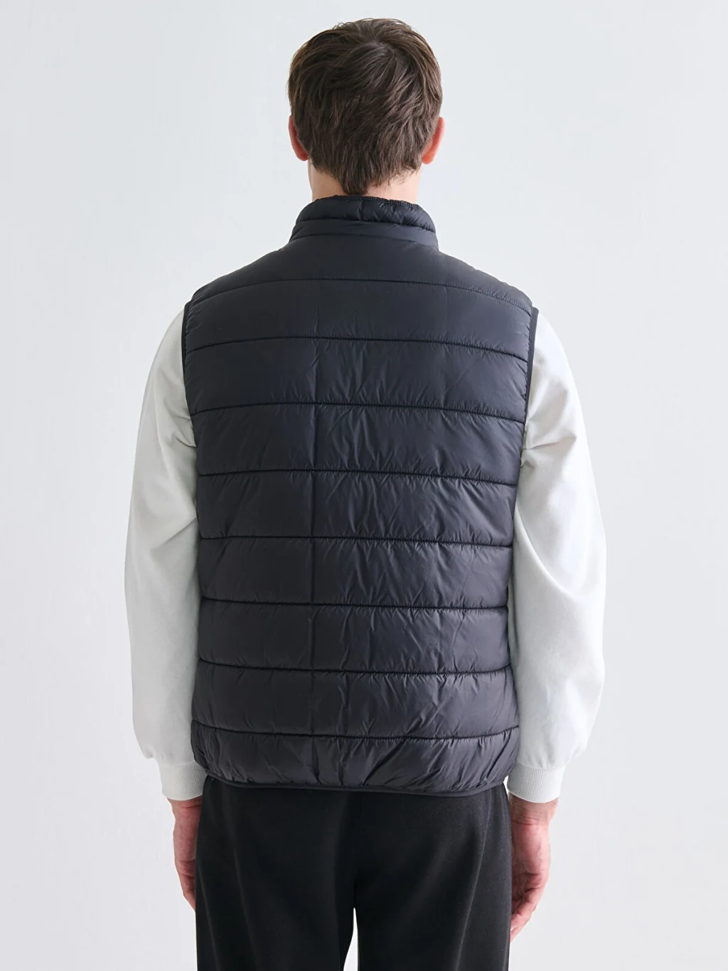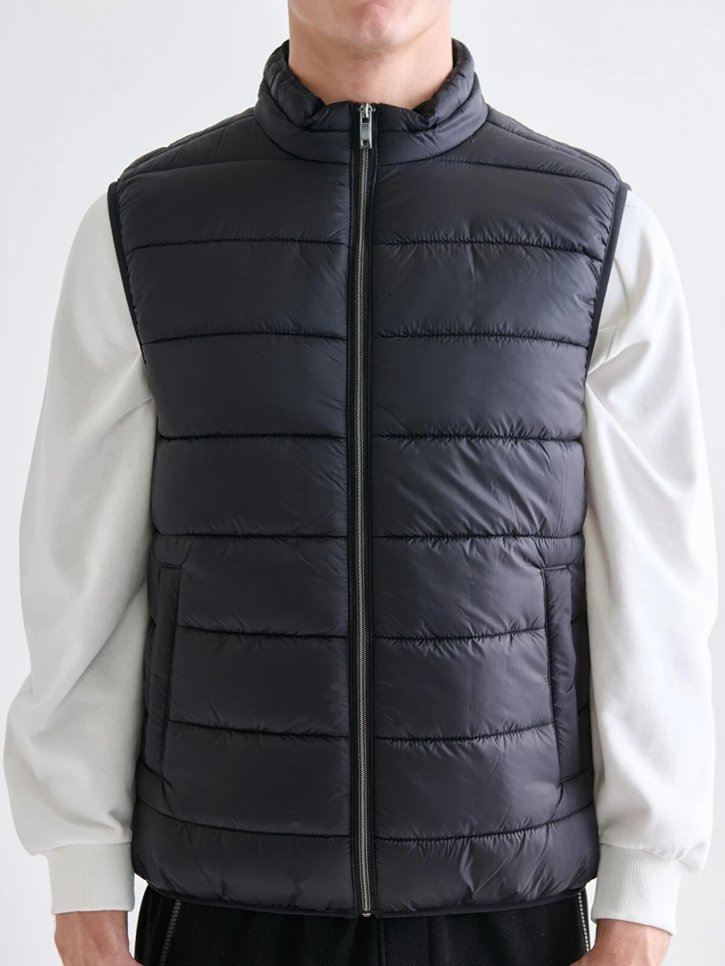 Dik yaka, kolsuz erkek şişme yelek, önden fermuar kapamalıdır ve yanlarda cepleri bulunur. Kapitone desenlidir.