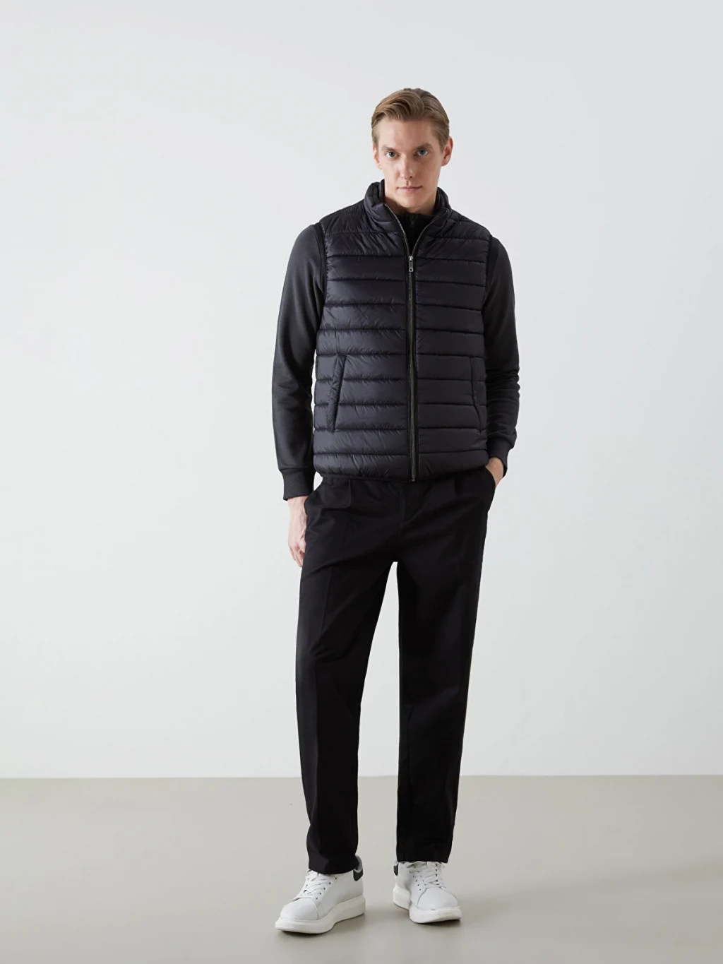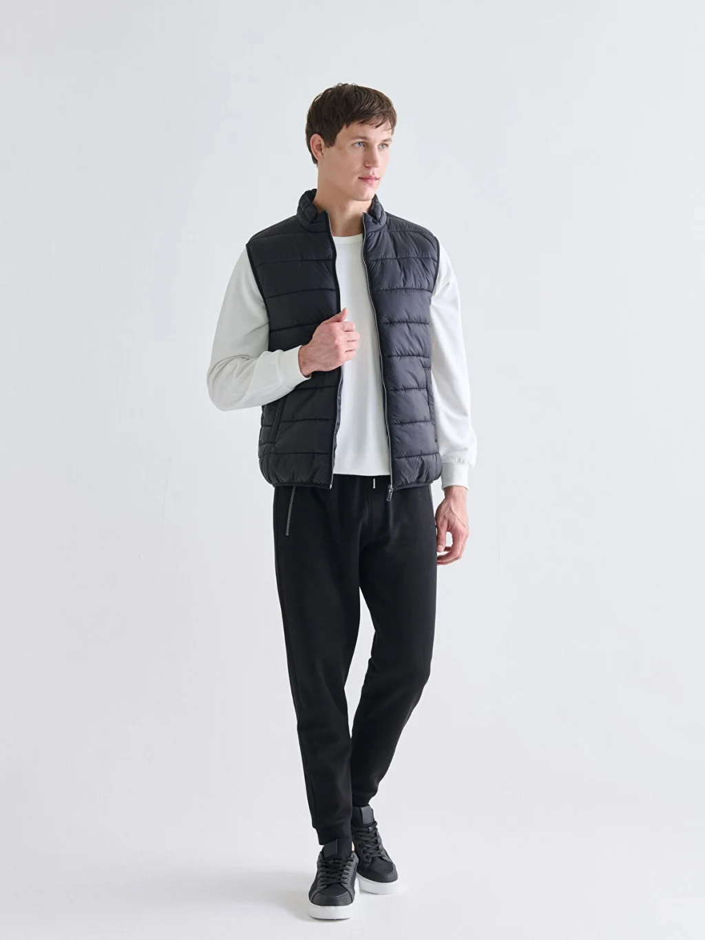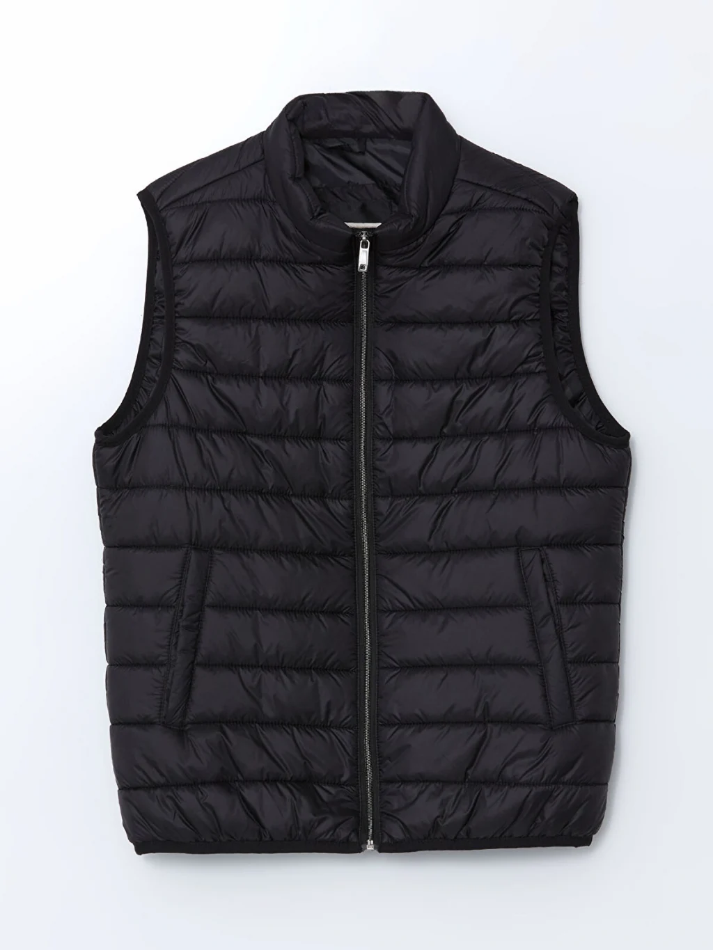 Dik yaka, kolsuz erkek şişme yelek, önden fermuar kapamalıdır ve yanlarda cepleri bulunur. Kapitone desenlidir.