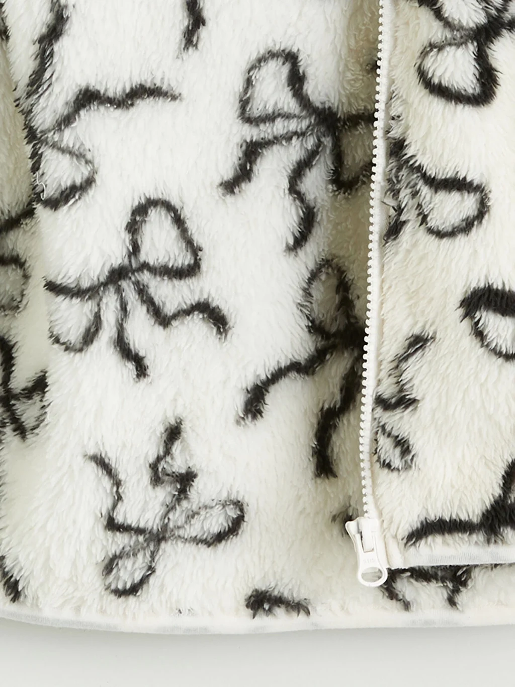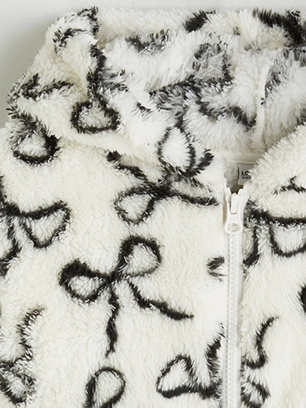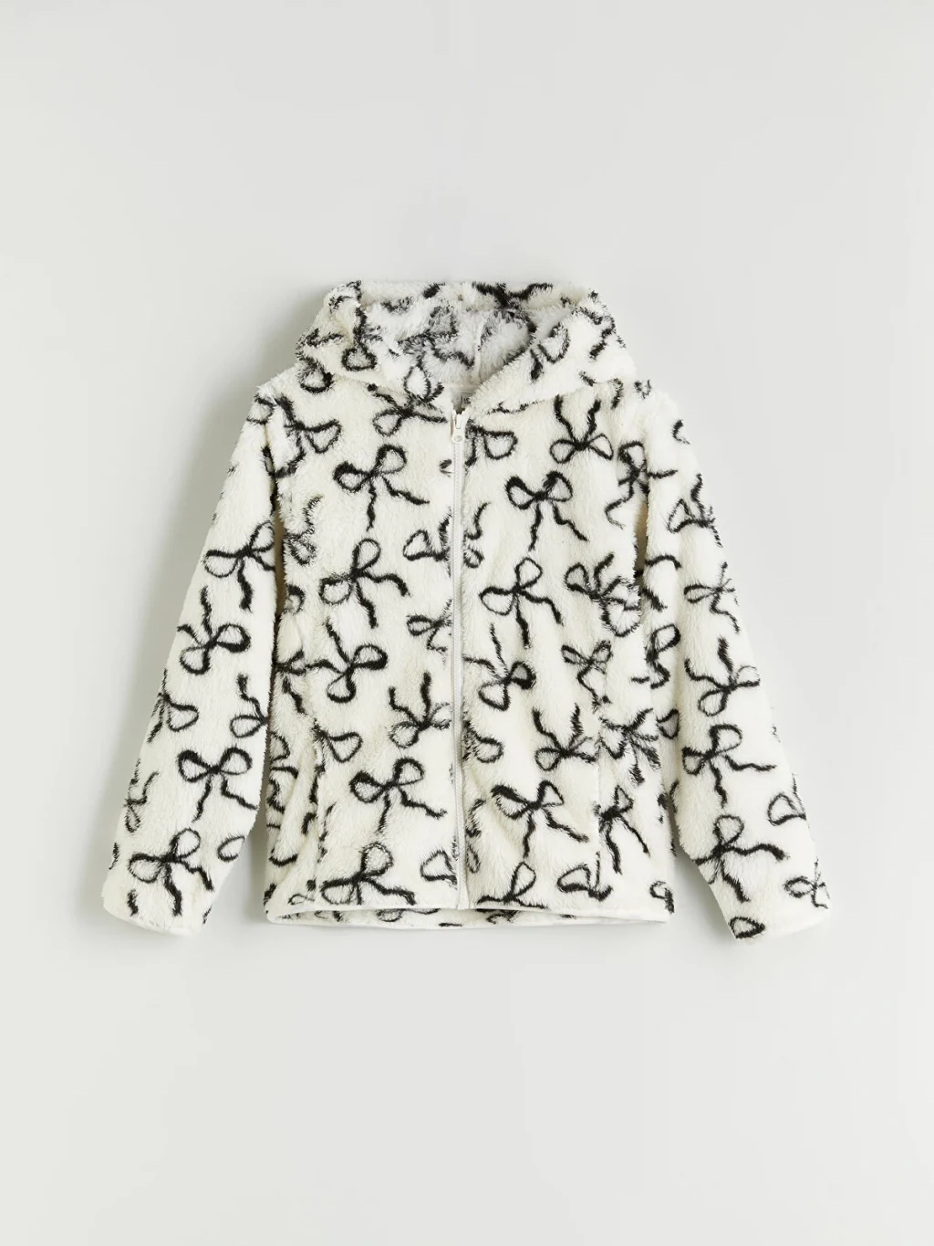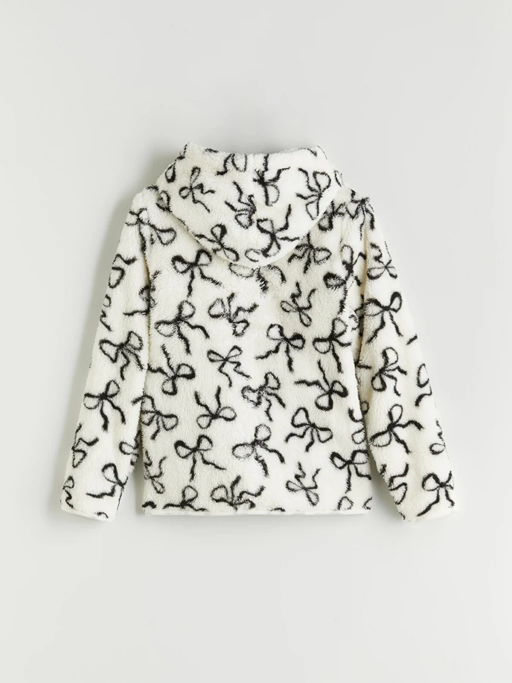 Desenli, kapüşonlu ve uzun kollu kız çocuk sweatshirt, kalın pelüş kumaştan üretilmiştir. Önden fermuar kapamalıdır ve cepleri bulunur.