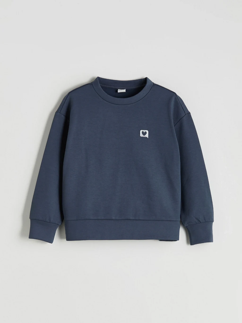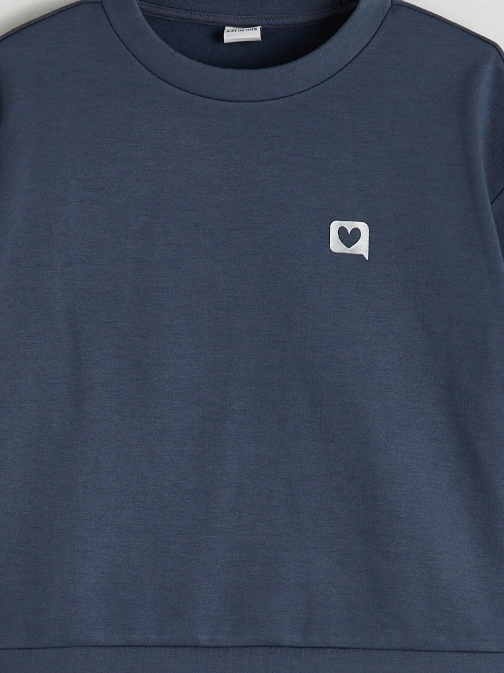Kız çocuk sweatshirt, bisiklet yaka ve uzun kolludur. Önü küçük desenlidir, kol uçları ve etek ucu ribanalıdır.