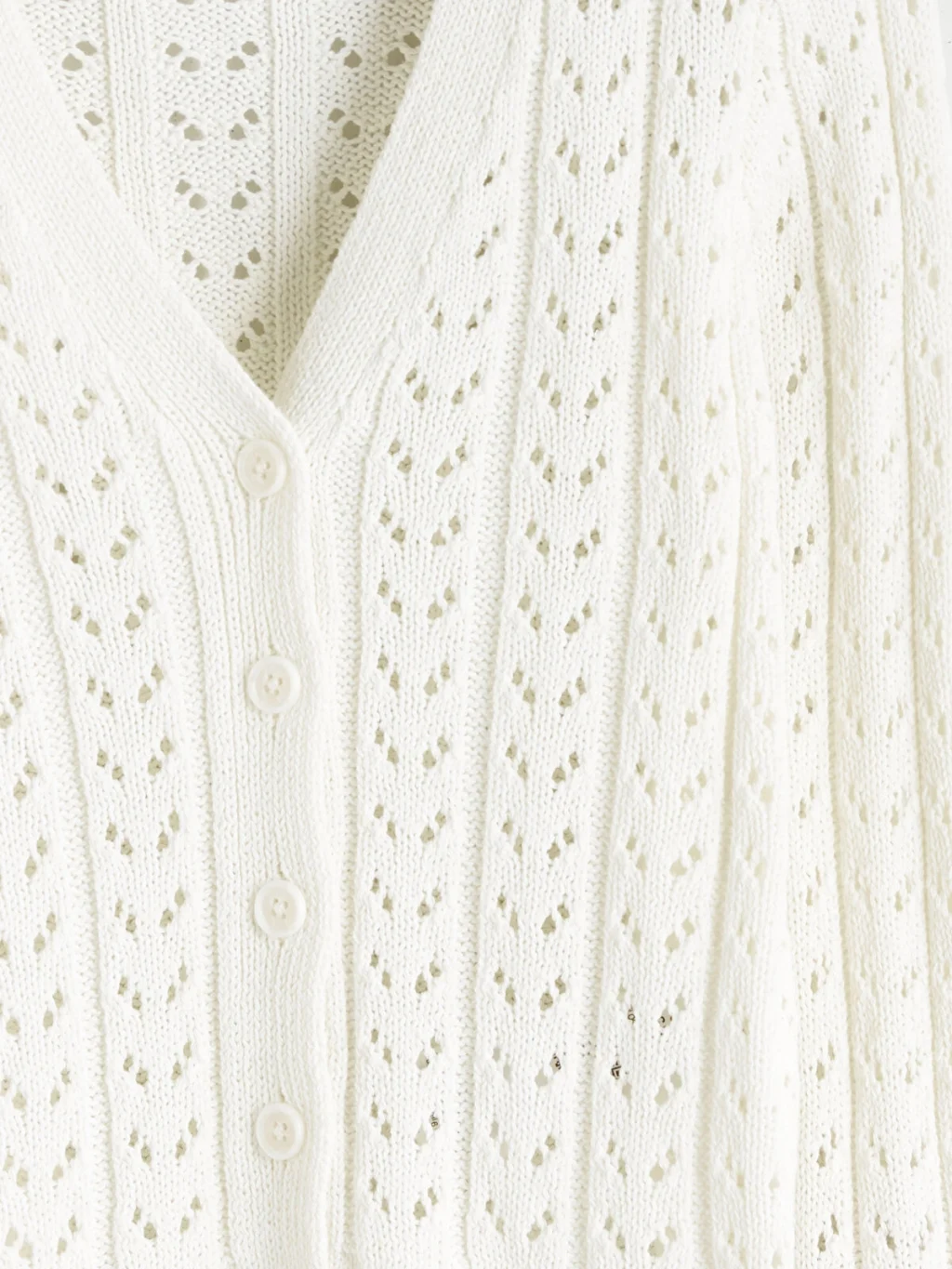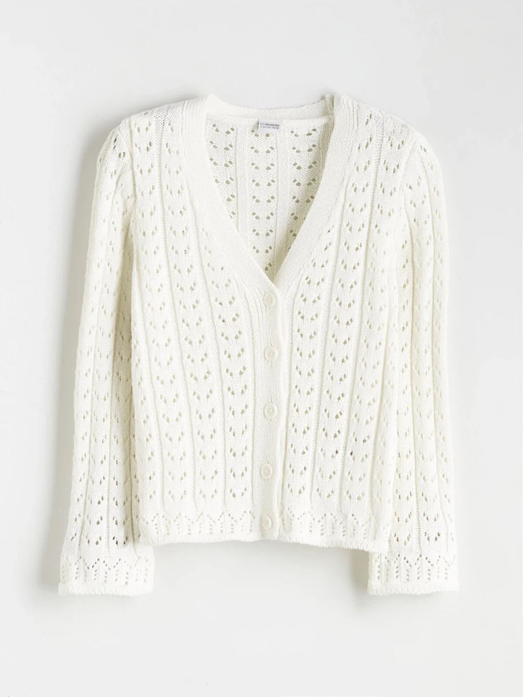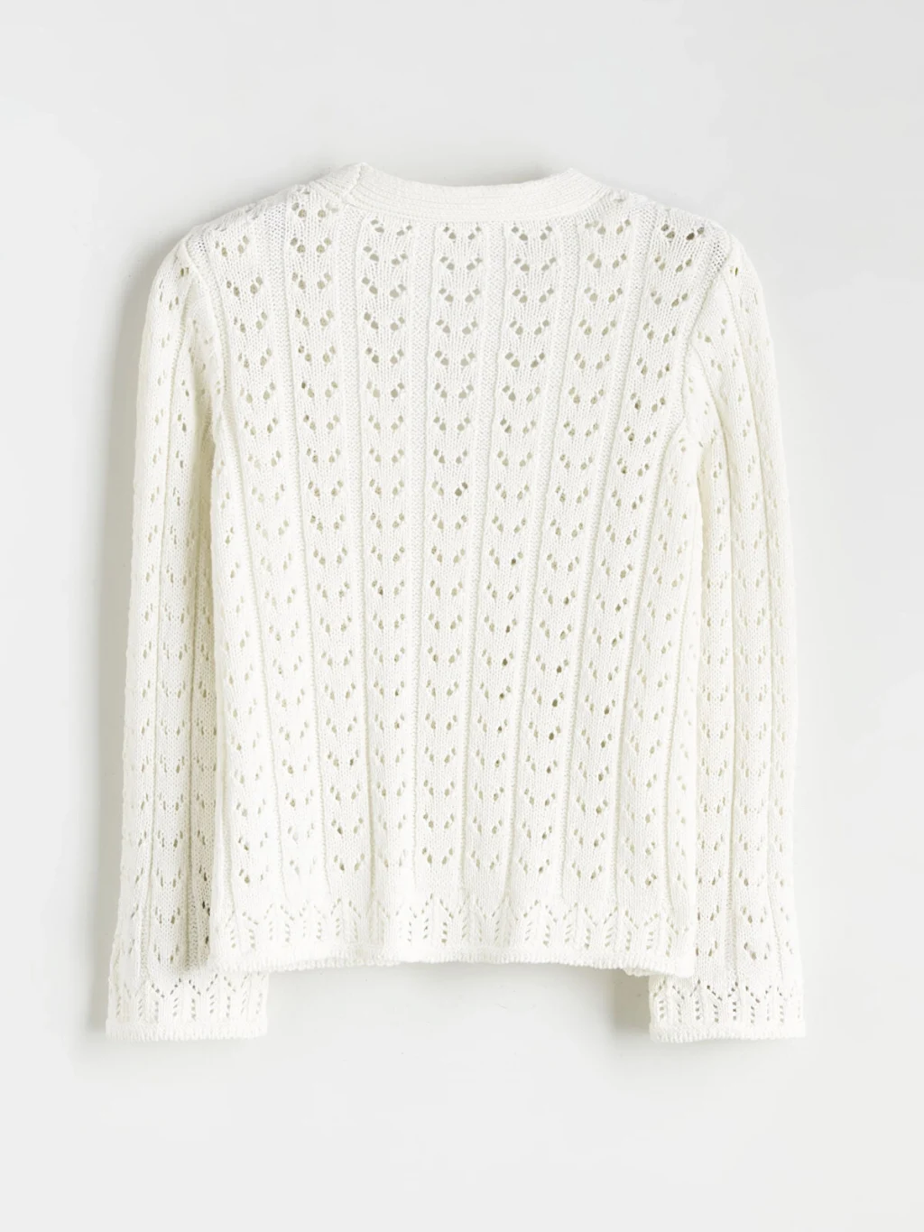 Ajurlu desenli, V yakalı ve uzun kollu kız çocuk hırka, orta kalınlıkta triko kumaştan üretilmiştir. Önden düğme kapamalıdır.