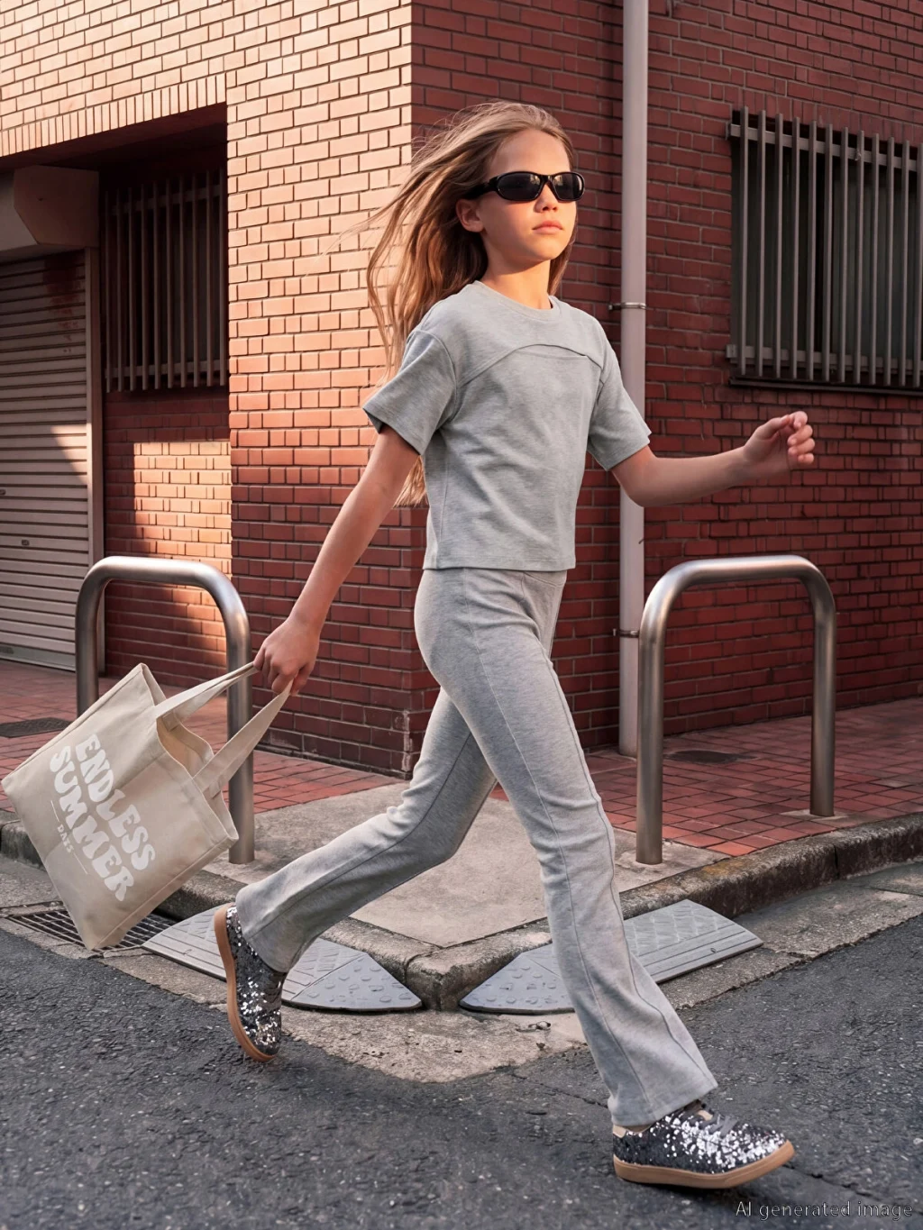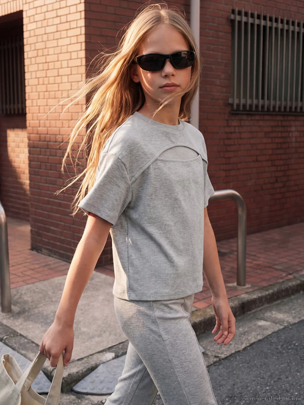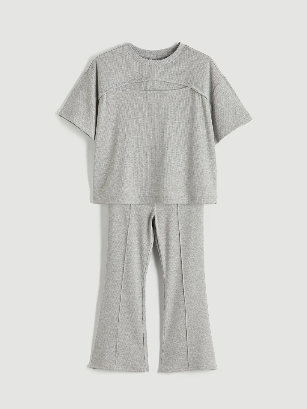 Kız çocuk takım, bisiklet yaka, kısa kollu, önde pencere detaylı tişört ve önü dikişli, ispanyol paça tayttan oluşur. Kaşkorse kumaştan üretilmiştir.