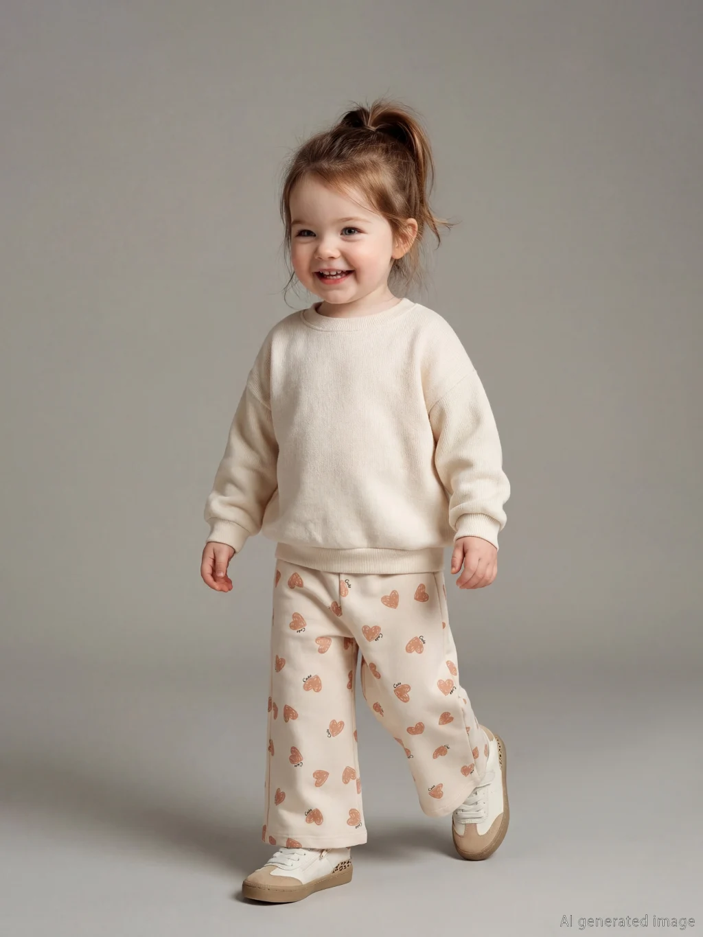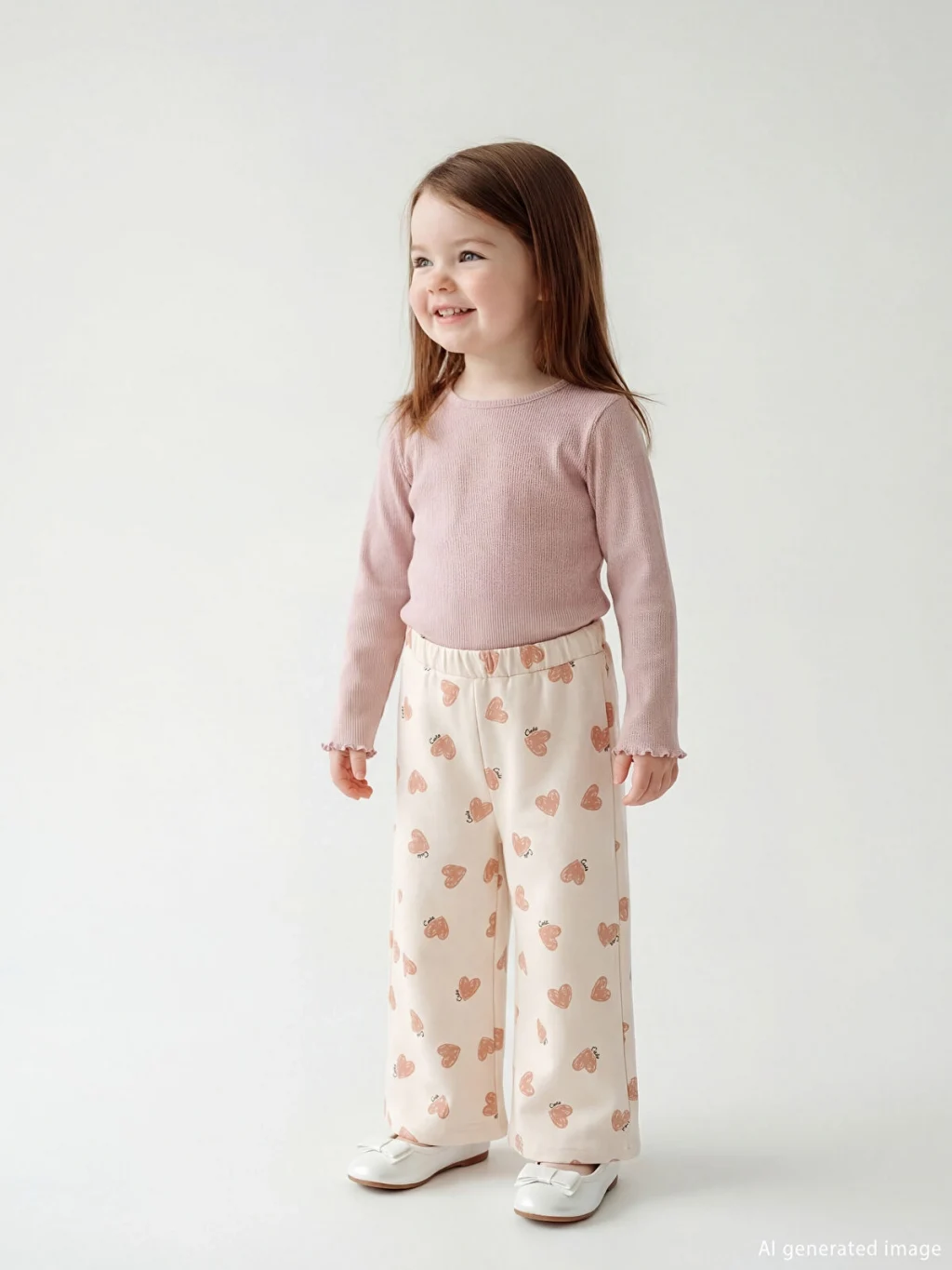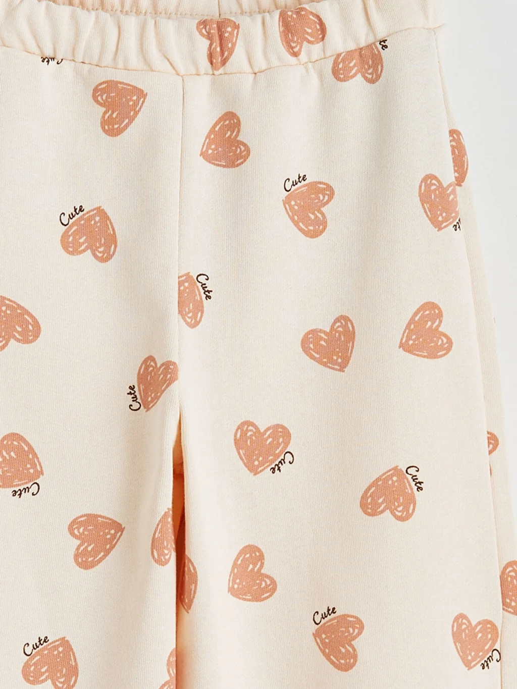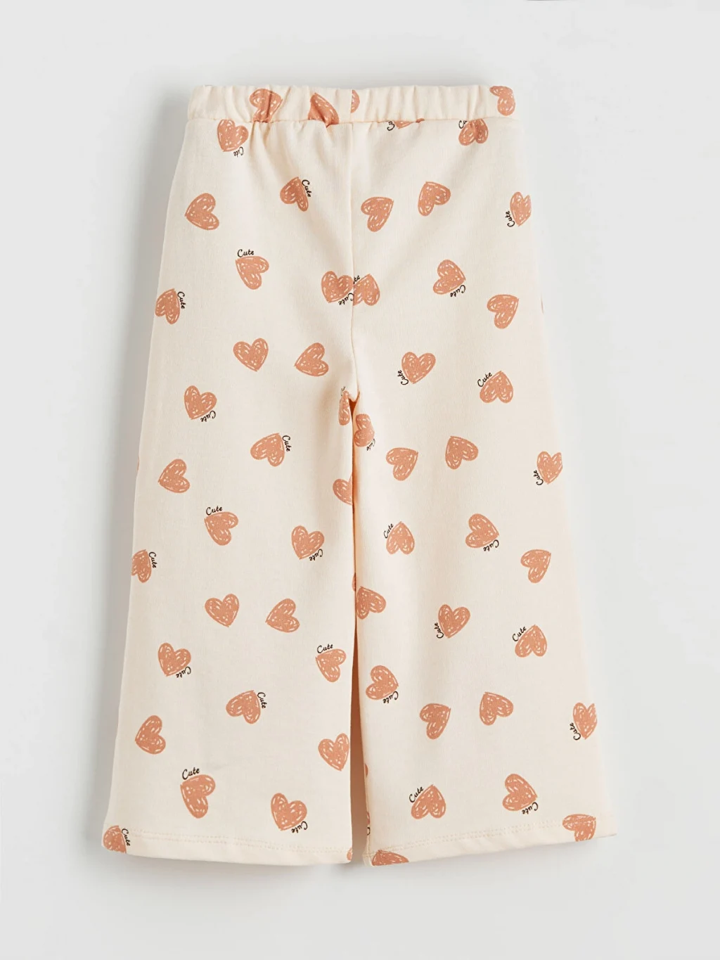 Beli lastikli ve geniş paçalı kız bebek eşofman altı, kalp baskılı 3 iplik kumaştan üretilmiştir ve %100 pamukludur.