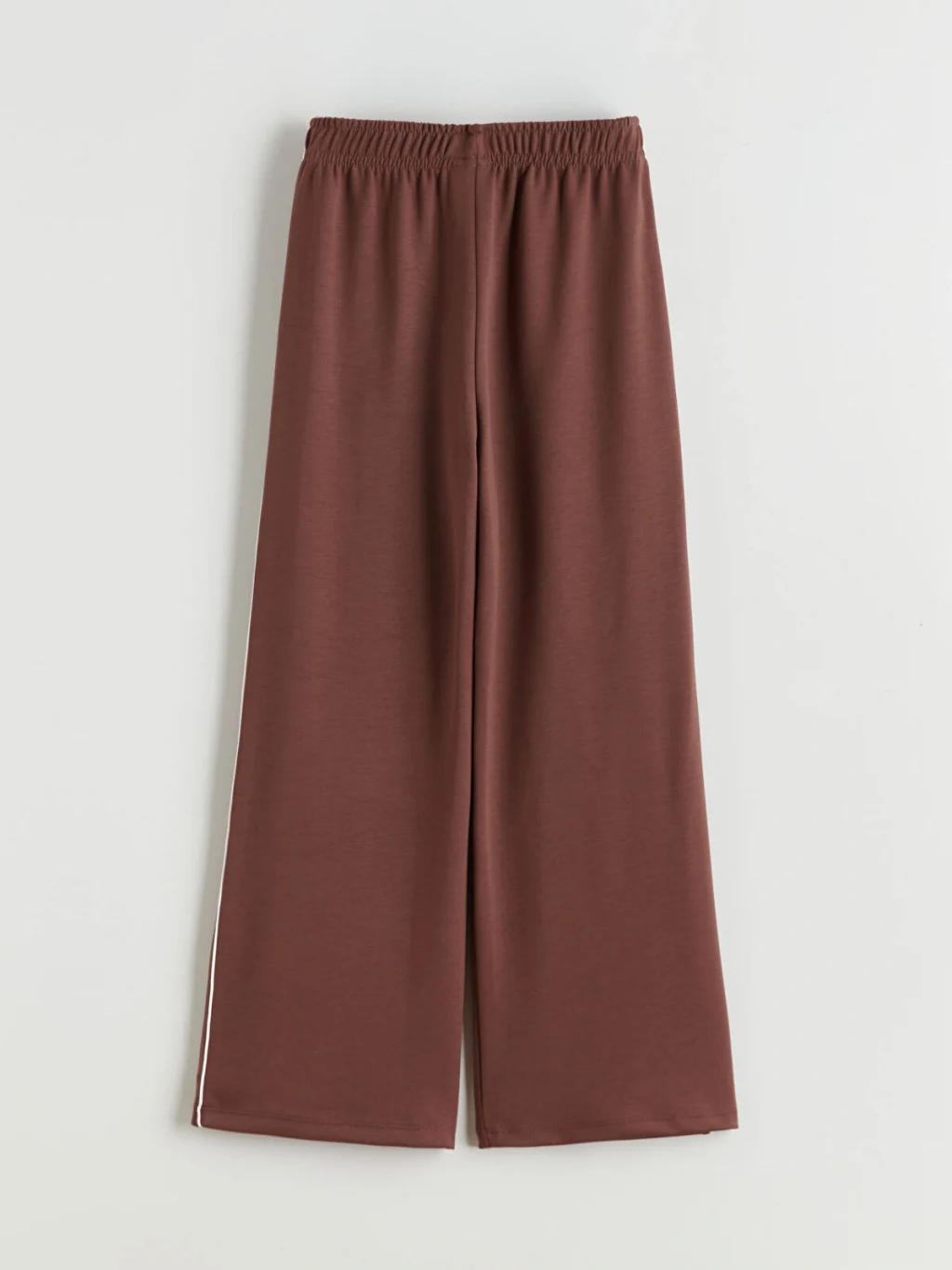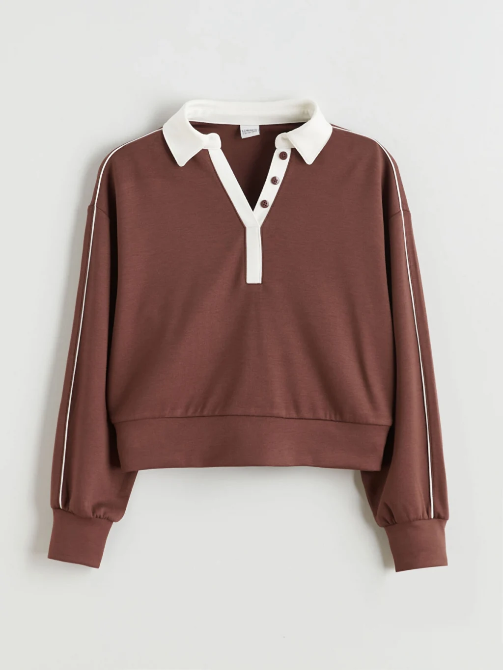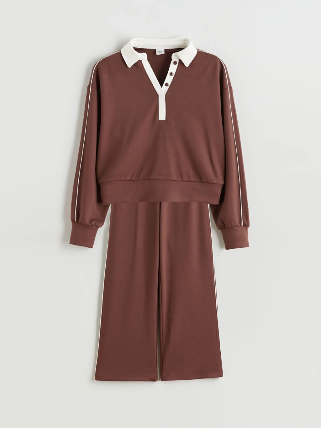 Kız çocuk takım, polo yaka, uzun kollu, düğme kapamalı sweatshirt ve geniş paçalı pantolondan oluşur. Kollarda ve paçalarda şerit detayı bulunur.