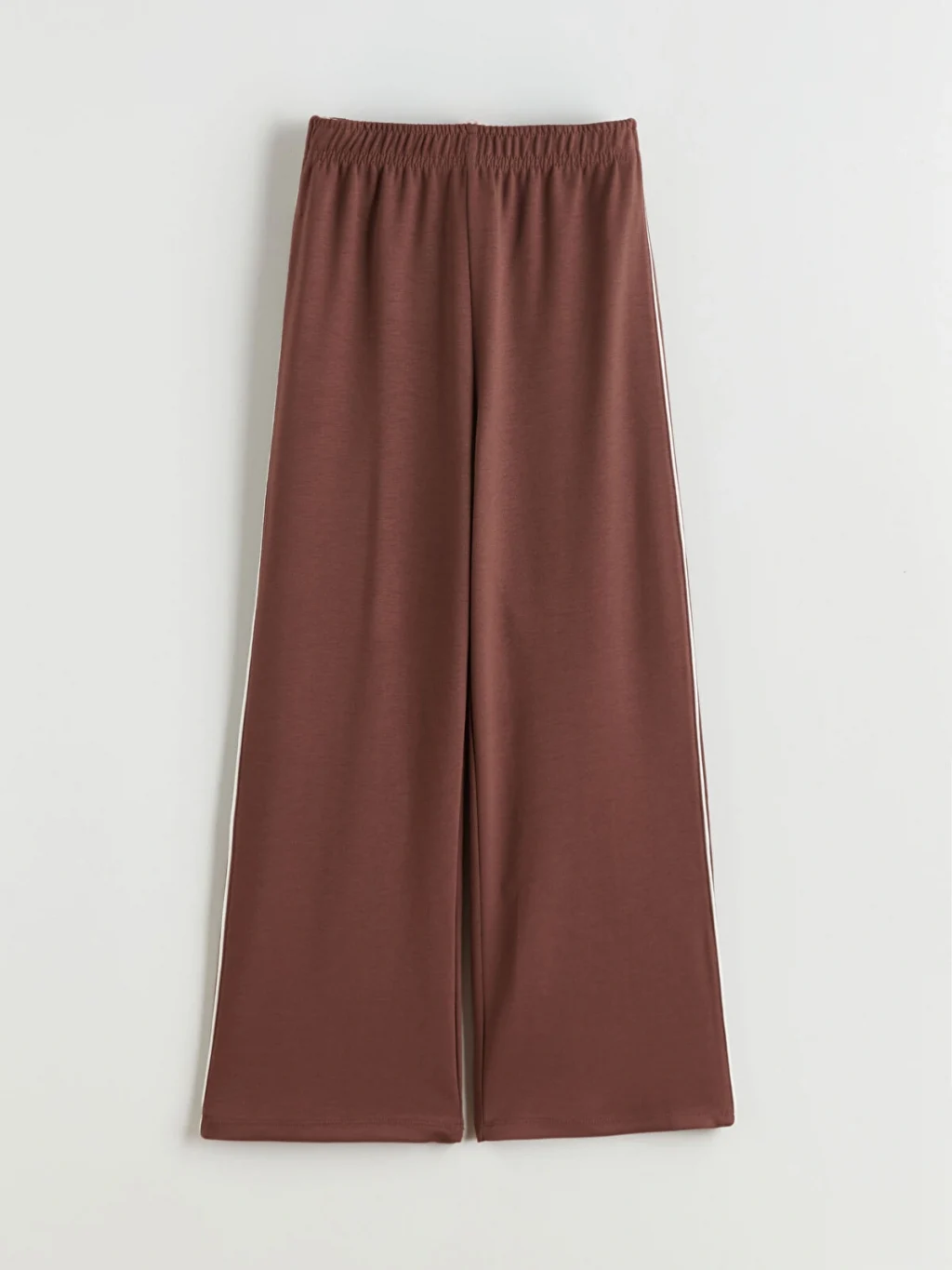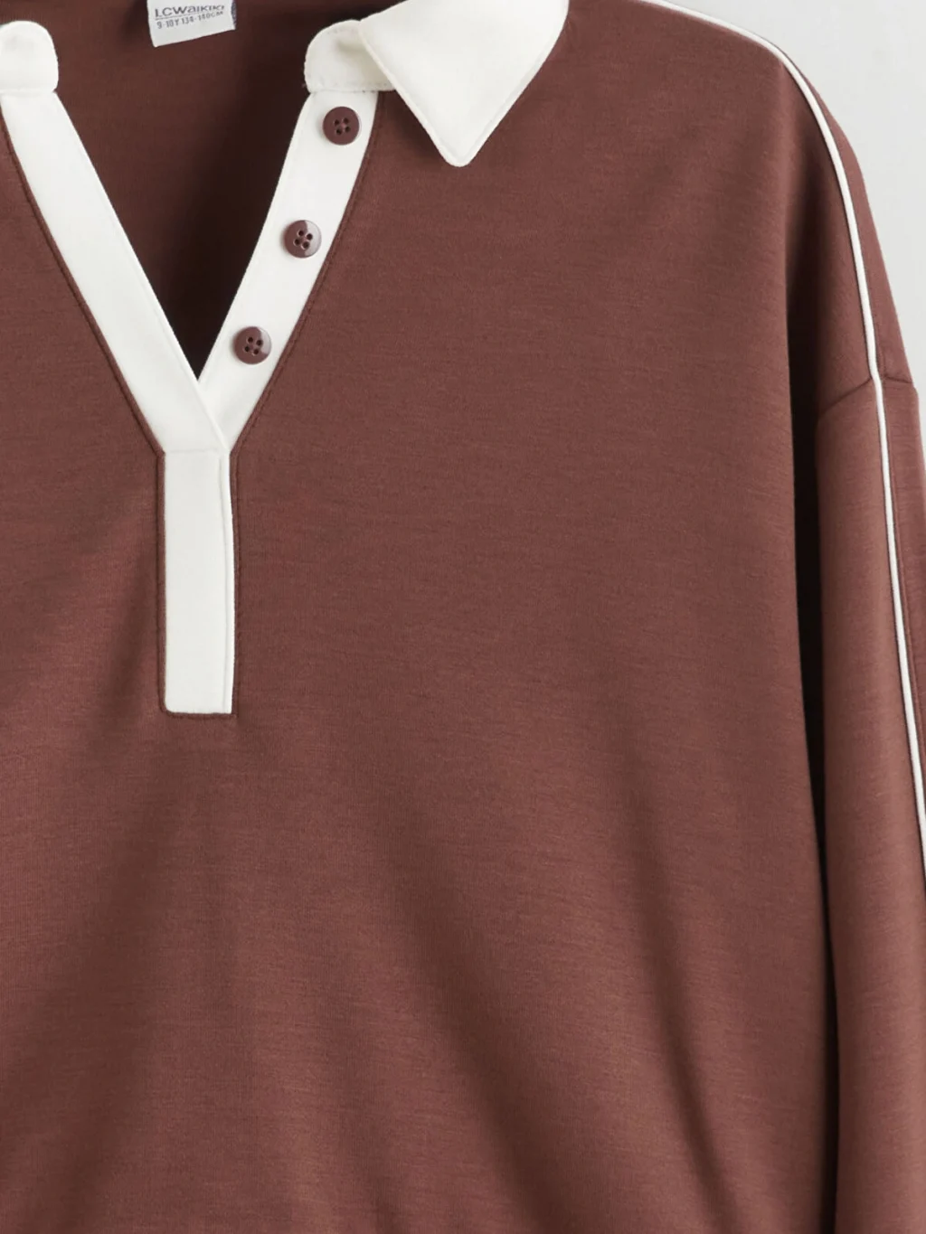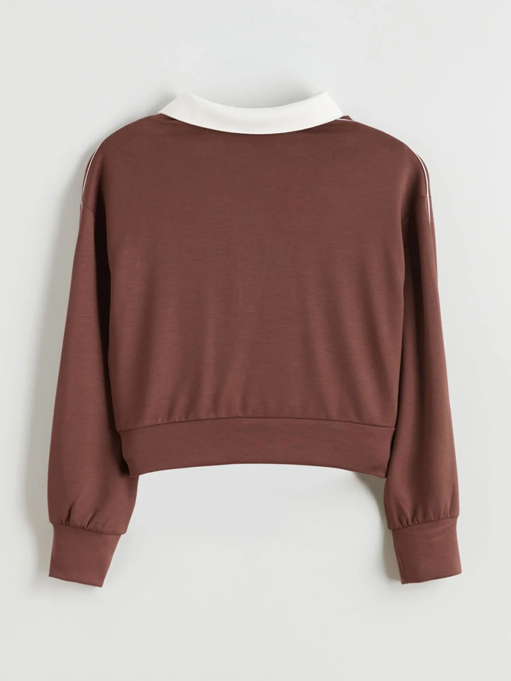Kız çocuk takım, polo yaka, uzun kollu, düğme kapamalı sweatshirt ve geniş paçalı pantolondan oluşur. Kollarda ve paçalarda şerit detayı bulunur.