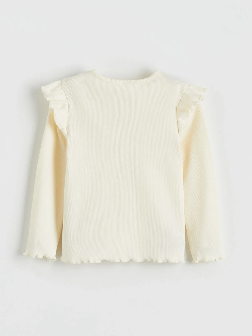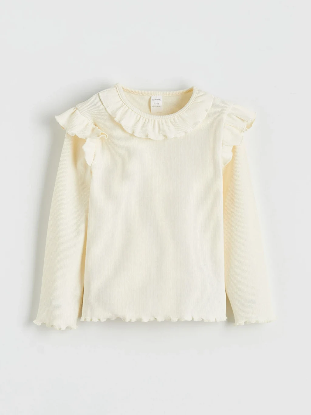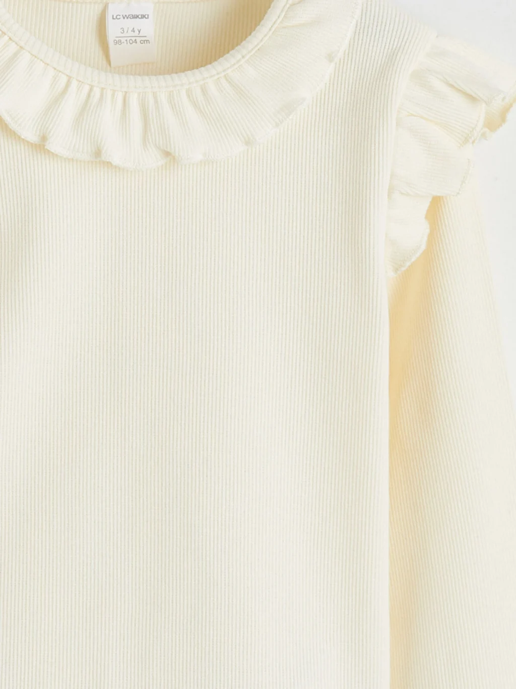 Yüksek pamuk içerikli kumaştan üretilen kız bebek tişört, uzun kollu ve bisiklet yakalıdır. Yaka ve omuzları fırfır detaylıdır.