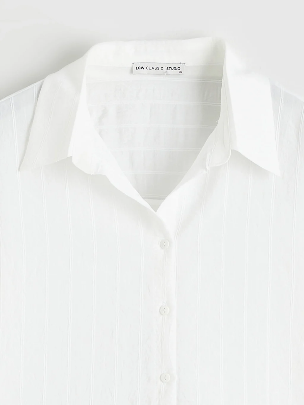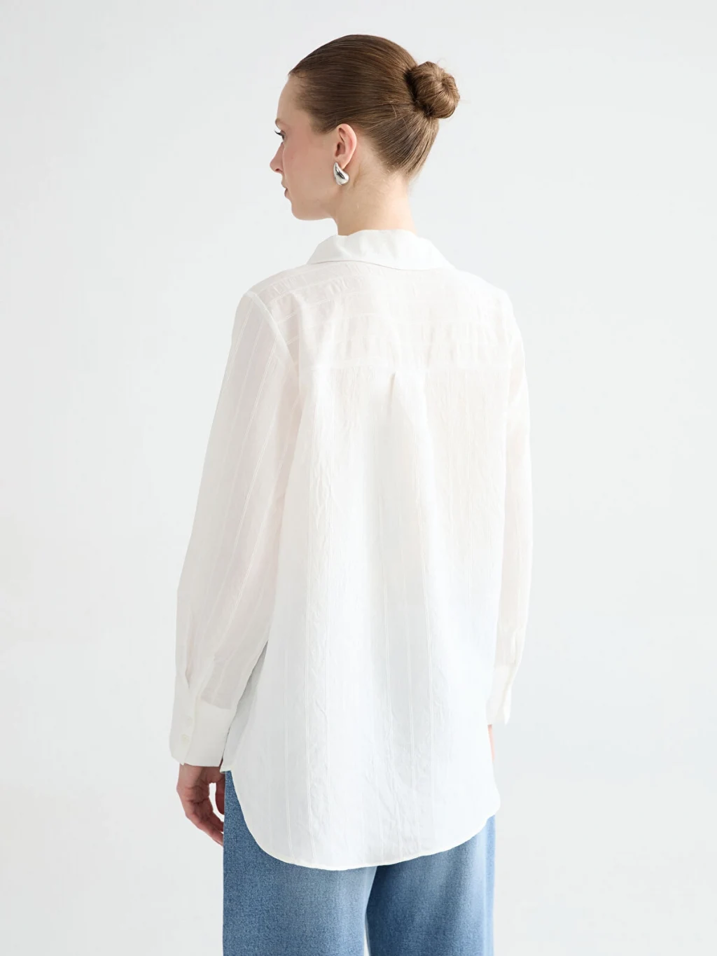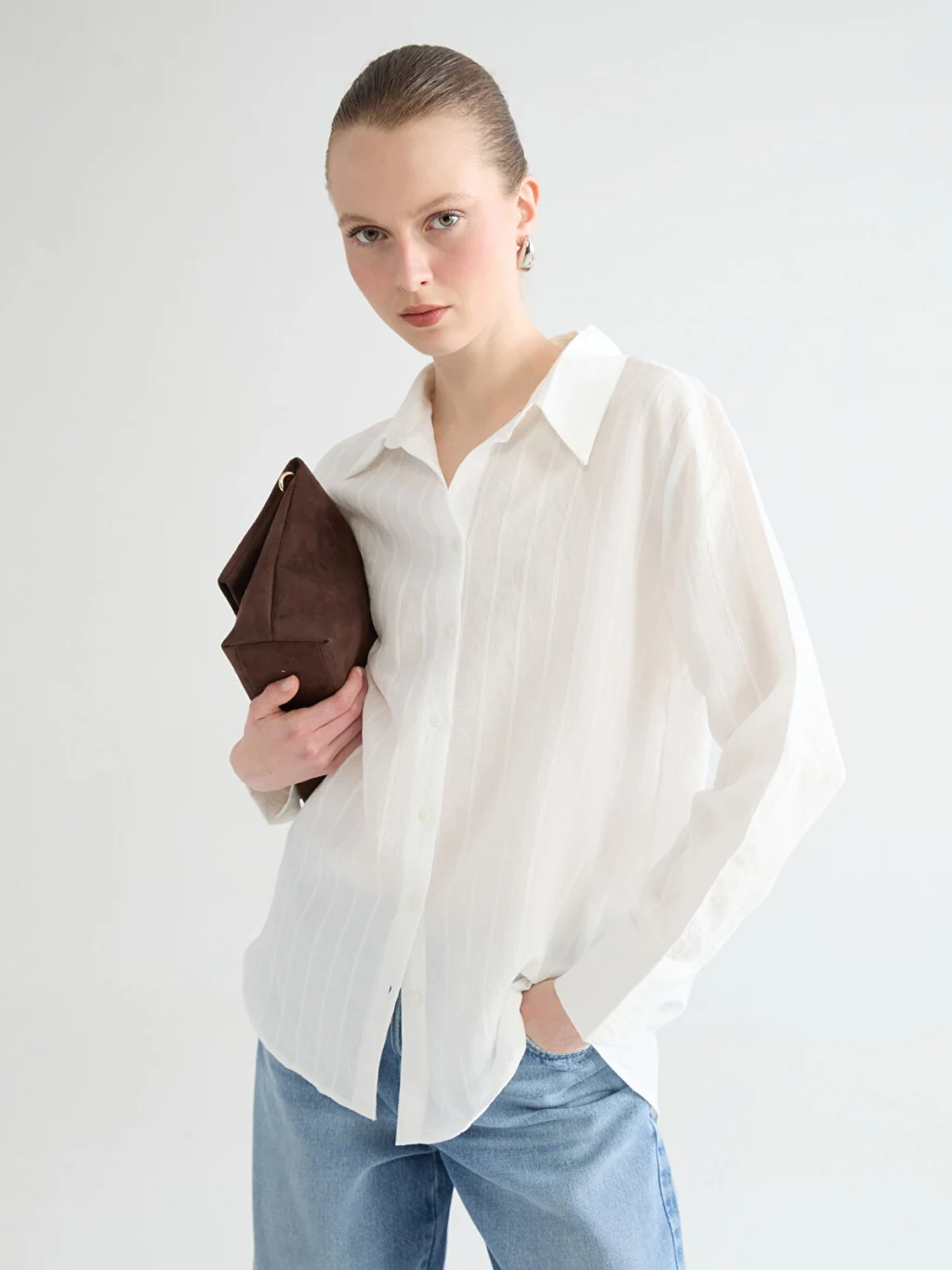 Uzun kollu, çizgili kadın gömlek. Düğme kapamalıdır, manşetli kollara ve oval kesim etek ucuna sahiptir.