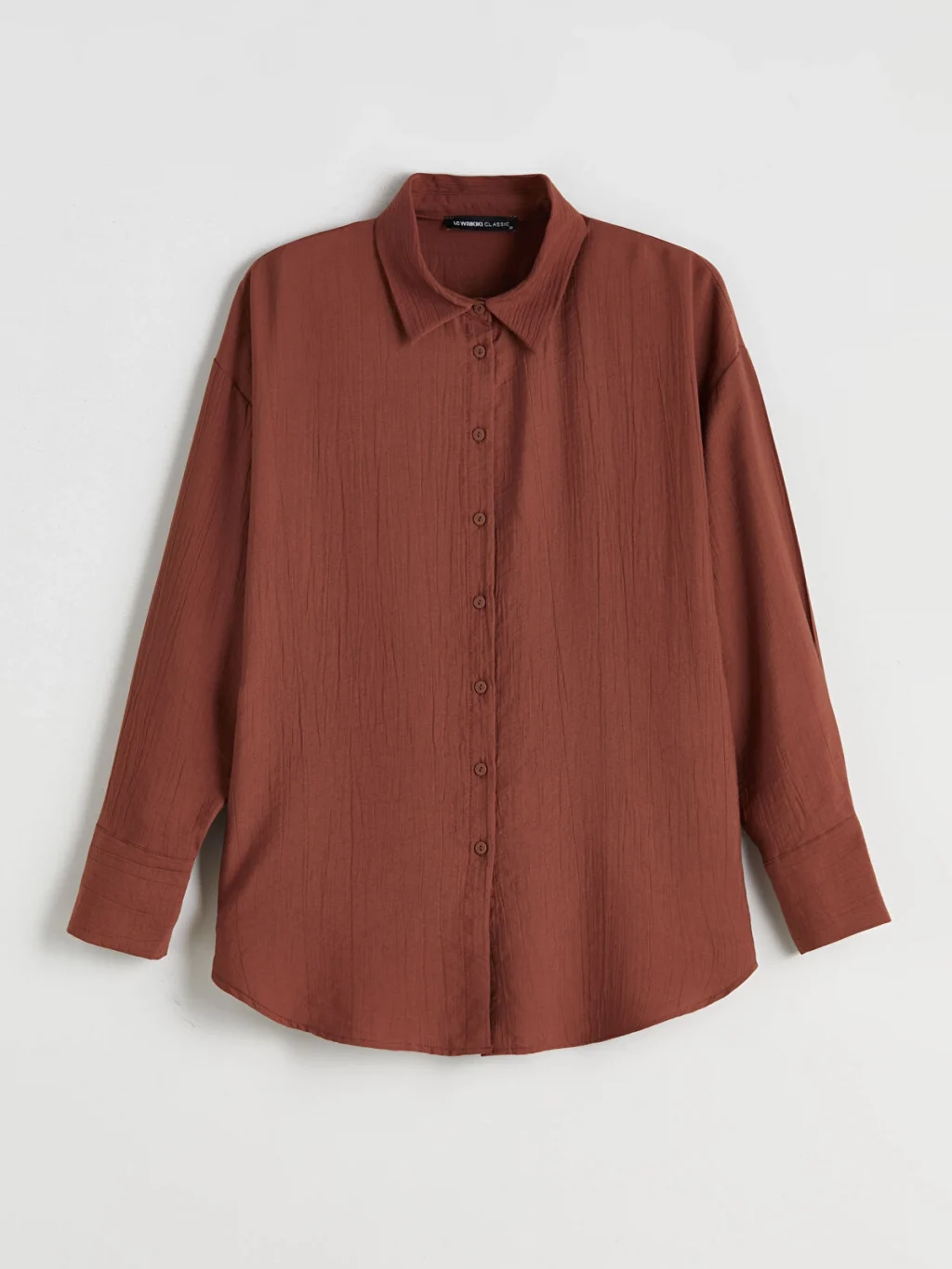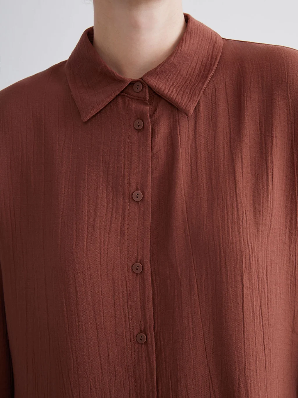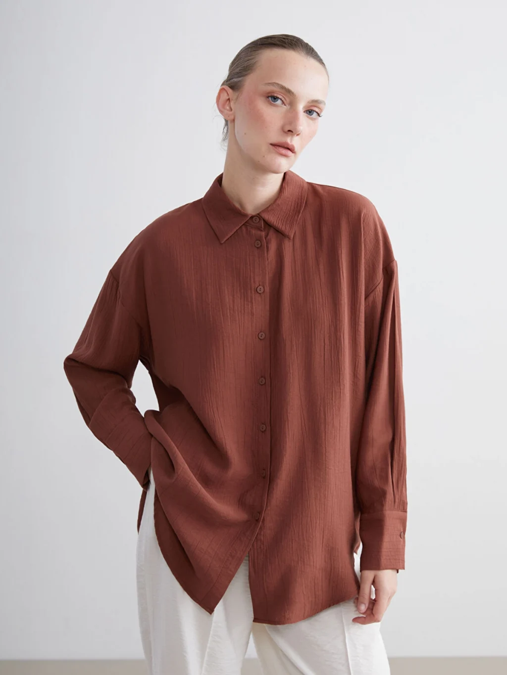 Dokulu kadın gömlek, krinkle kumaştan üretilmiştir. Uzun kollu ve düğme kapamalı tasarıma sahiptir.