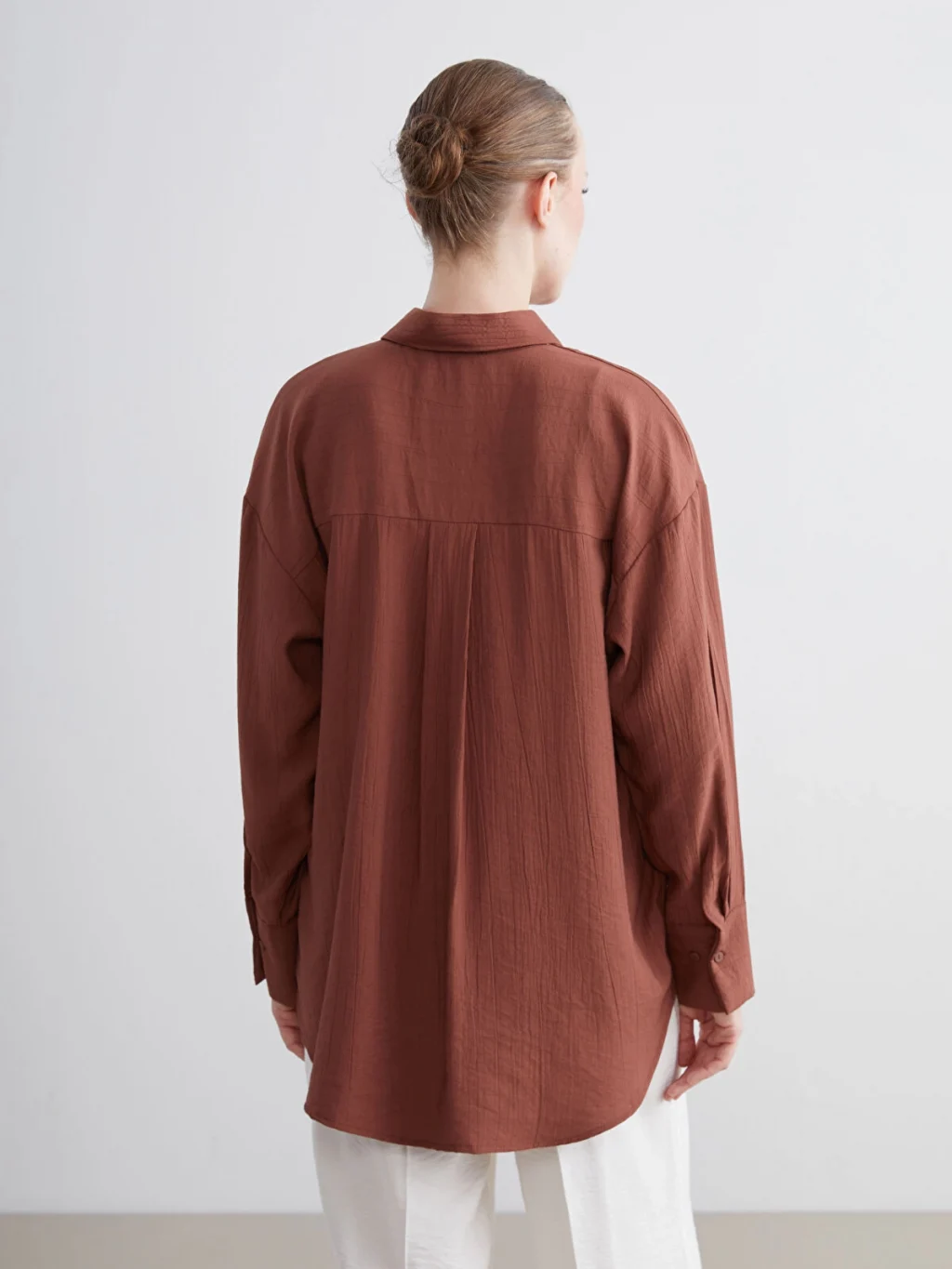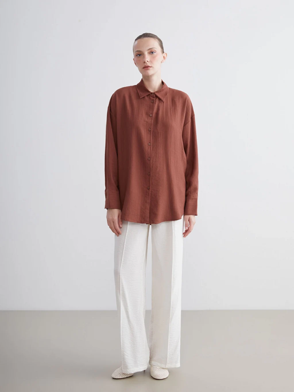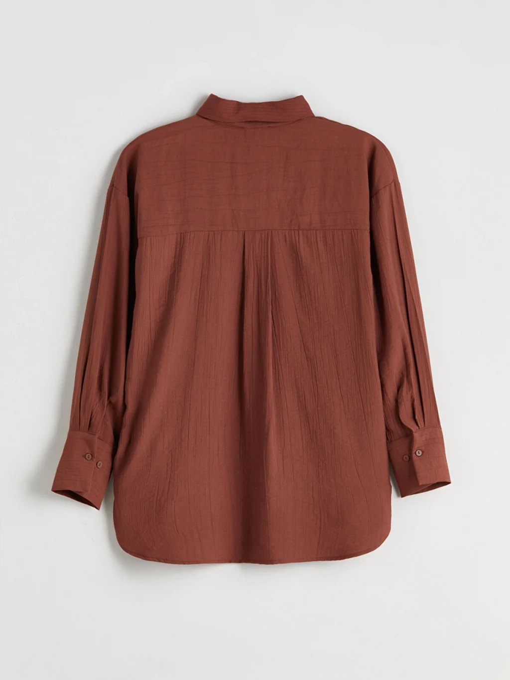 Dokulu kadın gömlek, krinkle kumaştan üretilmiştir. Uzun kollu ve düğme kapamalı tasarıma sahiptir.
