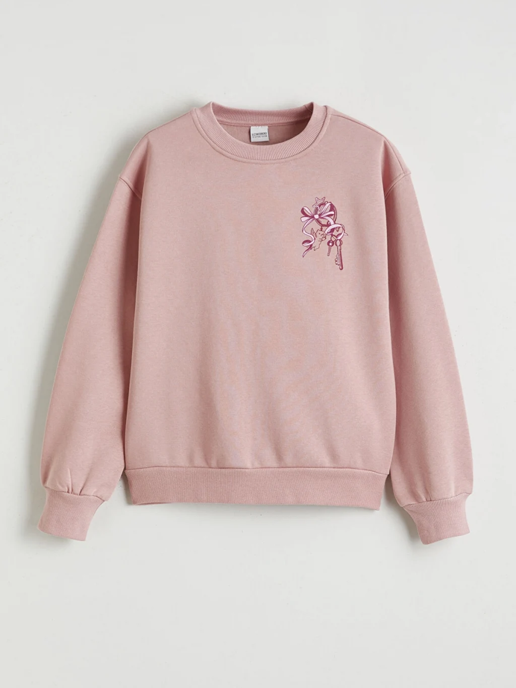 Bisiklet yaka ve uzun kollu kız çocuk sweatshirt, 3 iplik şardonlu kalın kumaştan üretilmiştir. Kol ve etek uçları ribanalıdır.